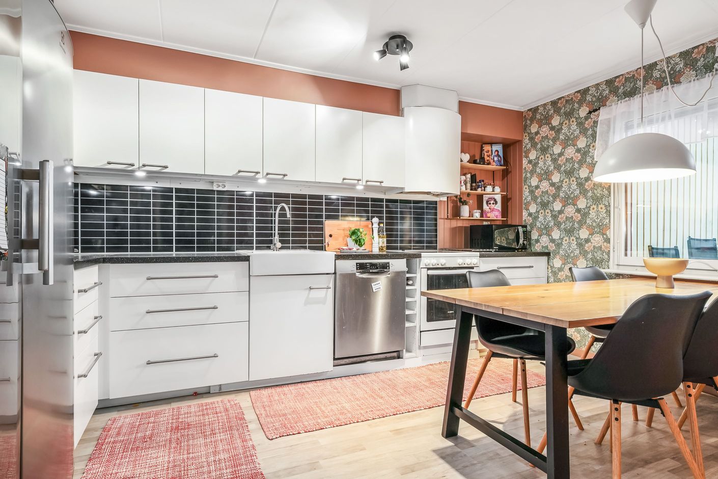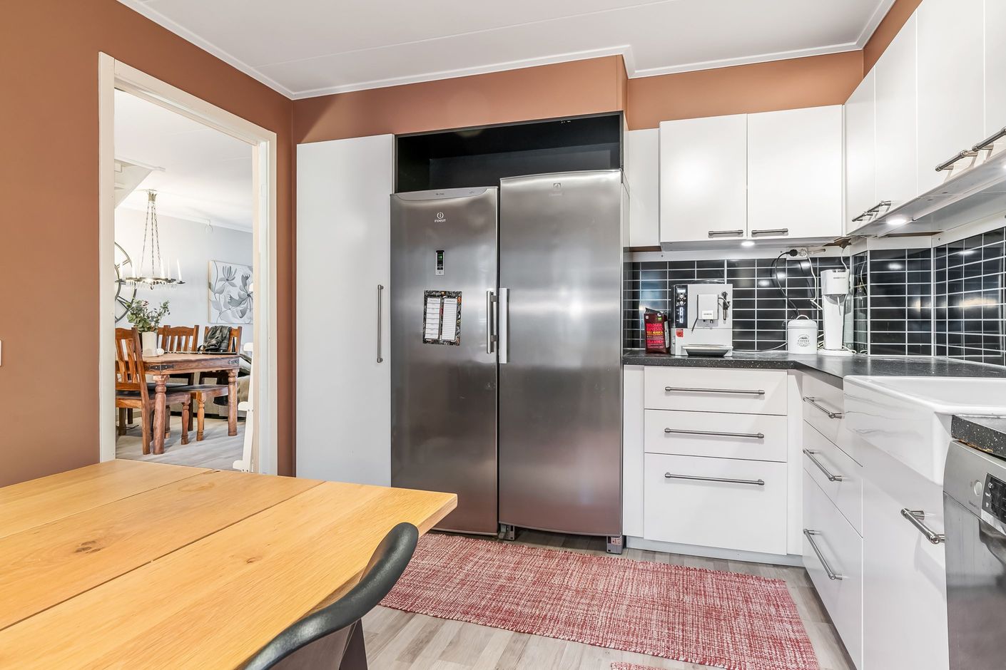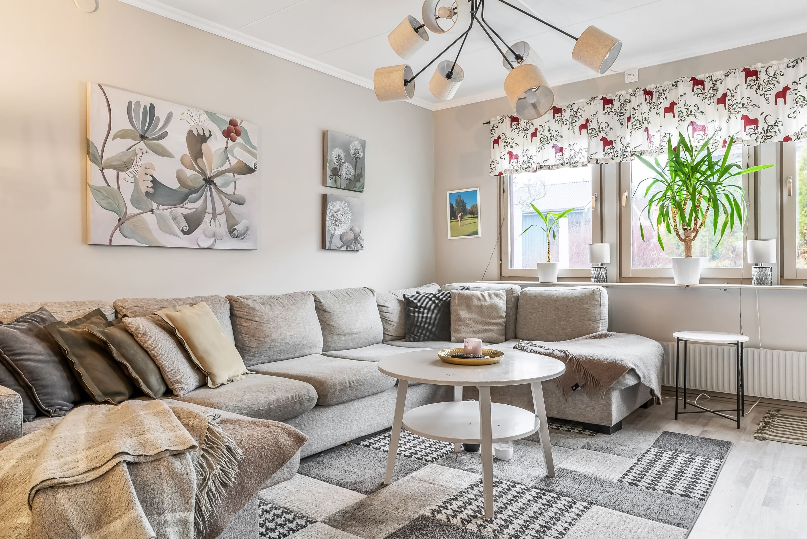Invändigt möts du av generösa ytor, med uppdaterade ytskikt såsom två kaklade badrum, nyare kök, målade väggar och ny el i hela huset. Ett hem som är lätt att trivas i och "bara bo". Garage finns för en bil, goda förvaringsmöjligheter och indragen fiber bidrar till en smidig och modern vardag.