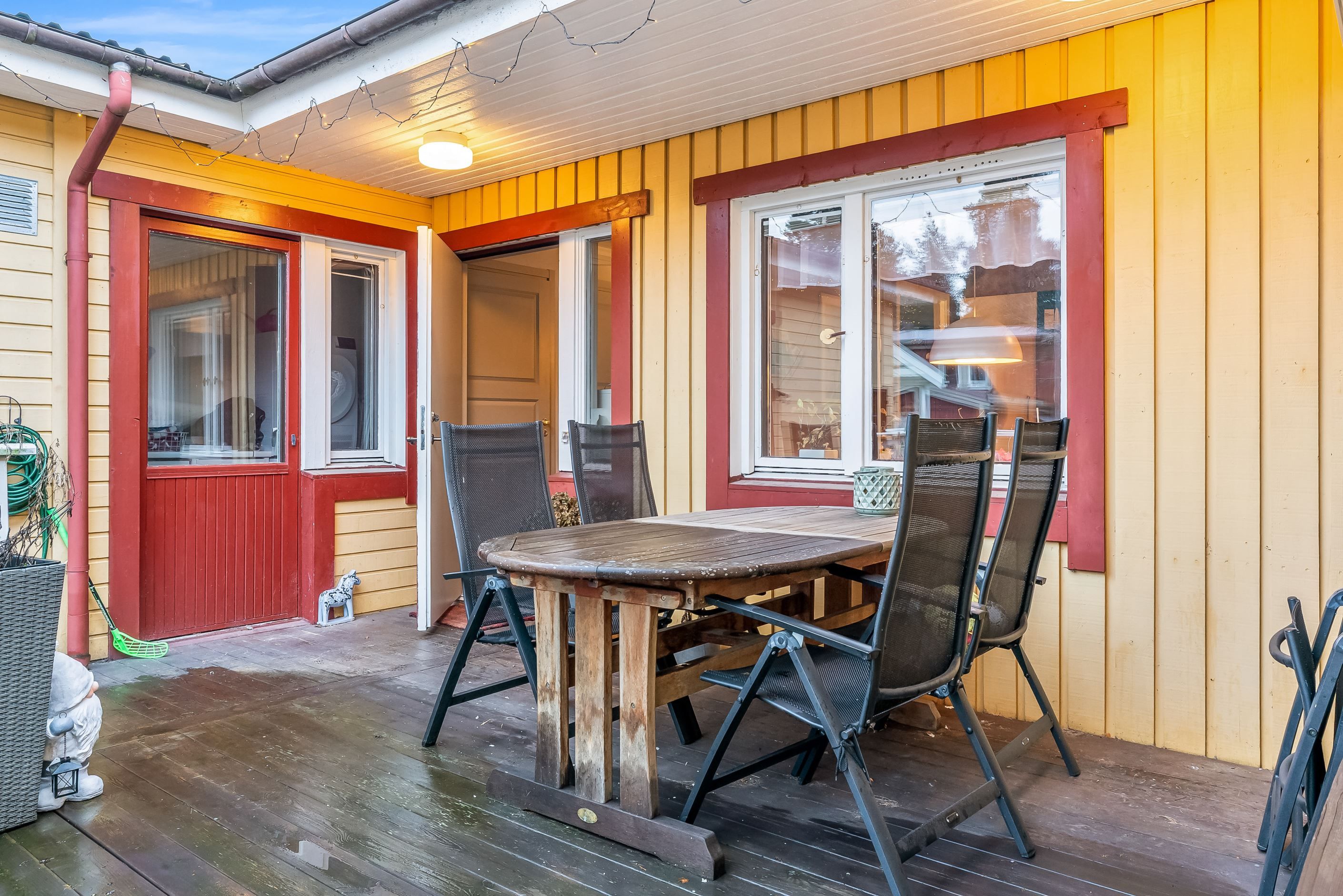 Den lättskötta trädgården bjuder på en gräsmatta och två uteplatser i två olika väderstreck där du kan njuta av dagens alla ljusa timmar.
