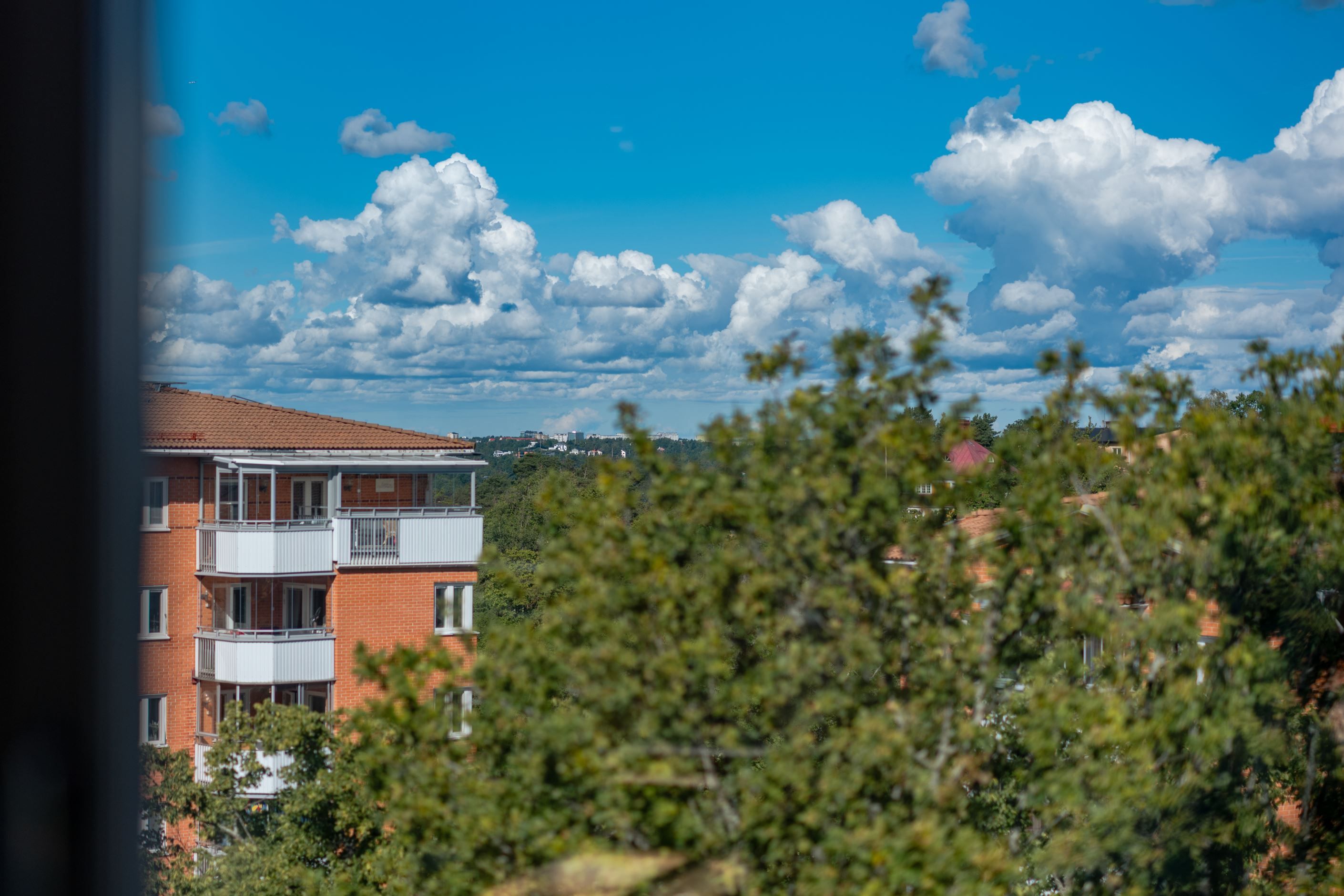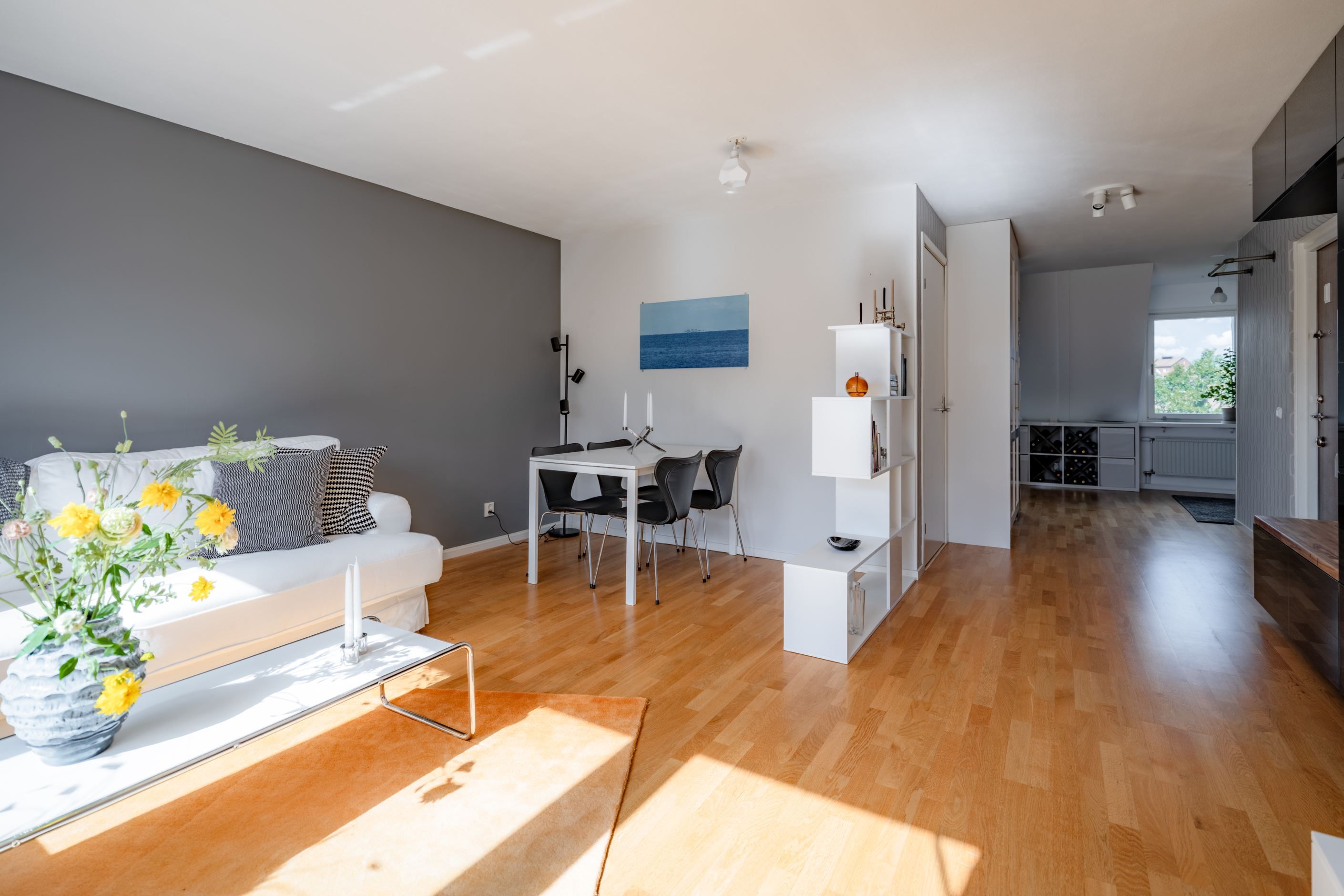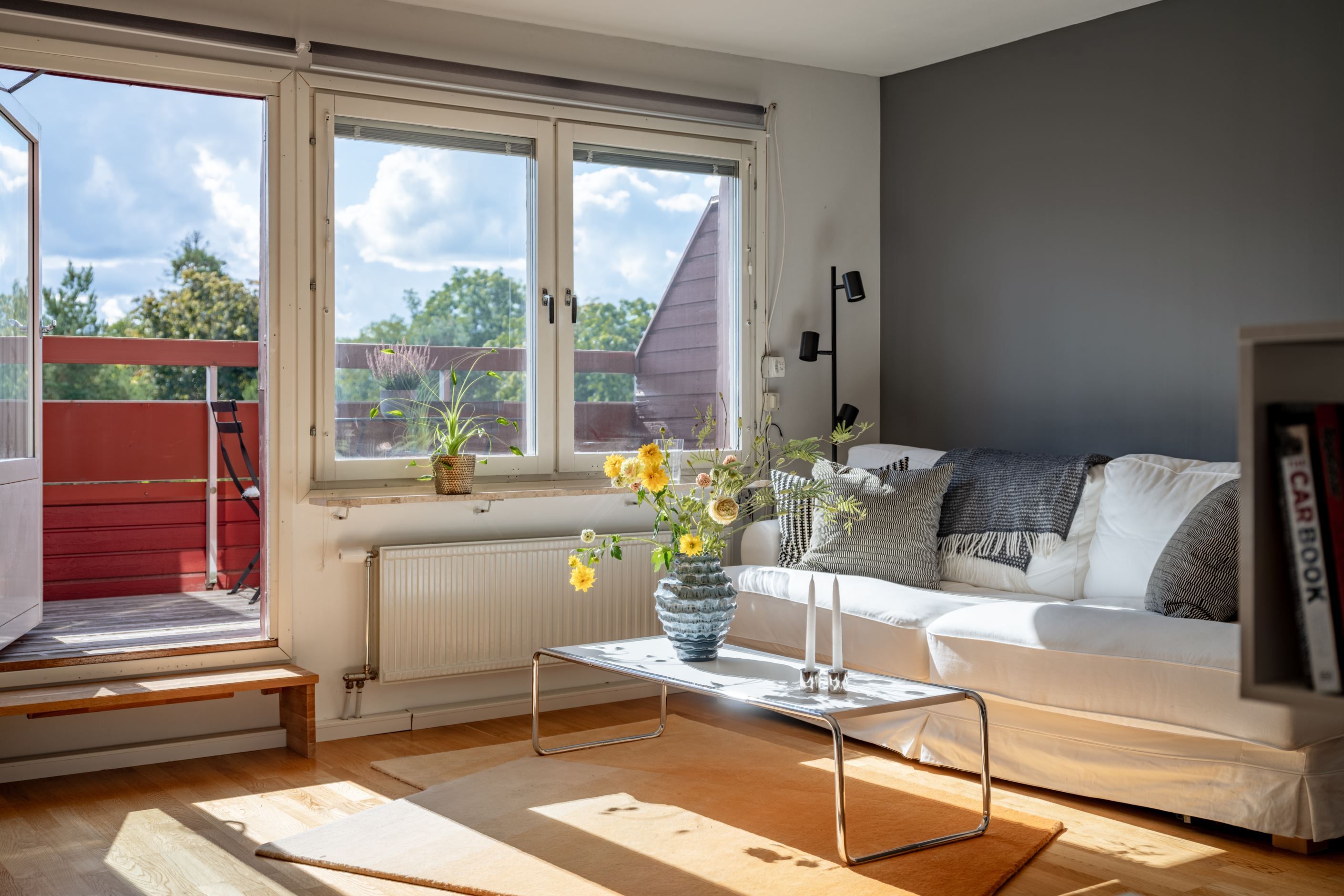 Välkommen till en ljus och stilfull genomgångslägenhet allra högst upp i huset i populära Herserud. Här bor du insynsskyddat med en solig balkong som bjuder på både glimtar av vattnet och en vacker vy över staden – den perfekta platsen för avkoppling.