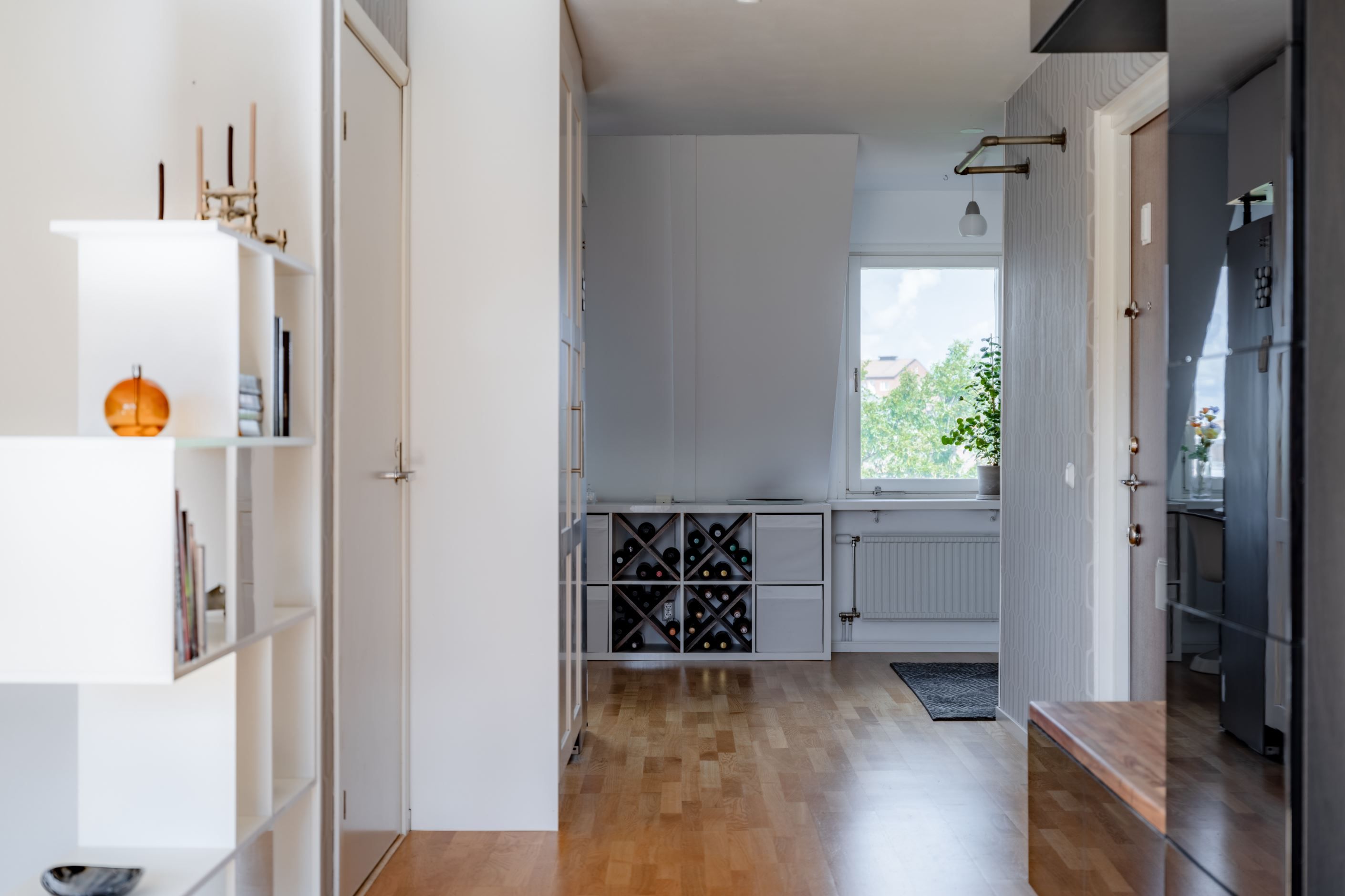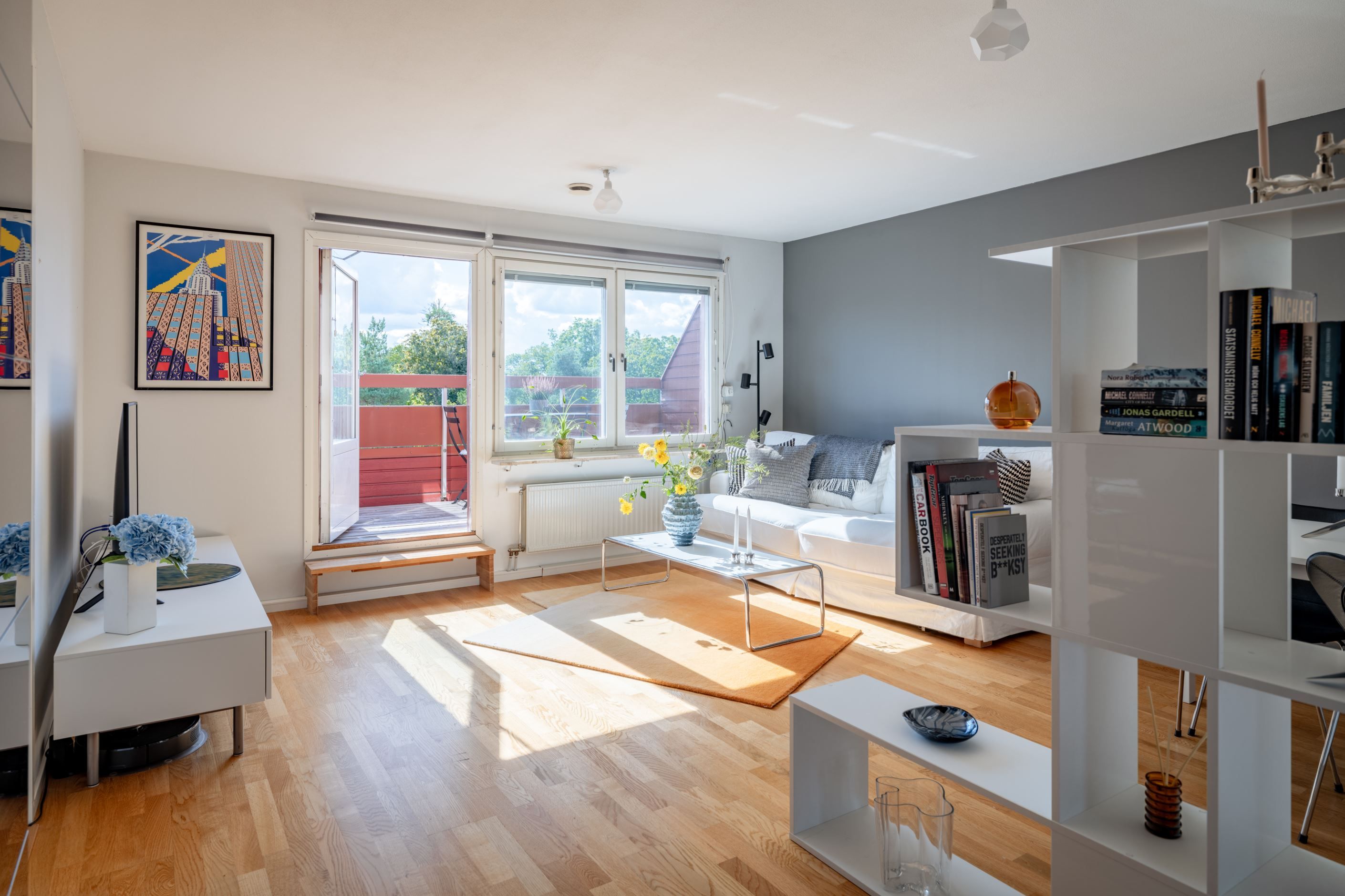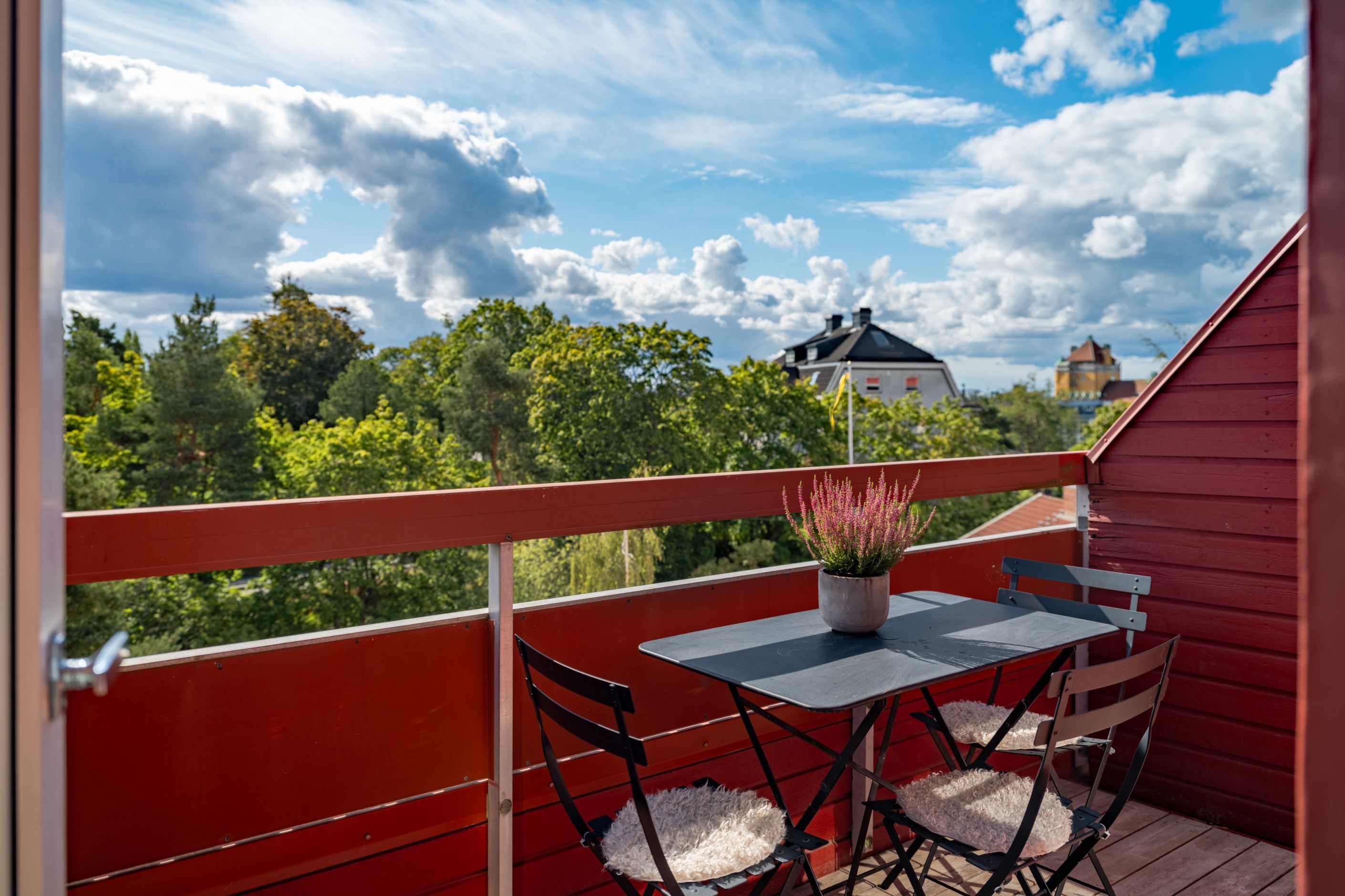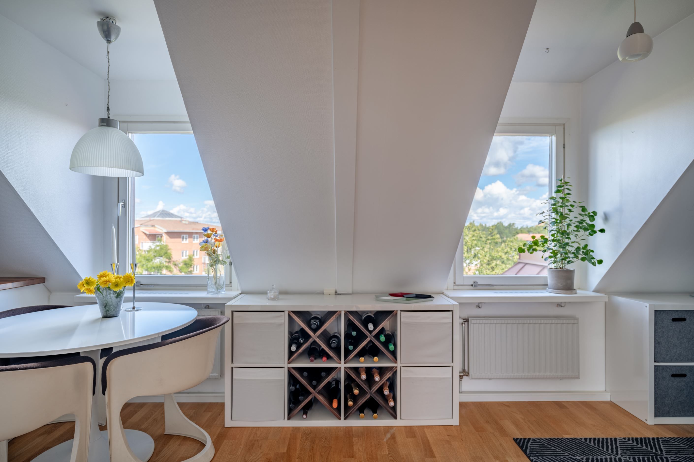Välkommen till en ljus och stilfull genomgångslägenhet allra högst upp i huset i populära Herserud. Här bor du insynsskyddat med en solig balkong som bjuder på både glimtar av vattnet och en vacker vy över staden – den perfekta platsen för avkoppling.