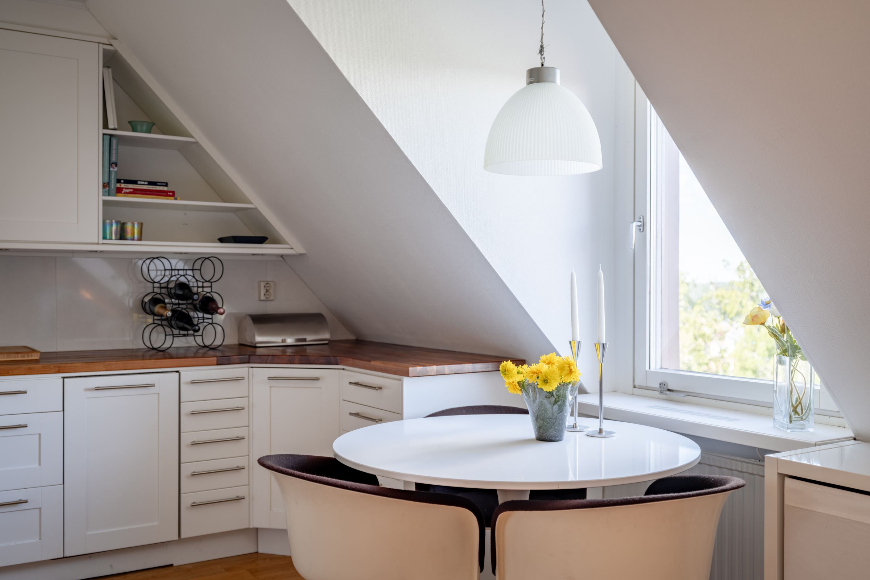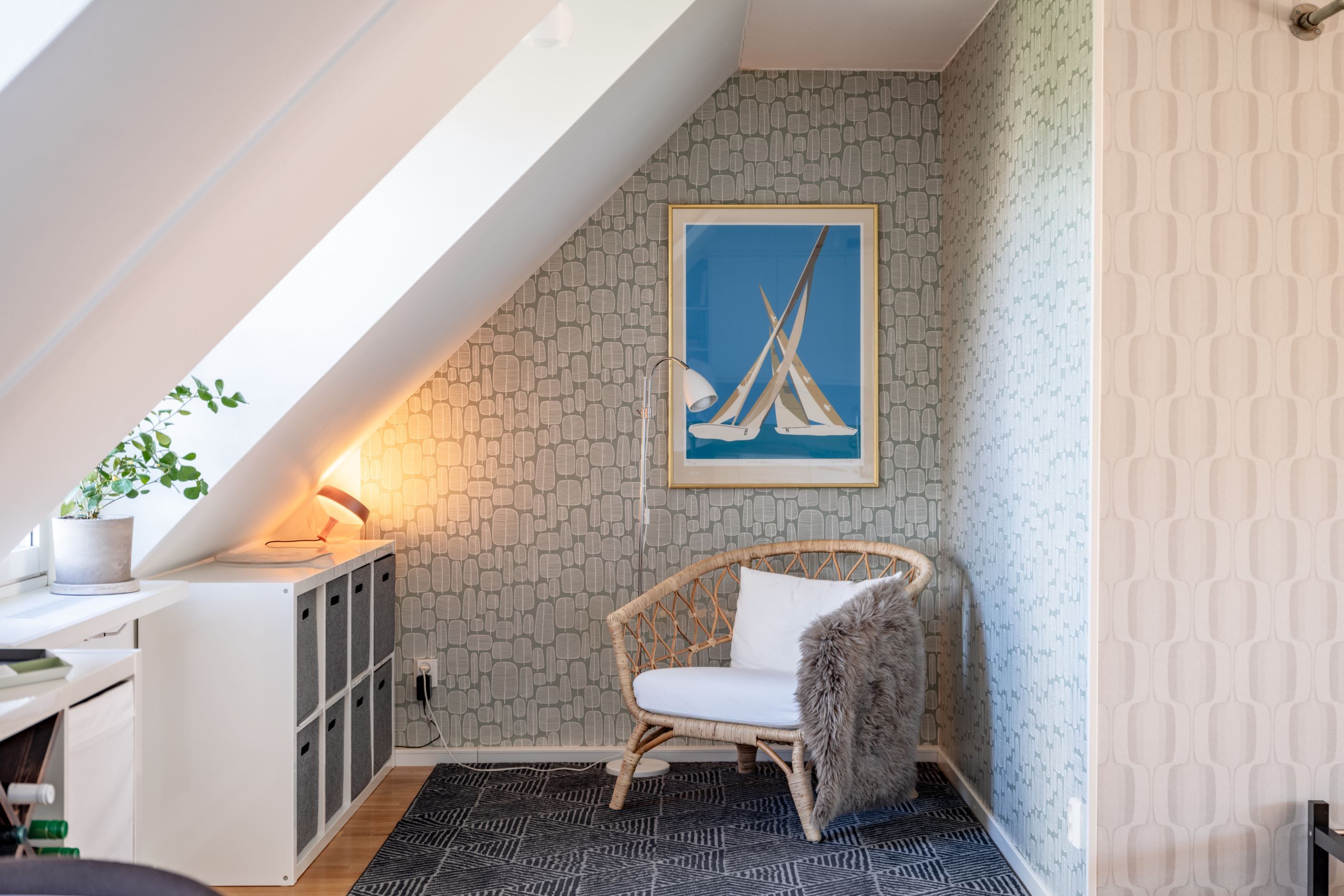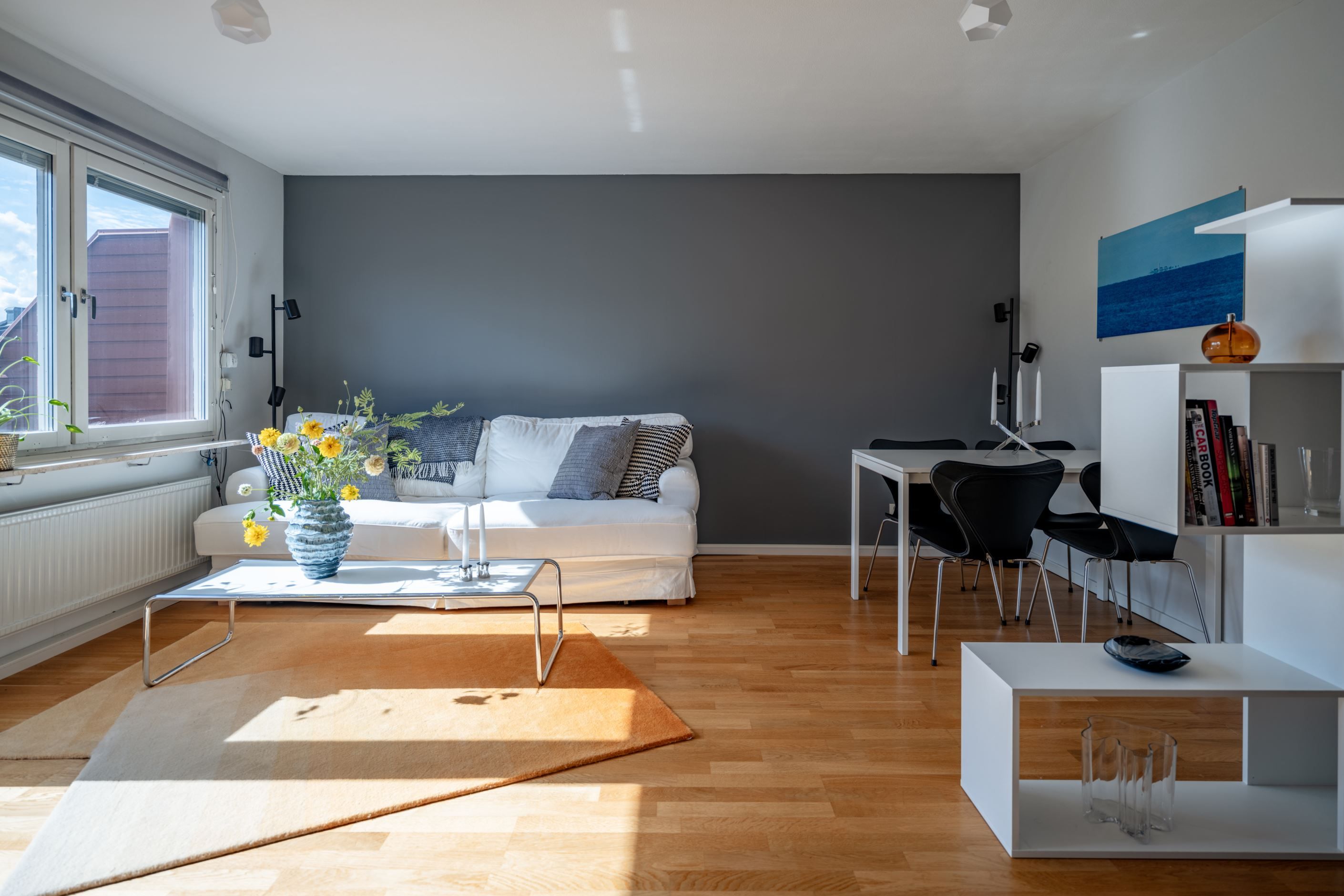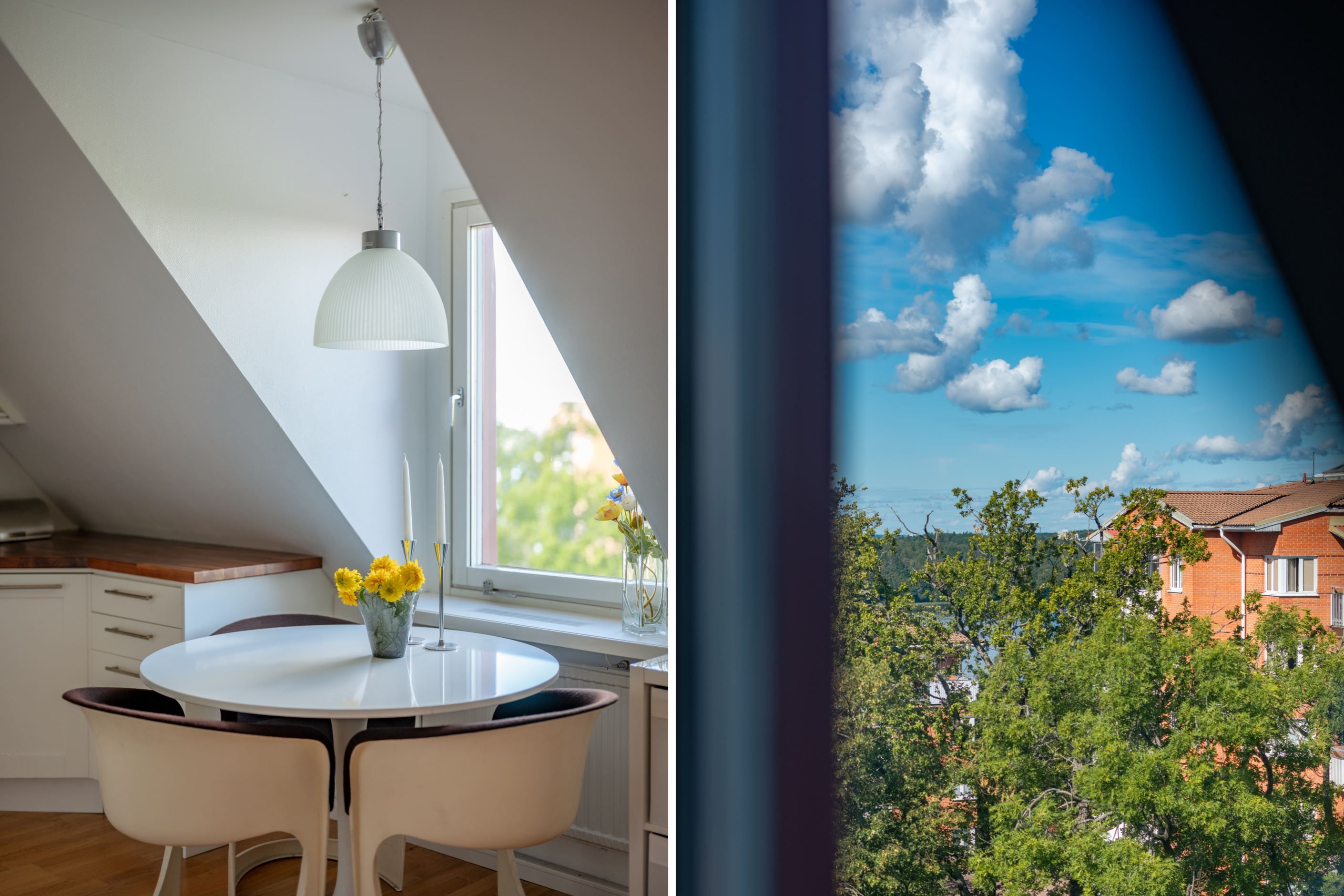 Högst upp i huset – genomgångslägenhet med sjöglimt, stadsvy och varmgarage med elbilsladdare!