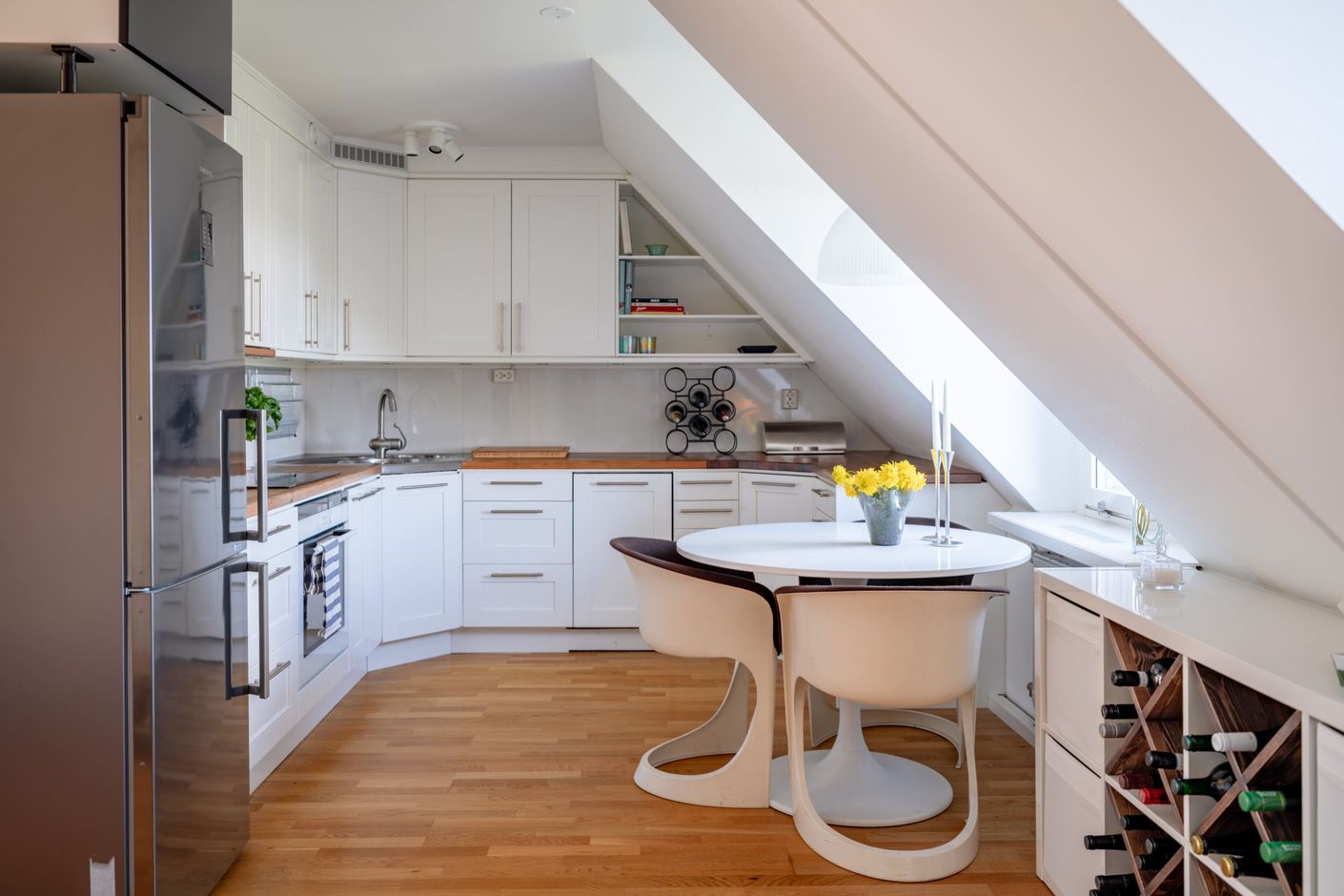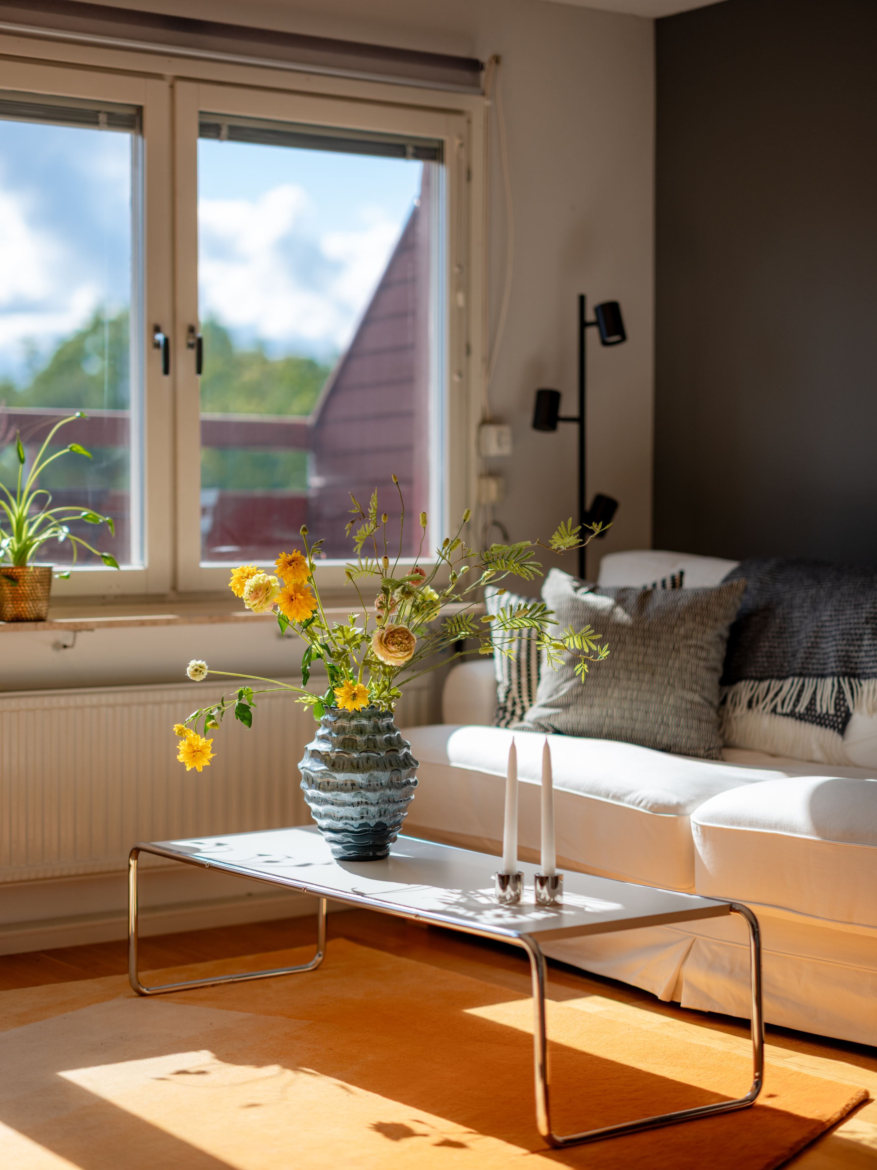 Högst upp i huset – genomgångslägenhet med fritt läge och varmgarage med elbilsladdare!