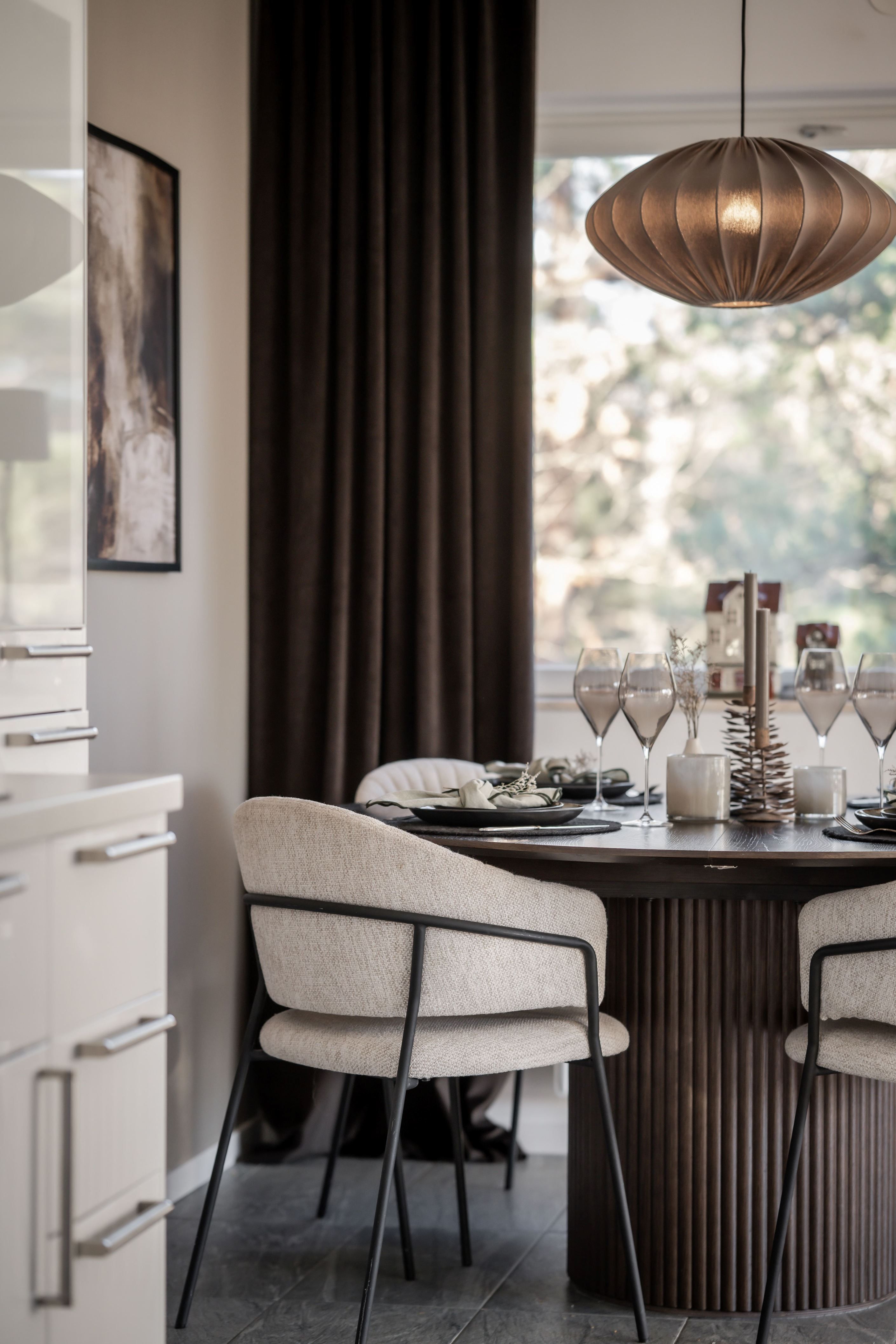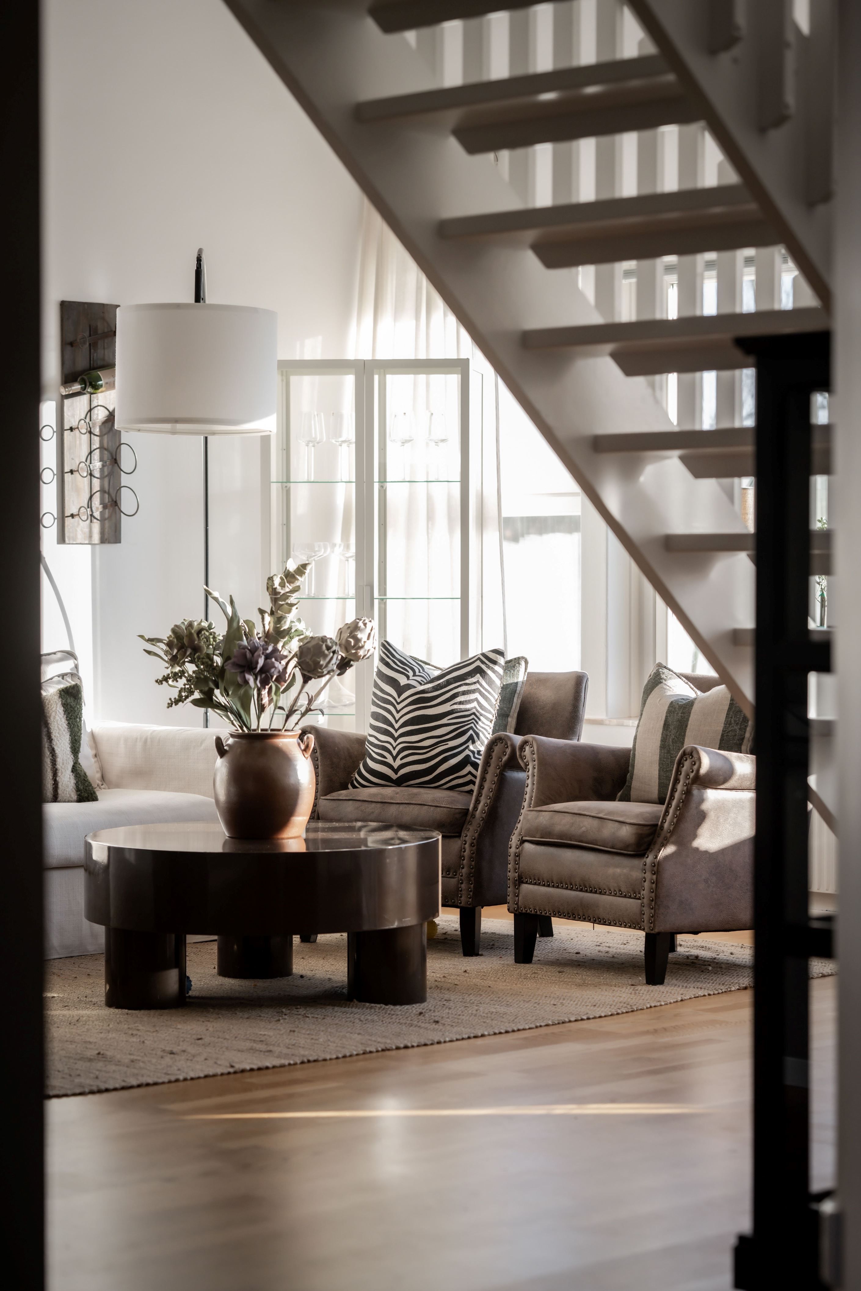 Bostaden nås via en privat loftgång och välkomnar med en ljus hall som öppnar upp mot ett inbjudande entréplan med öppen planlösning. Här samspelar kök, matplats och vardagsrum i ett genomtänkt flöde med generösa ljusinsläpp. Det stora vardagsrummet på entréplan imponerar med sin fantastiska takhöjd upp till nock, vilket ger hela lägenheten en härligt luftig och rymlig känsla. Den generösa takhöjden återfinns även i det intilliggande sovrummet, som är lika ljust och inbjudande med vacker utsikt över trädtopparna. Tillsammans bidrar rummen till en öppen och behaglig stämning som genomsyrar hela bostaden. Entréplanet rymmer också en stilren helkaklad gäst-WC.