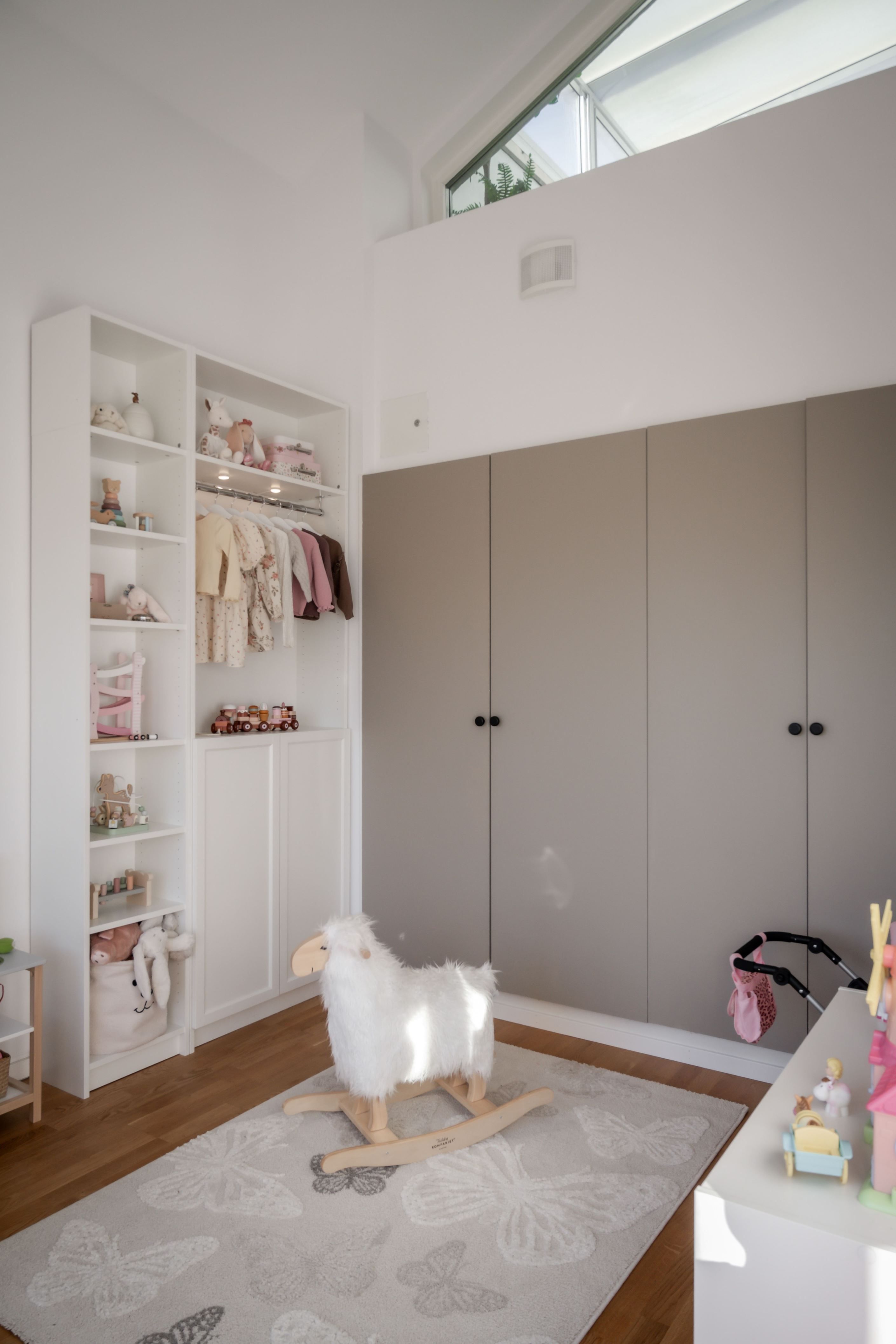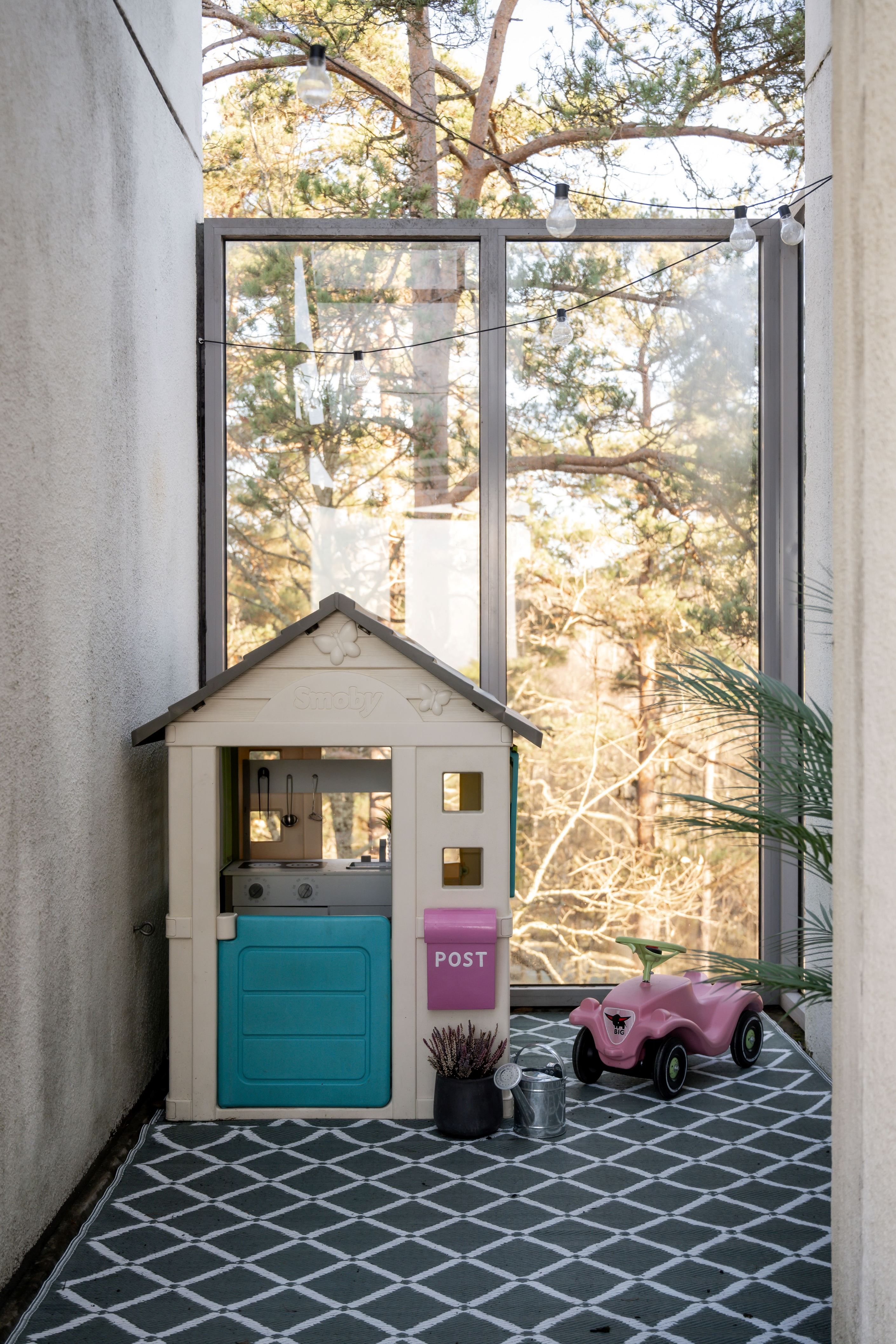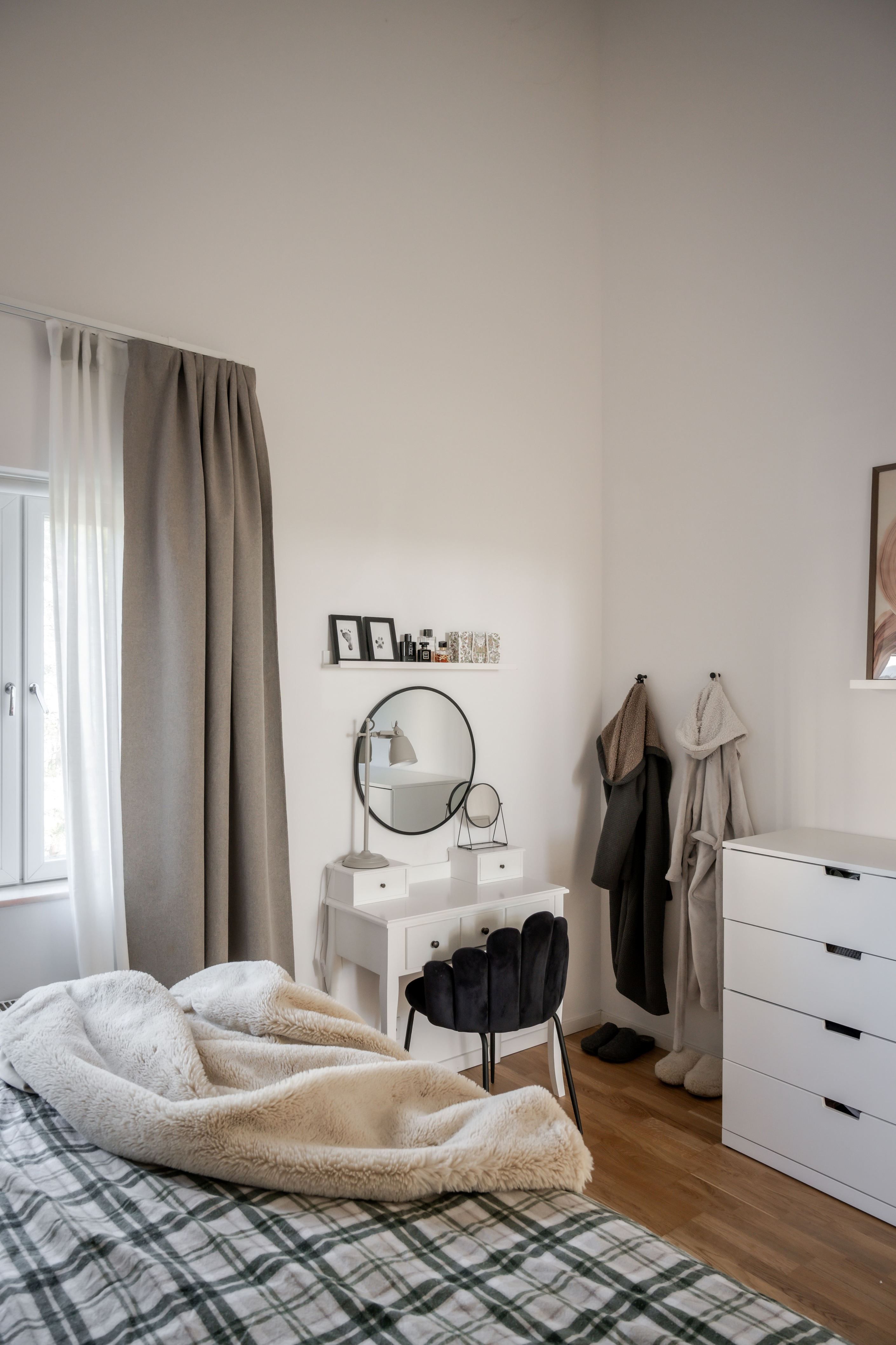 En trappa upp väntar ett rofyllt våningsplan med ytterligare ett sovrum – idag använt som master bedroom – samt ett stort helkaklat badrum med både tvättmaskin och torktumlare. Härifrån når du även den soliga inglasade balkongen med trädäck och fri utsikt, helt utan insyn.