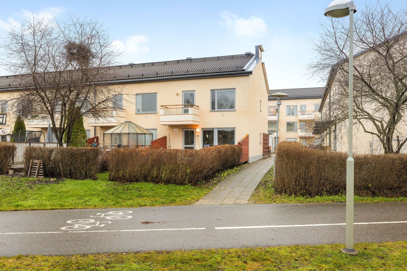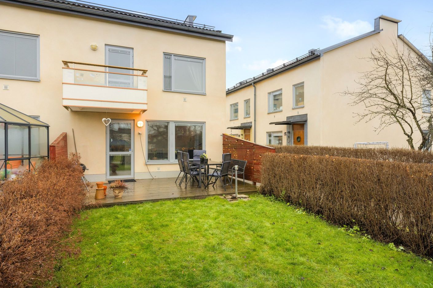 - Vad som utgör bostadens hjärta är helt klart utomhusmiljön med 2 uteplatser. Morgonkaffet tas gärna på den ca 15 kvm stora uteplatsen på framsidan i österläge mot föreningens lugna gård . Baksidans uteplats i västerläge med trall och stor gräsmatta som tillhör radhuset. Som en förlängning av uteplatsen kan man ta genvägen till fältet med angränsande lekplats genom grinden som finns placerad i buskarna som inhägnar tomten. Lekplatsen har nyligen fått ett ansiktslyft med ny parkbelysning och lekstationer för de mindre barnen.