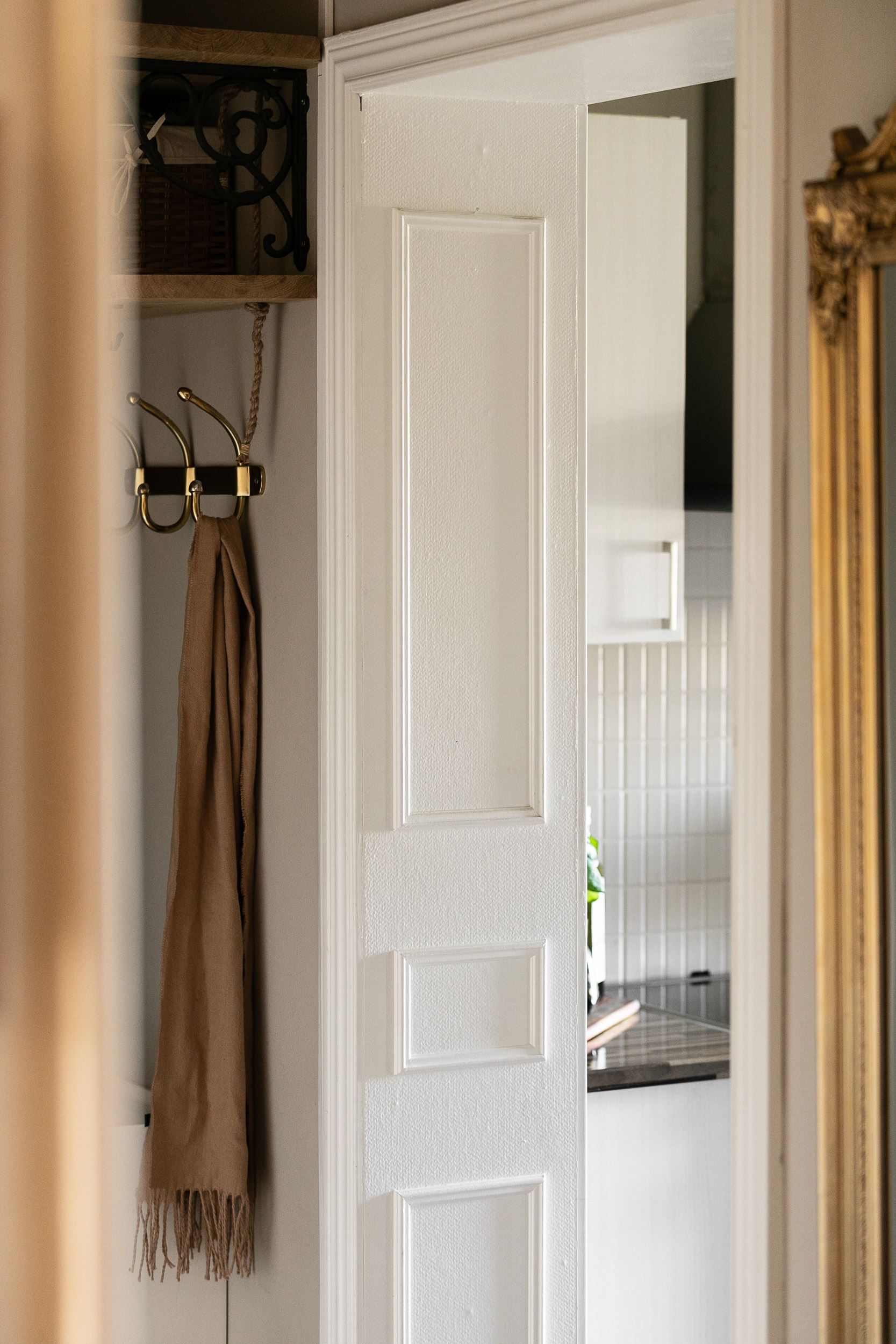 Väggarna i lägenheten är smakfullt dekorerade med tidlösa tapeter i harmoniska färger, vilket ger ett varmt och ombonat intryck.
