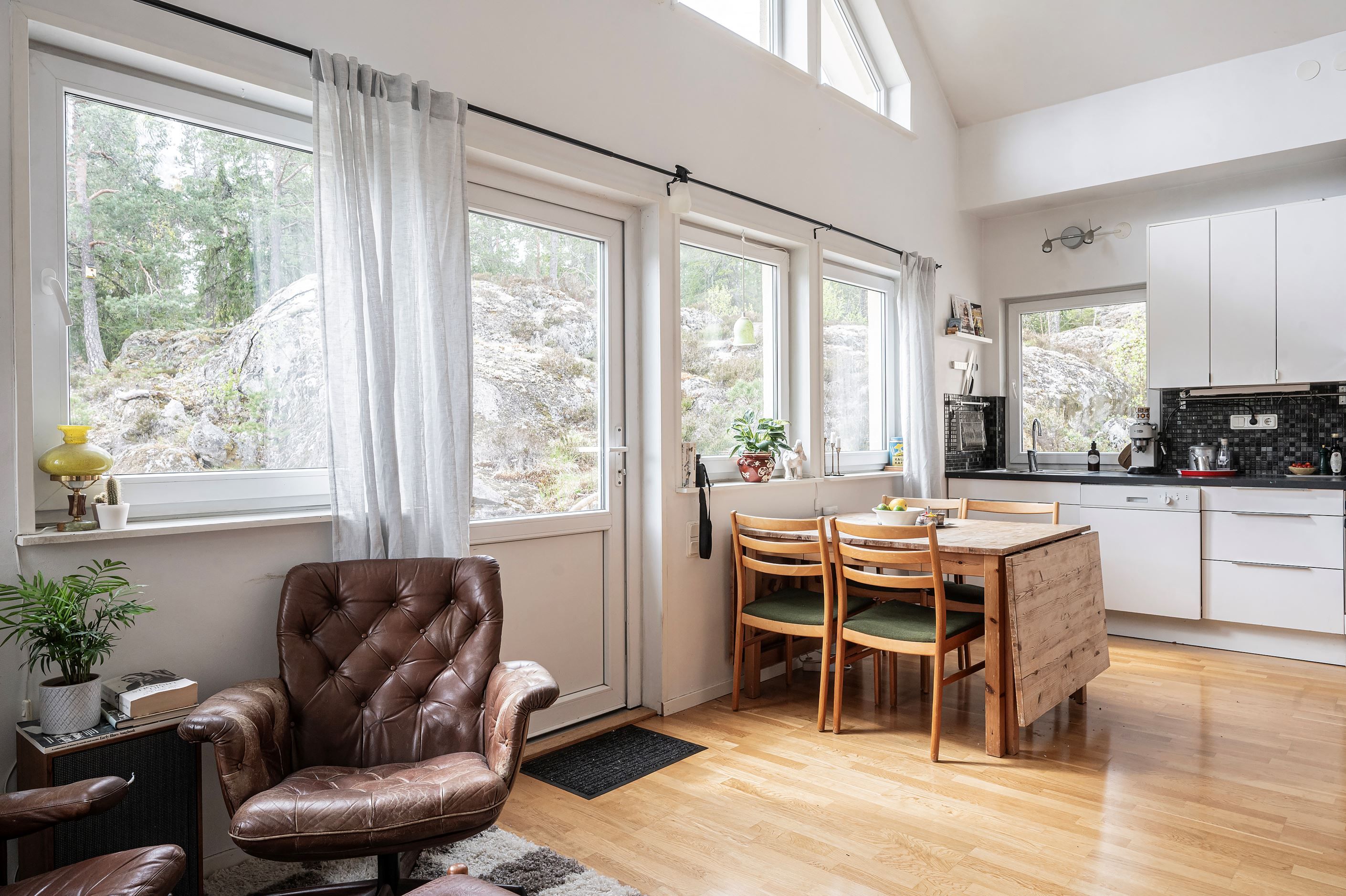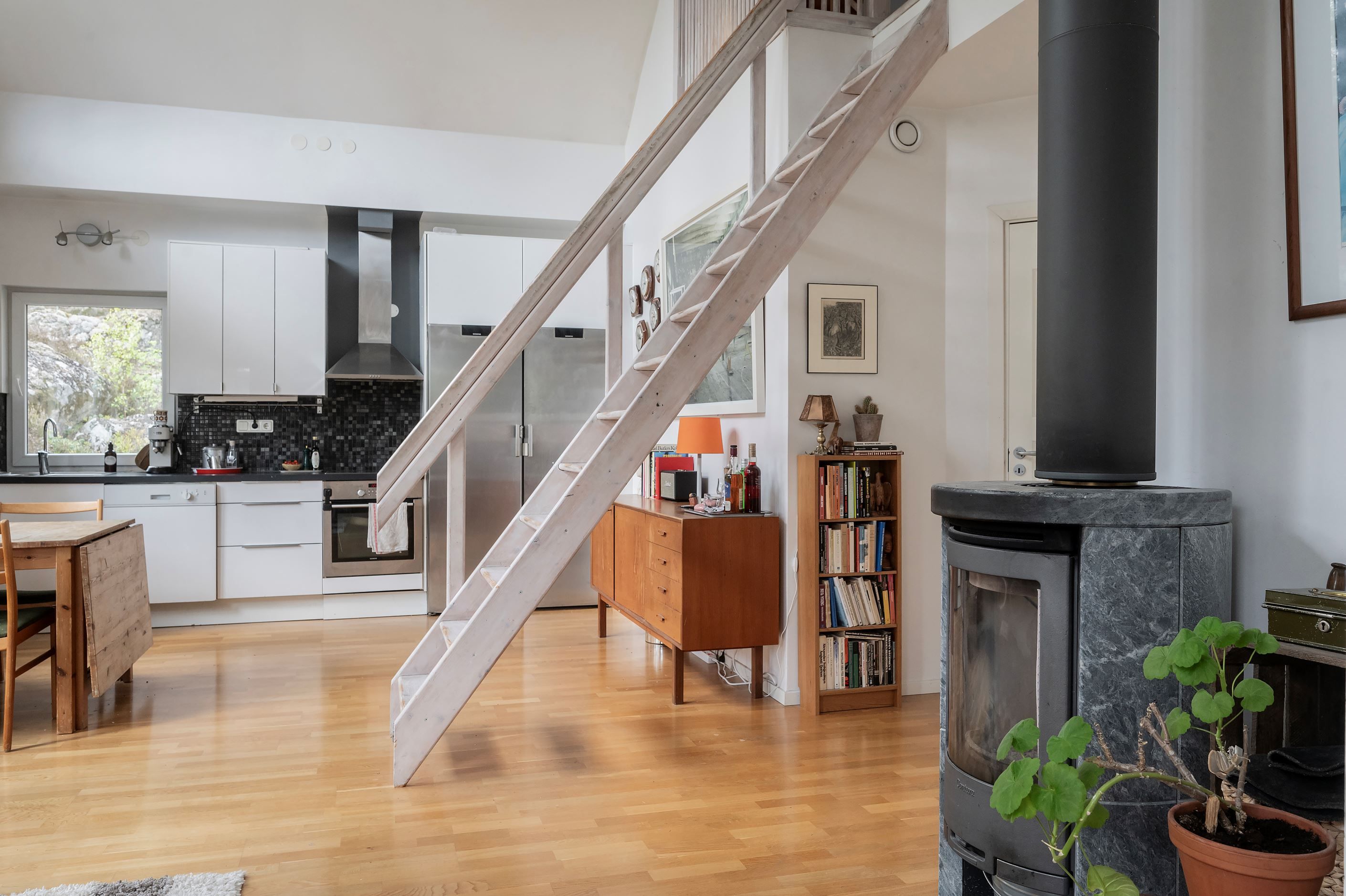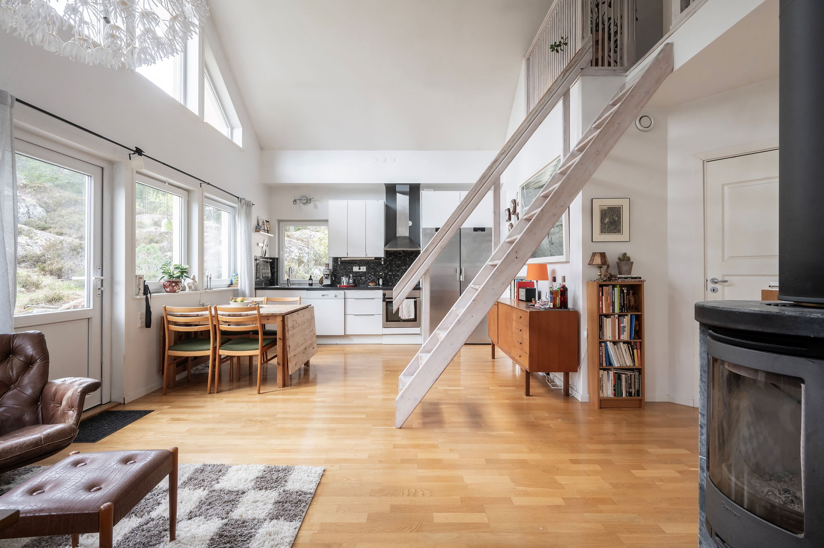 Det moderna huset har en öppen och social planlösning med stora fönsterpartier som släpper in rikligt med dagsljus. Här finns två rymliga sovrum och ett charmigt loft som enkelt kan användas som ytterligare sovrum eller kontor. Hela nedre plan har vattenburen golvvärme för behagligt inomhusklimat året runt, och eldstaden blir en naturlig samlingspunkt under kalla kvällar i vardagsrummet.