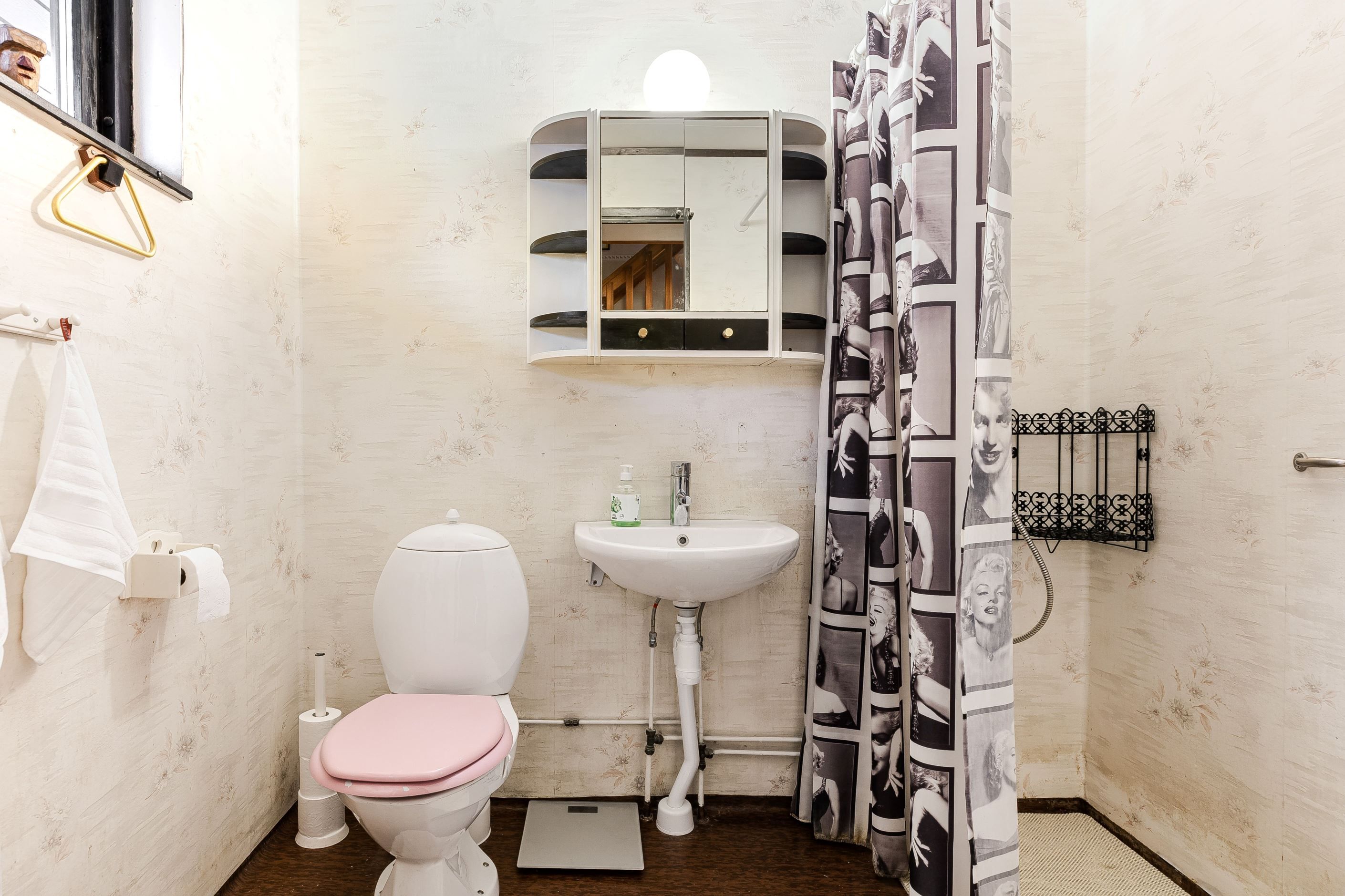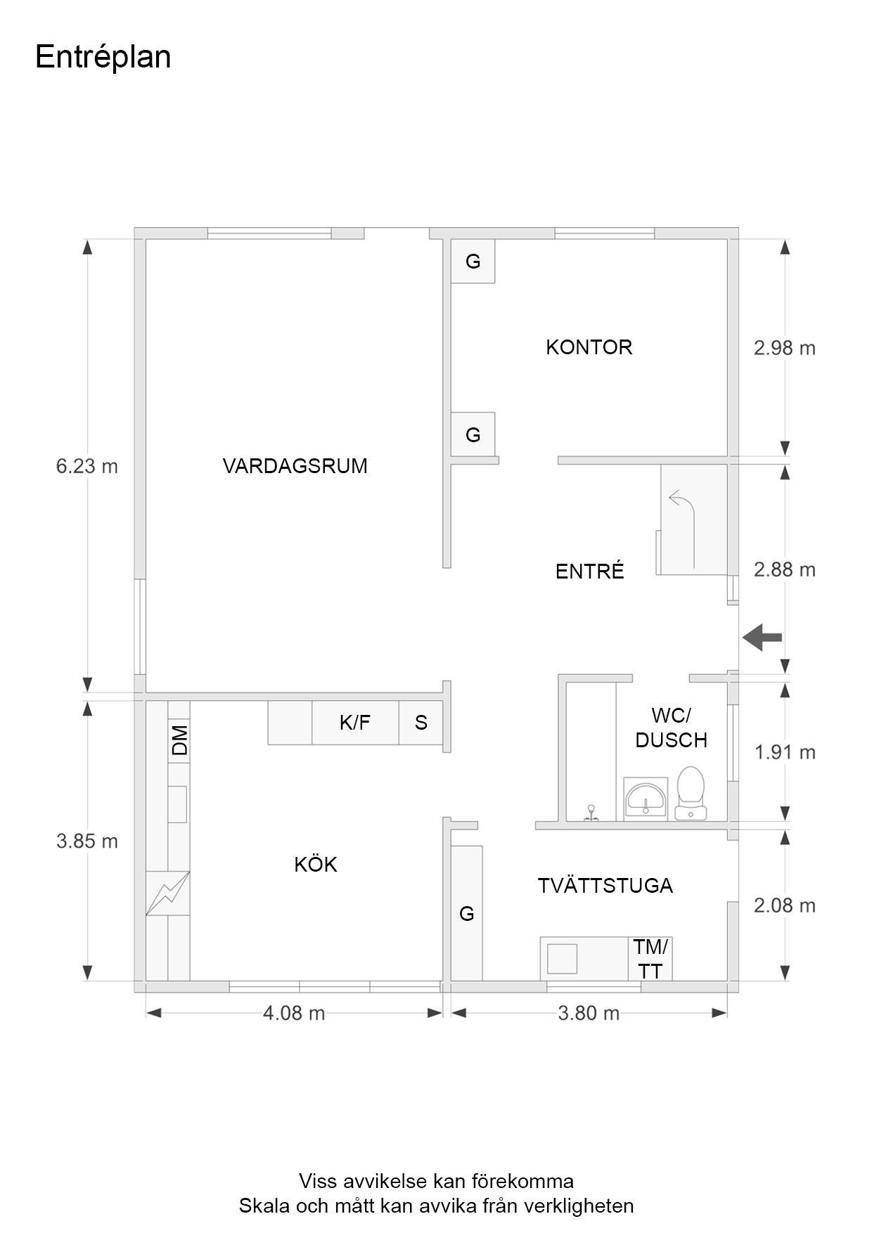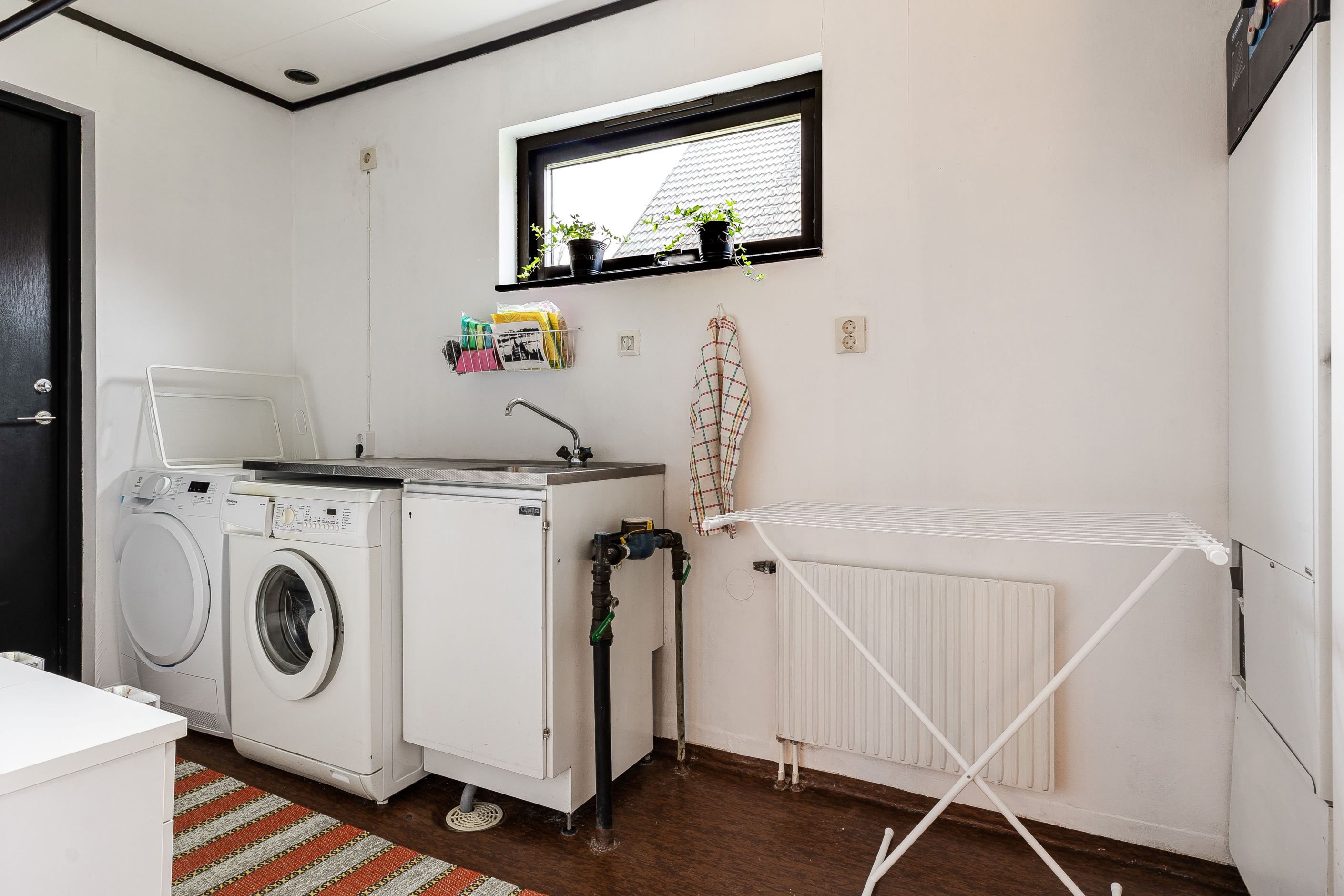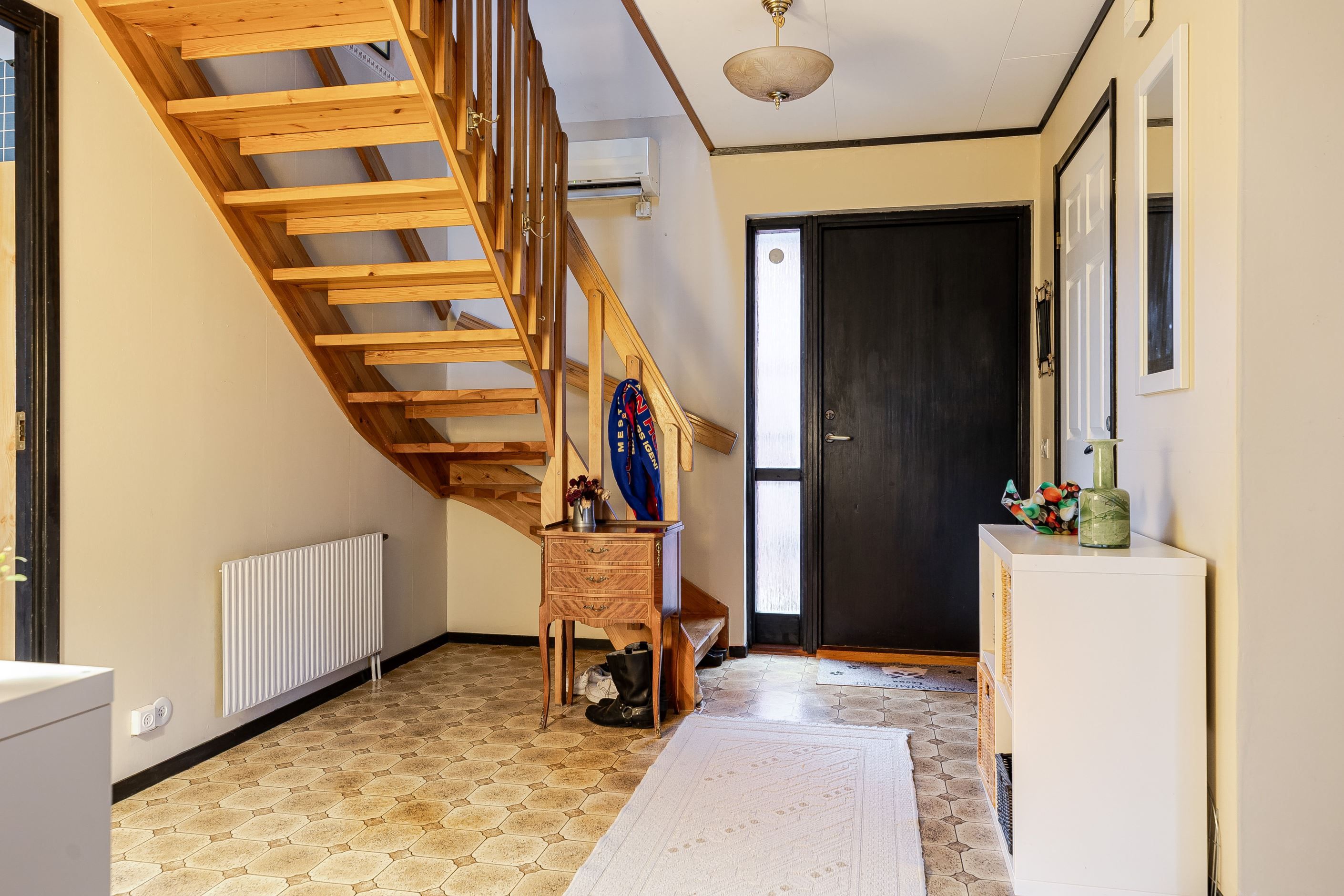 På entréplanet möts du av en rymlig och välkomnande hall med gott om utrymme för avhängning. Direkt till vänster finns ett duschrum i originalutförande, utrustat med WC, handfat, spegelskåp samt fönster som ger fint ljusinsläpp och möjliggör naturlig vädring. Vid den praktiska groventrén finner du tvättstugan utrustad med tvättmaskin och torktumlare.