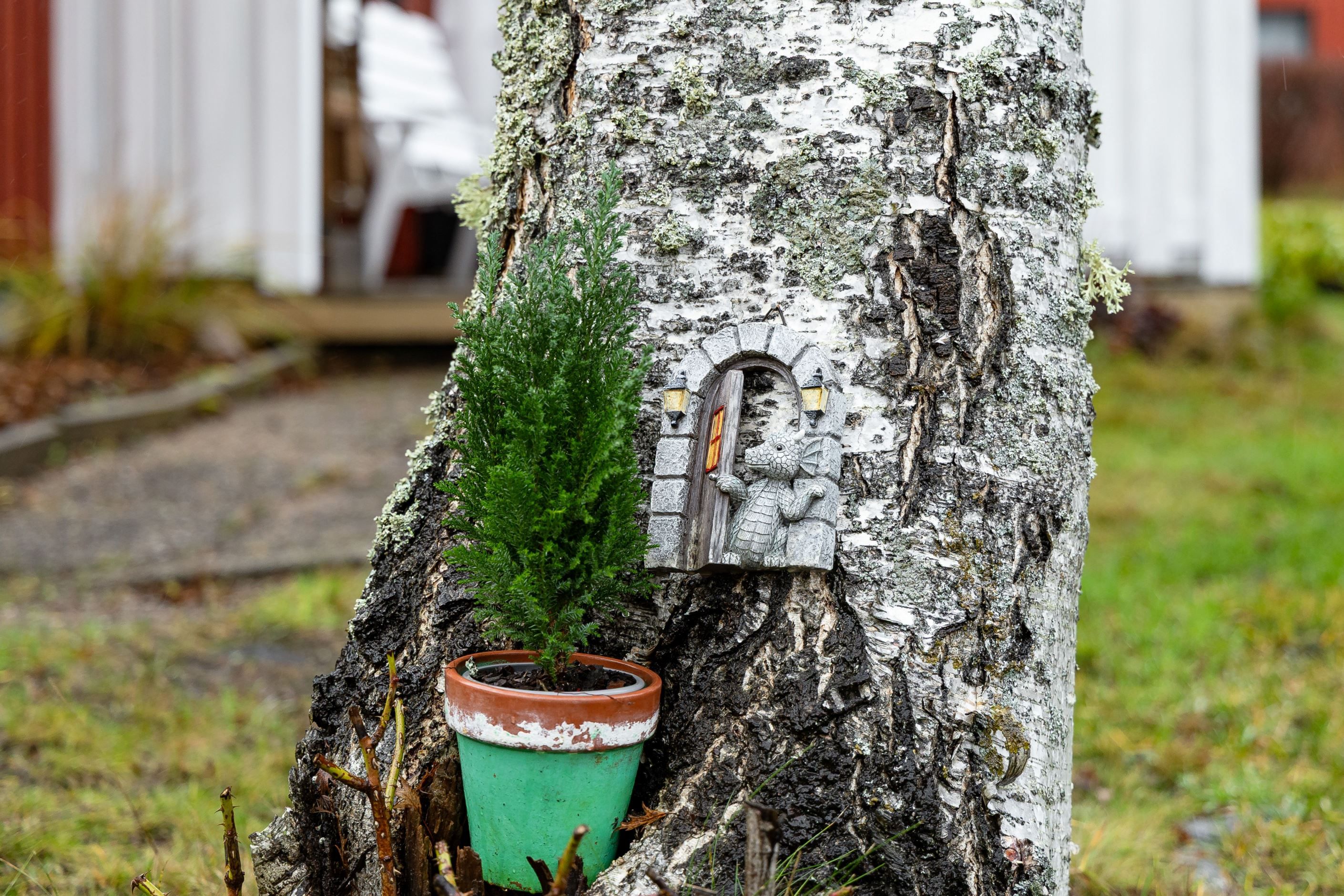 Den lättskötta trädgården bjuder på charmiga inslag som jordgubbsland, björk och en vacker trollhassel – perfekt för dig som vill njuta av grönska utan stora skötselkrav.