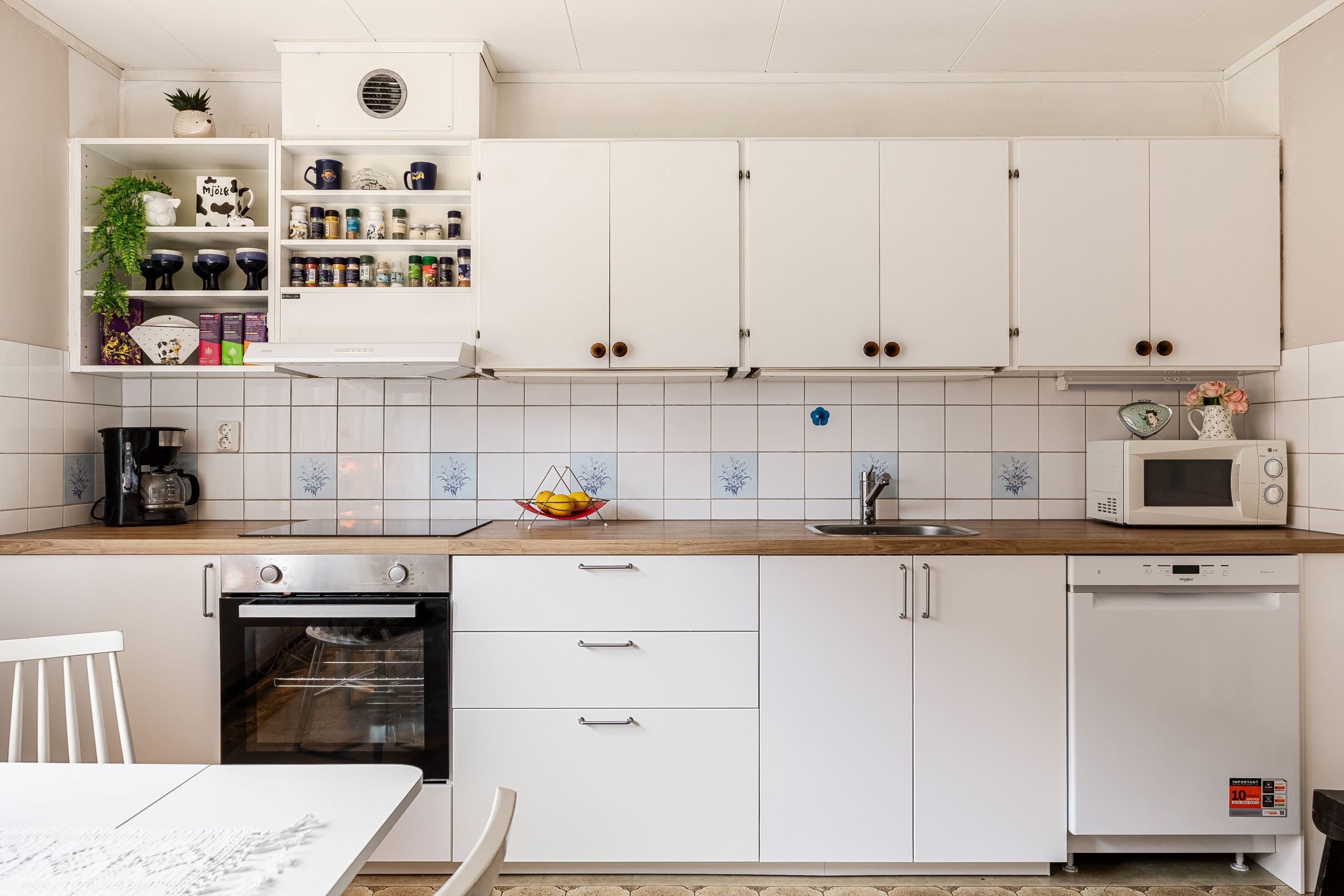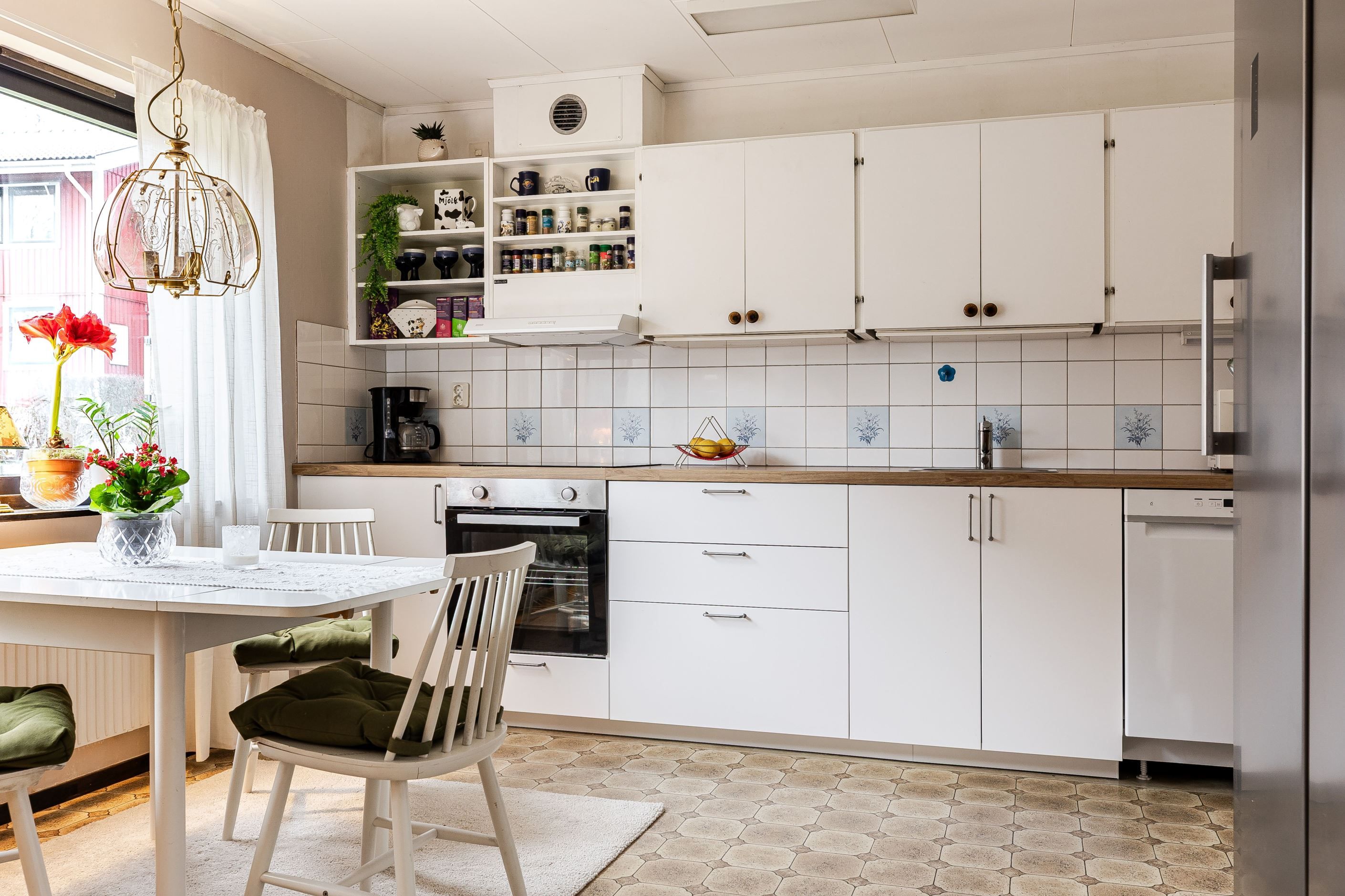 Köket erbjuder en härlig matplats och är utrustat med moderna vitvaror, däribland rostfri kyl och frys i fullhöjd, induktionshäll, ugn och diskmaskin. Från vardagsrummet nås husets altan, perfekt för sommarens middagar och avkoppling i det fria.
