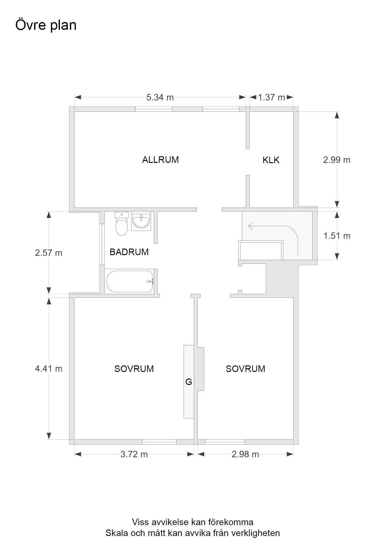 På det övre planet finns tre sovrum, varav ett väl tilltaget master bedroom, samt ett badrum med nyare takfönster, badkar och WC.