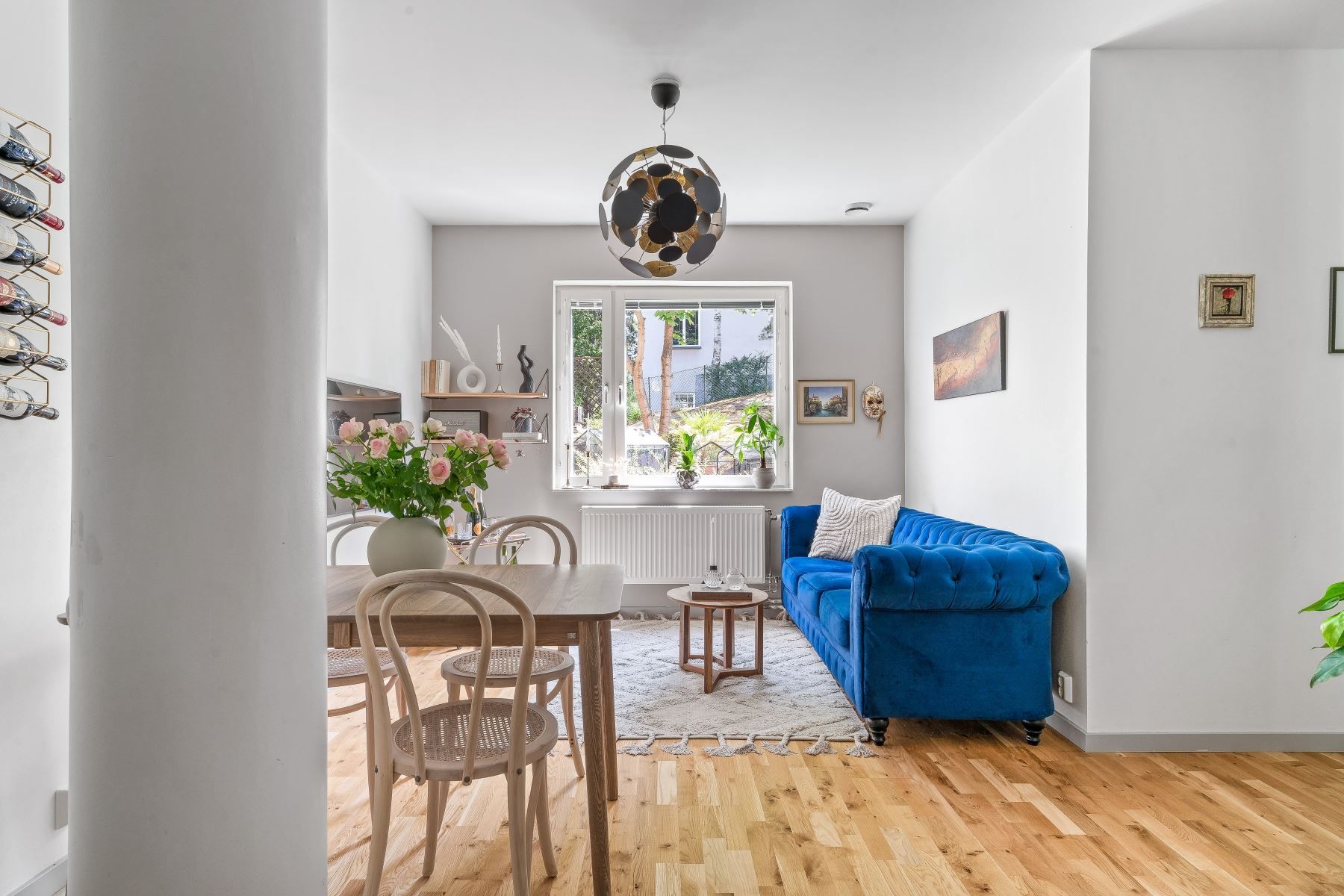 Du kliver in i en rymlig hall med generösa avhängningsytor med plats för övriga förvaringsmöbler. Vidare in når du en öppen planlösning mellan kök och vardagsrum som bjuder in till härliga sociala tillställningar med vänner och familj. L-format fullutrustat kök från Ballingslöv med vitvaror som håller hög standard. Köket erbjuder god förvaring i gråa skåp och lådor, diskmaskin, kyl/frys, spis med tillhörande fläkt samt mikro. Vardagsrum och kök nås av ett rikligt ljusinsläpp från fönster mot sydost. Här får du plats med soffgrupp, matplats och övrigt passande möblemang. Sovalkoven intill rymmer säng som är 120-140 cm och kan enkelt skärmas av med draperi eller enklare vägg, hallen intill erbjuder bra plats för garderober/förvaringsmöbler. Superfint helkaklat badrum med golvvärme, spotlights i tak, tvättmaskin, stor och rymlig dusch samt kommod för förvaring. Till lägenheten hör ett källarförråd.