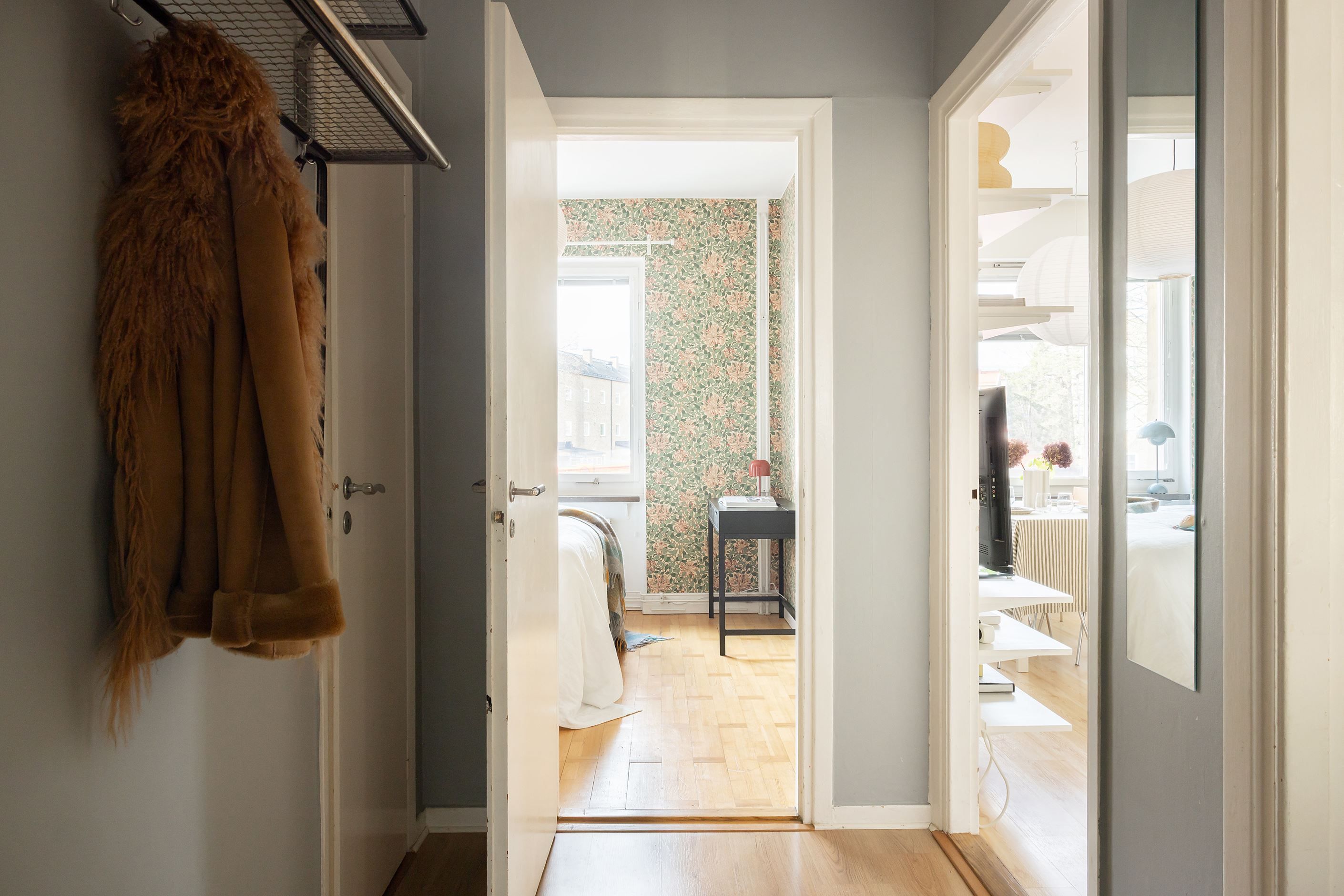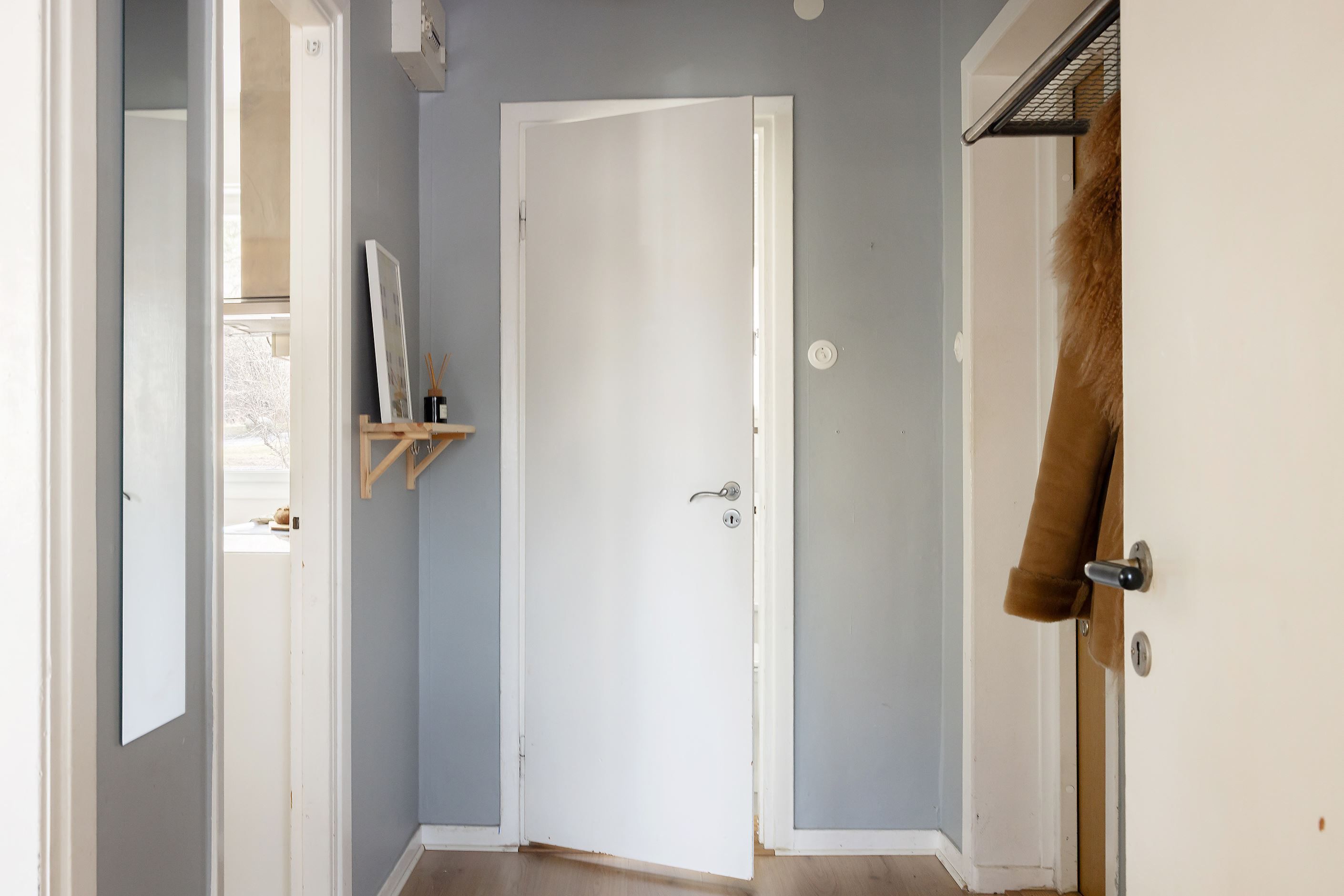 Hallen är välkomnande och erbjuder en naturlig yta för avhängning av ytterkläder och skor direkt i anslutning till entrén. Från hallen nås vardagsrum, kök, sovrum och badrum samt en praktisk klädkammare med gott om plats för förvaring.