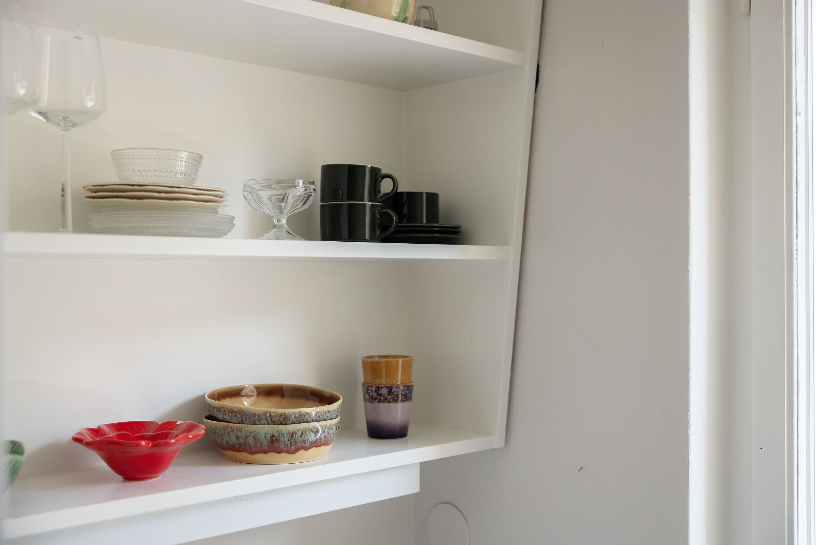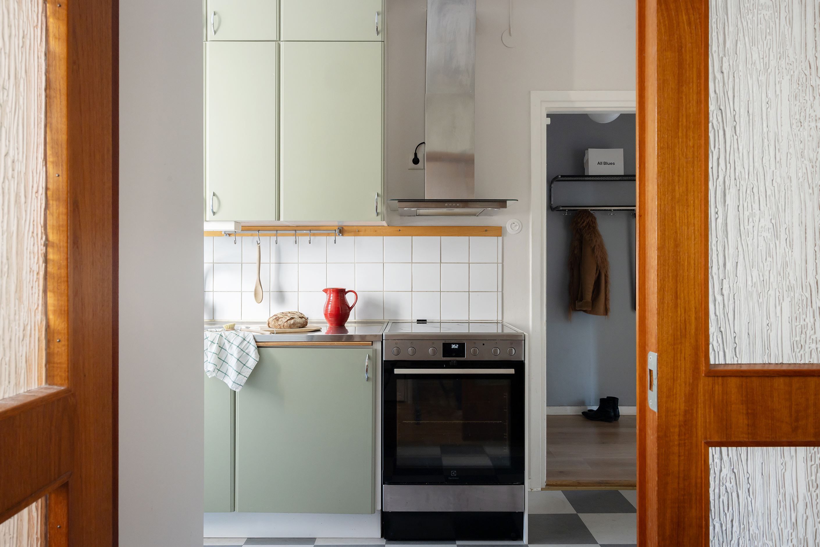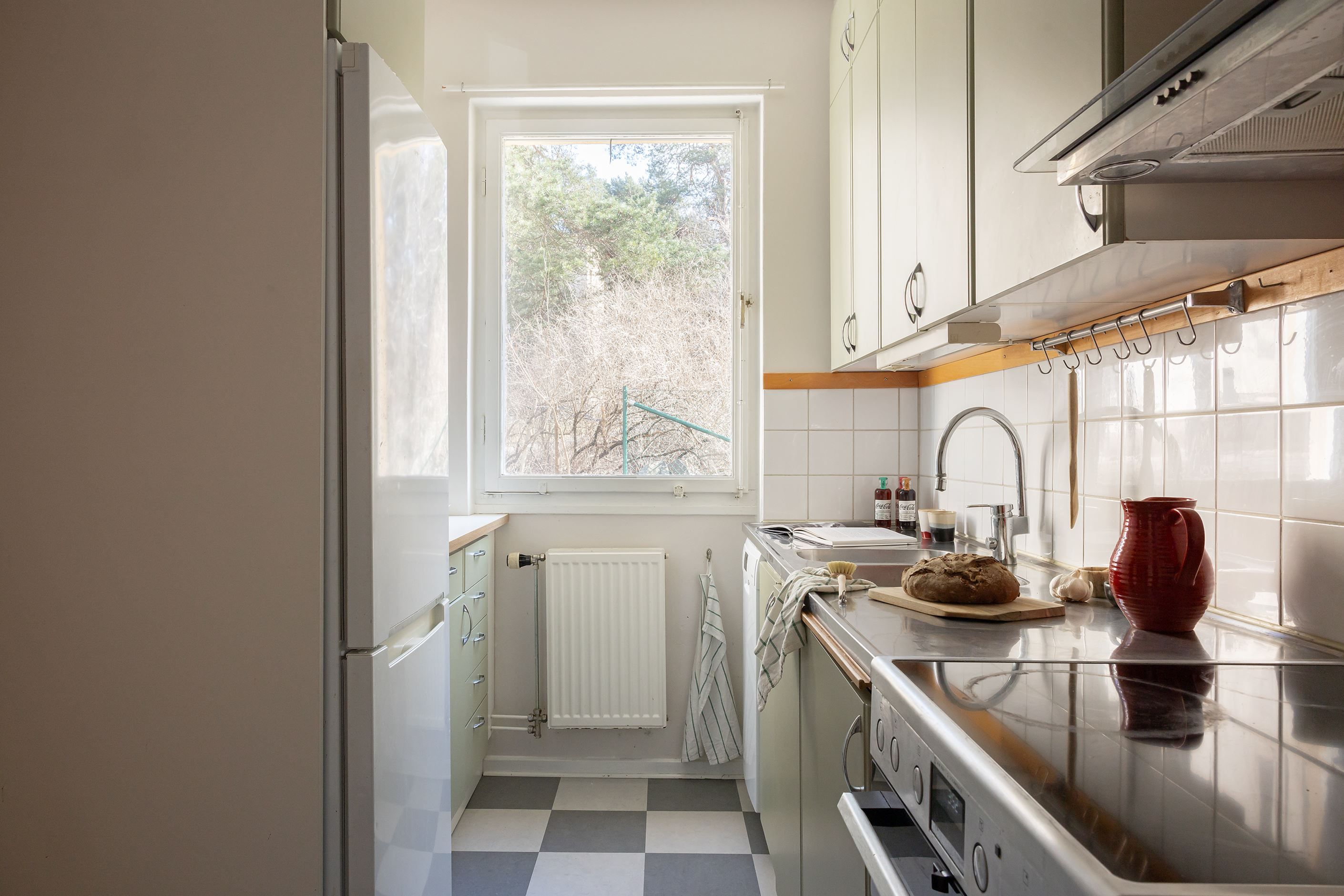 Köket är ett klassiskt funkiskök med överfalsade fronter och tidstypiska beslag som ger rummet en genuin och tidstypisk känsla. I köket erbjuds gott om förvaring och bra arbetsytor samt maskinell utrustning bestående av spis med häll, fläktkåpa och diskmaksin samt kombinerad kyl/frys. Fönster mot den lugna innergården ger köket ett fint naturligt ljusinsläpp.