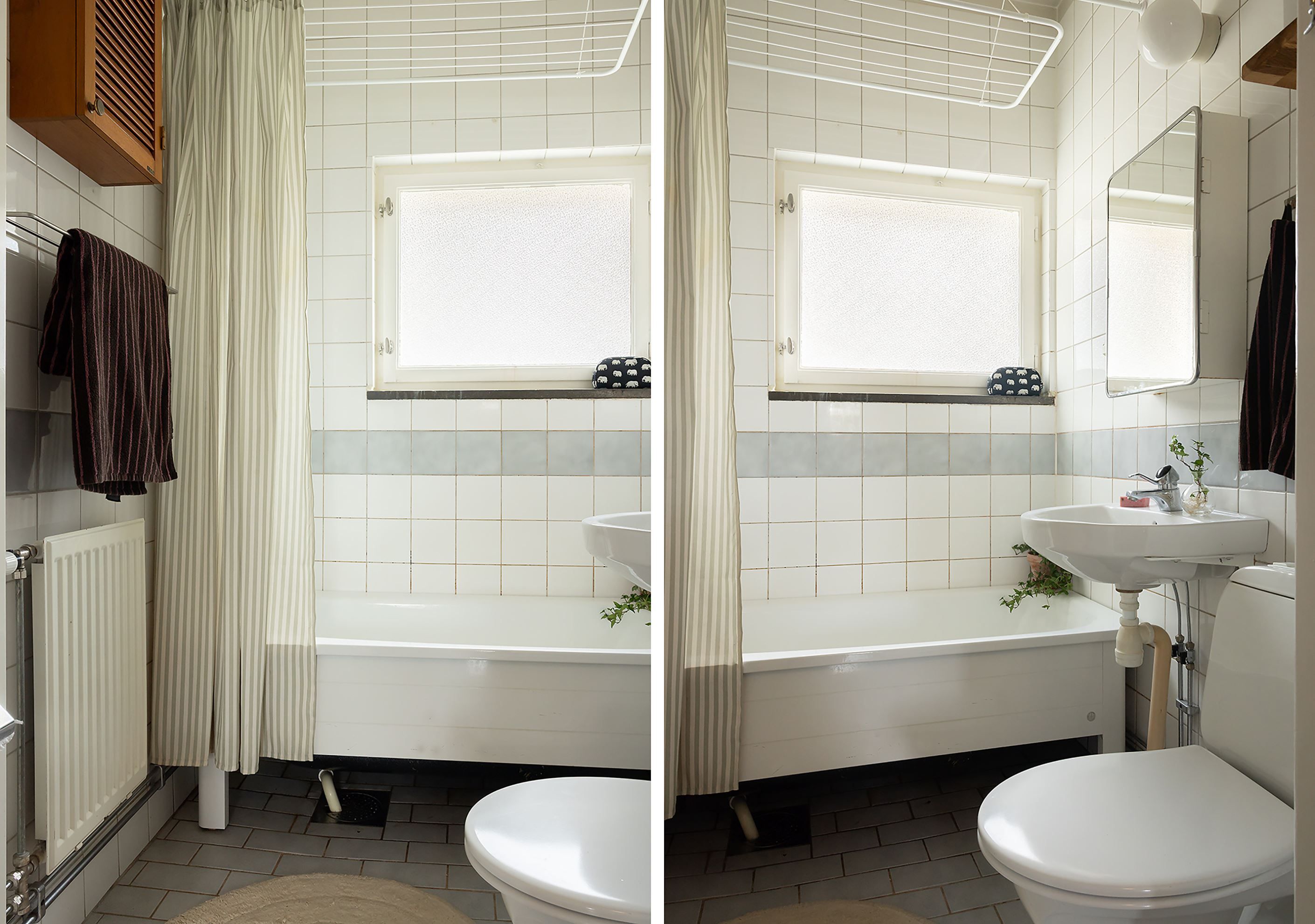 Badrummet är helkaklat från stambytet med badkar, handfat, spegelskåp och wc. Ett öppningsbart fönster släpper in dagsljus utan insyn.