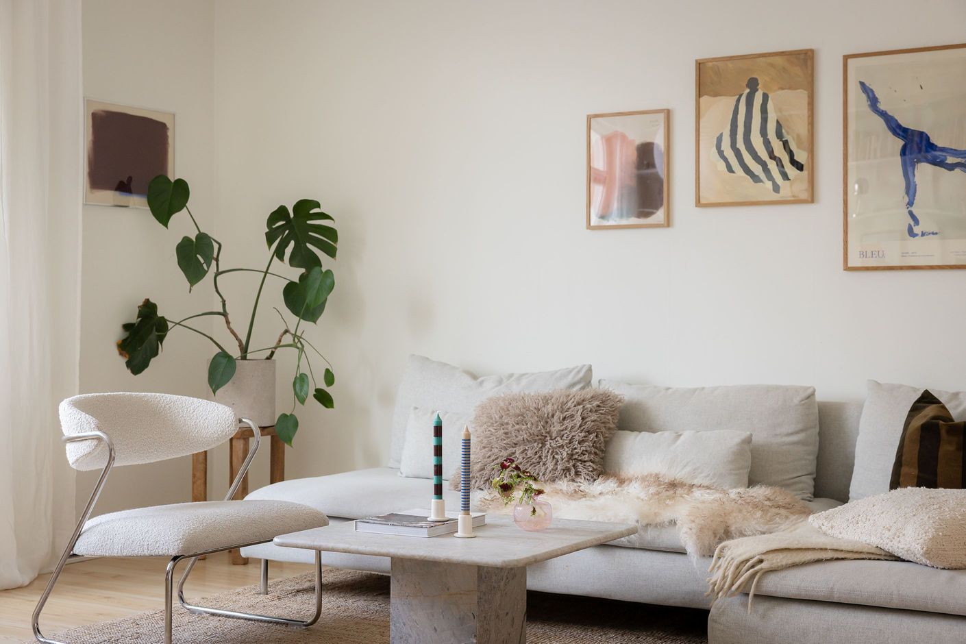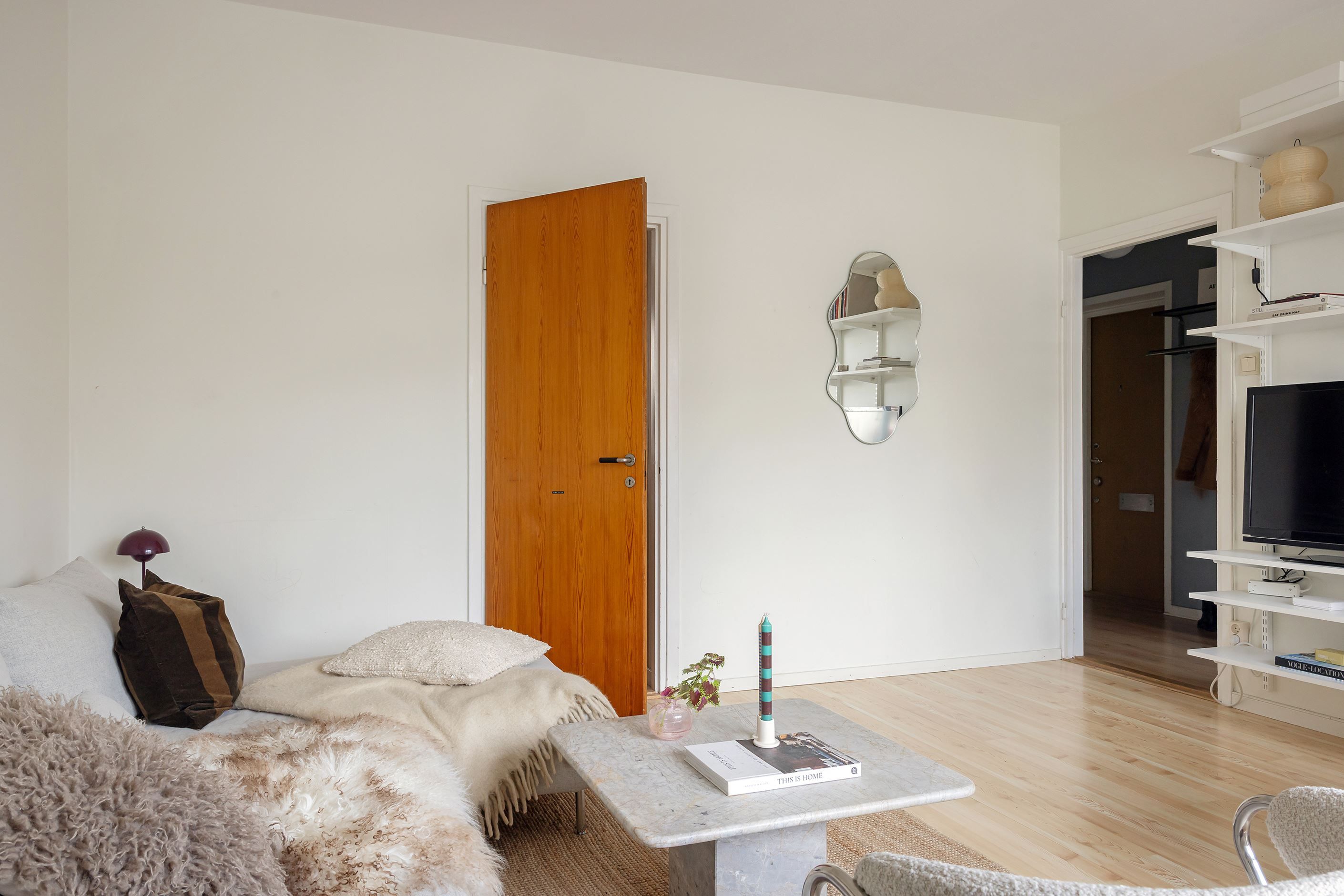 Vardagsrummet är generöst tilltaget med gott om plats för både soffa, fåtölj och matbord, samtidigt som rummet behåller en luftig känsla. Ett stort fönster och balkongdörr mot den franska balkongen ger ett rikligt ljusinsläpp. Tillsammans med tidstypiska beslag, fönsterbänkar i natursten och ett gediget trägolv skapas en vacker och tidstypisk helhet.