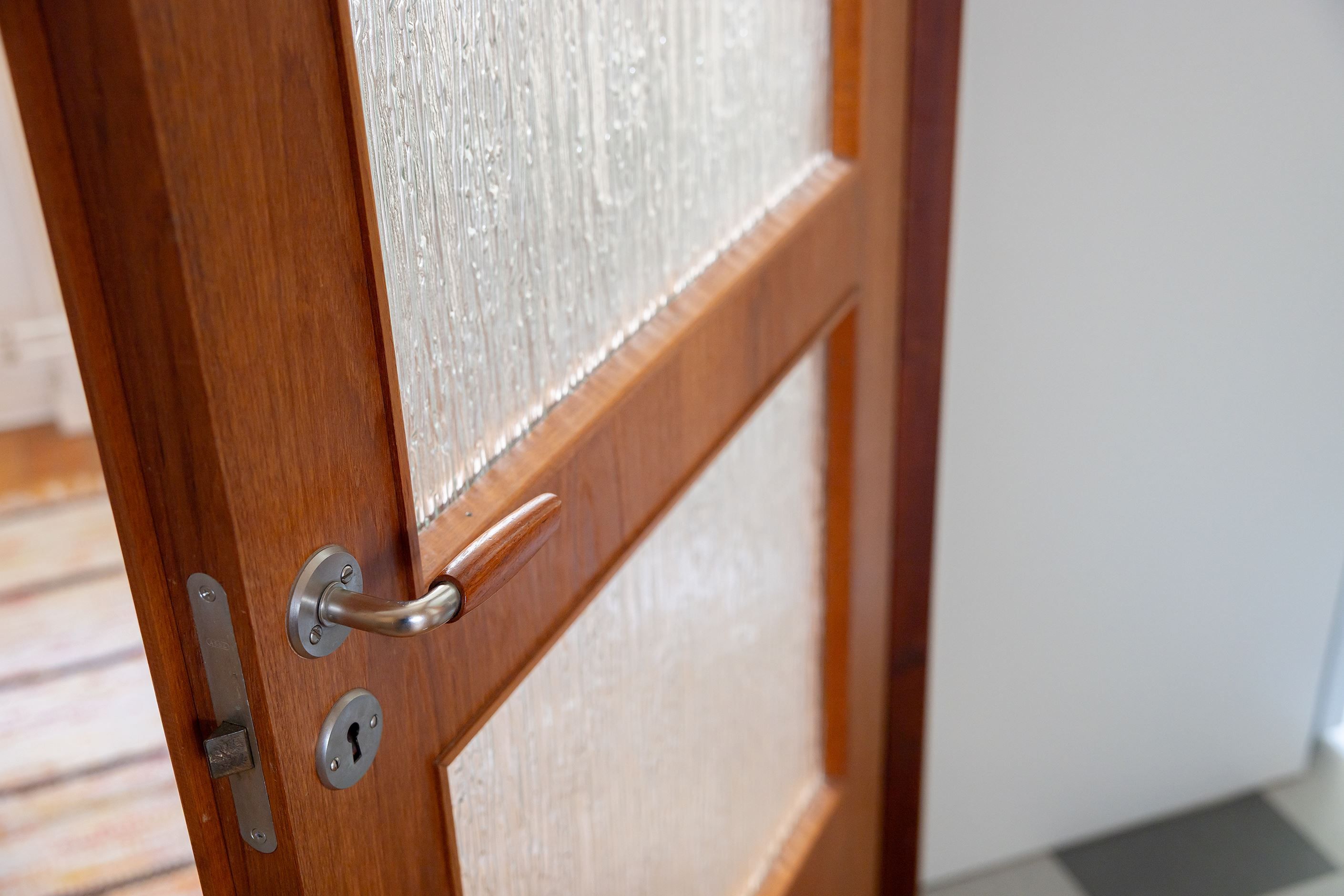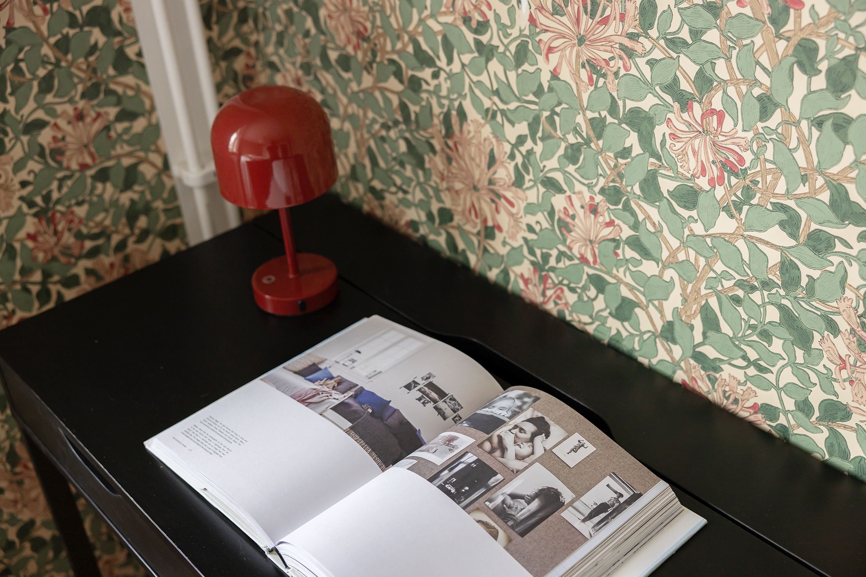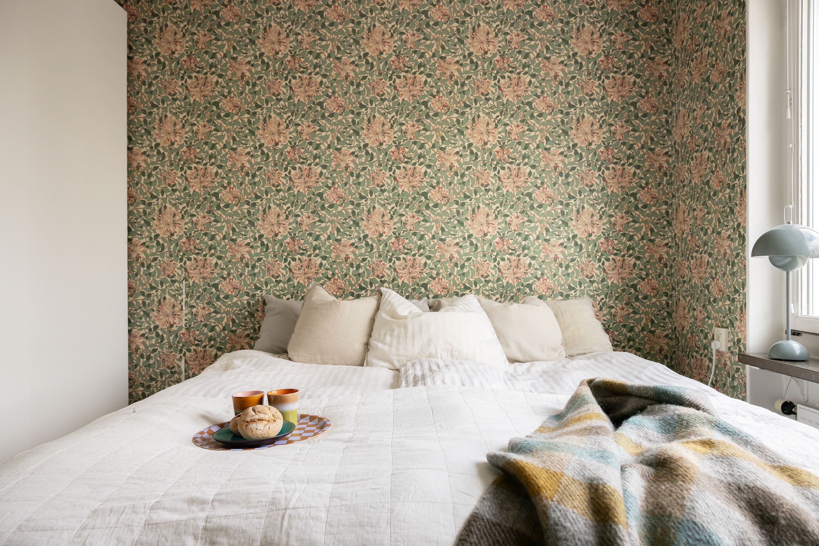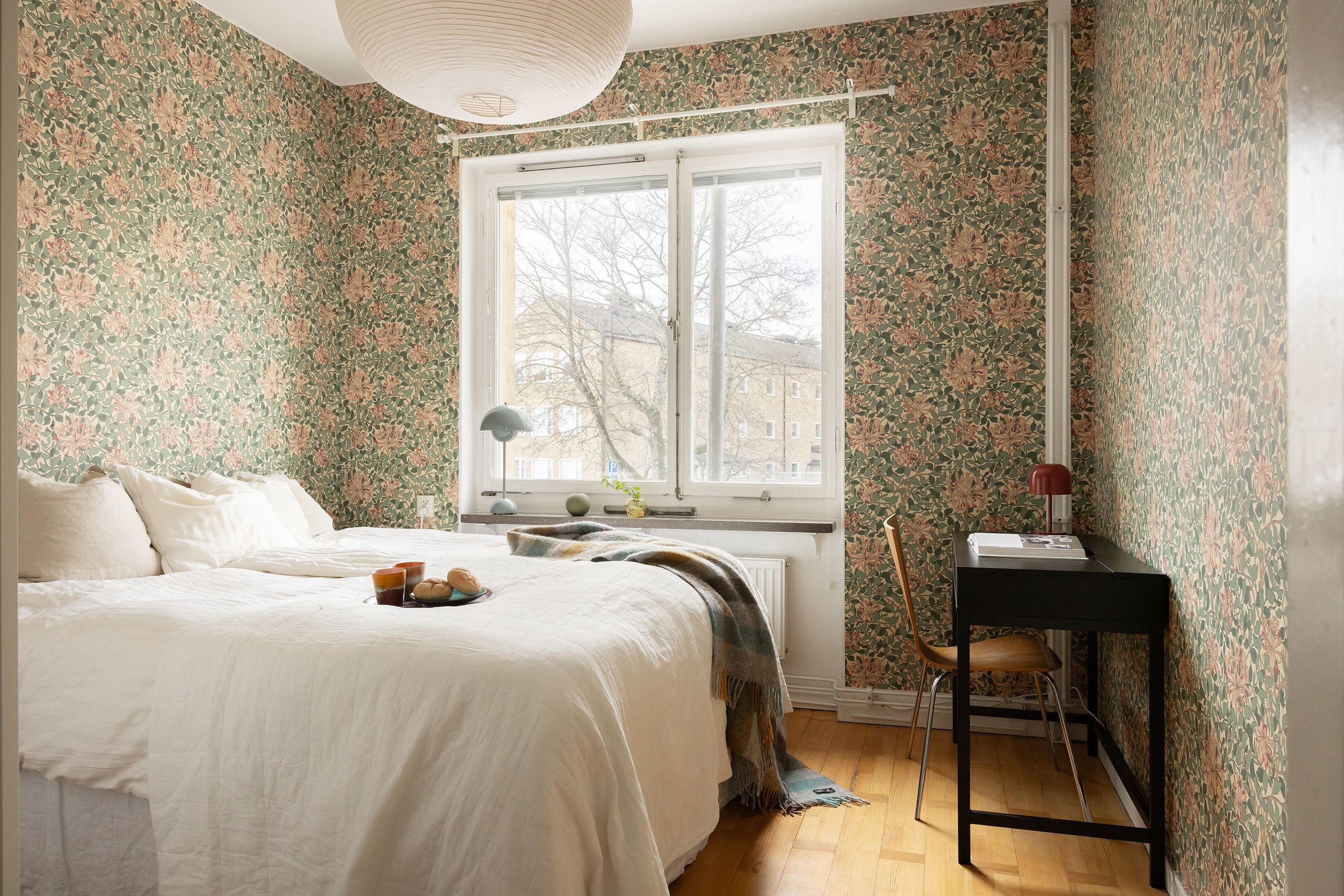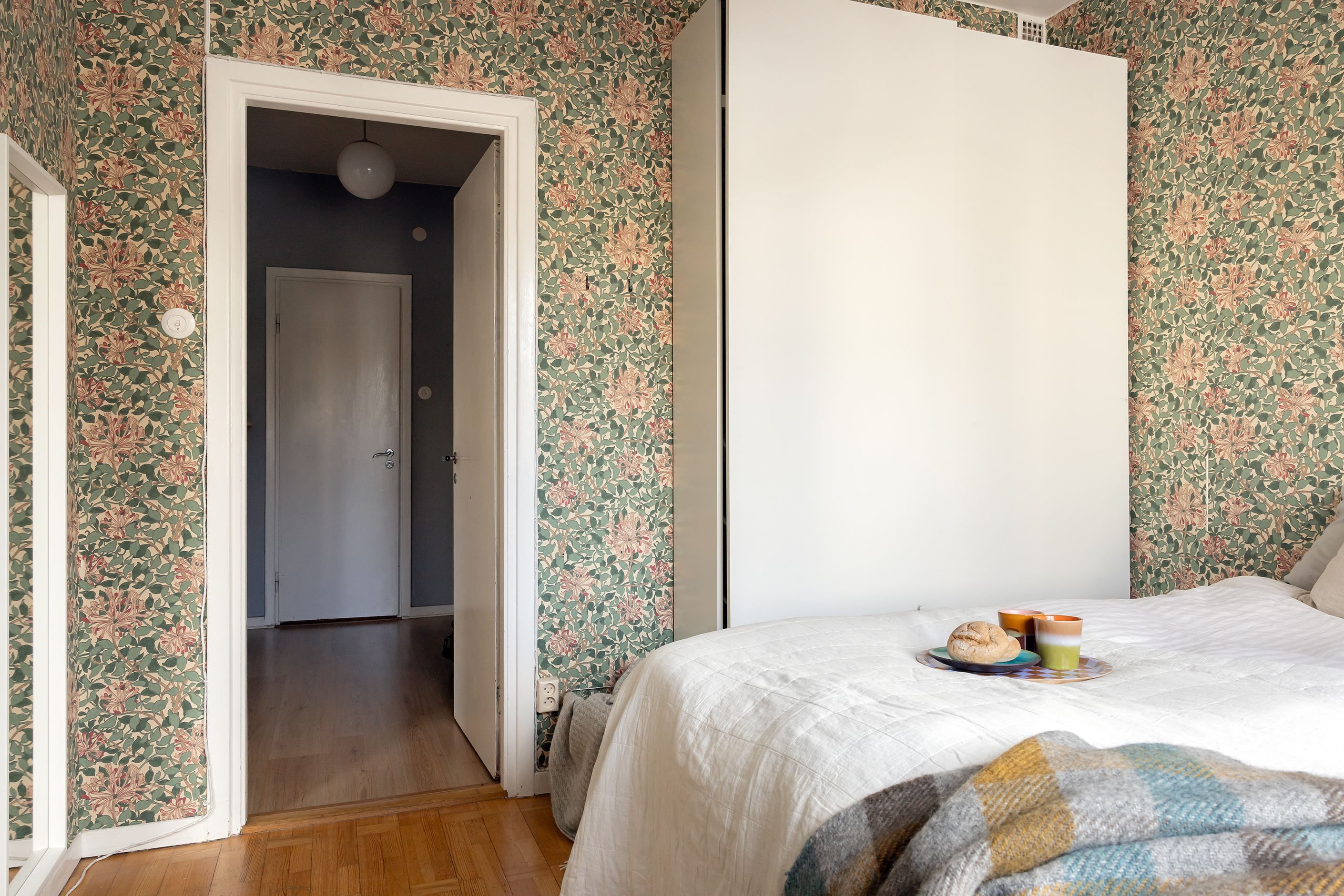 Från köket via pardörrar med etsade glaspartier och från vardagsrummet nås ett mysigt och rogivande sovrum. Här finns plats för större säng och ytterligare möbler alternativt en mindre arbetsplats eller skrivbordshörna, allt efter behov. Även detta rum har fönster mot den lummiga gården.