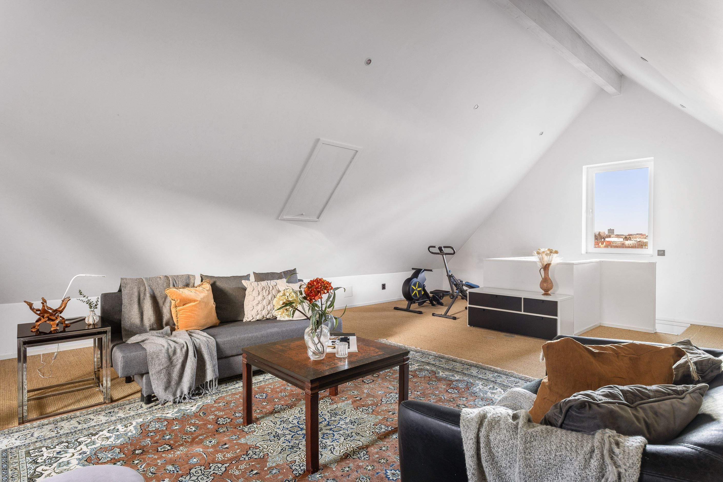 Den tredje våningen utgör ett extra stort och öppet rum med många användningsmöjligheter. Här finns utrymme att skapa ett ungdomsrum, ett inspirerande hemmakontor eller showroom för entreprenören, ett allrum för familj och vänner, en fest- och sällskapsvåning, eller varför inte ett kreativt hobby- eller träningsutrymme. Kanske för yoga eller andra evenemang? Rummets storlek och avskildhet gör det till ett idealiskt komplement som kan anpassas efter livets olika skeden och behov.