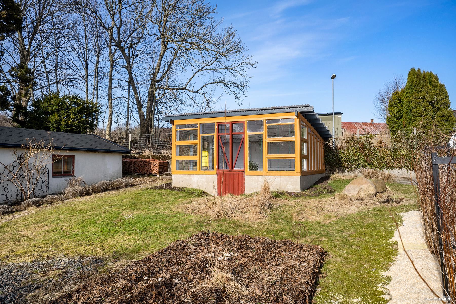 Bostaden omges av en inhägnad tomt och grönska, med utrymmen som växthus för den med intresse för odling och trädgård. På ett skyddat läge bakom bostaden finns även ett stort trädäck. Bilar parkeras smidigt på bostadens uppfart med gott om parkeringsyta. Det finns även garage.