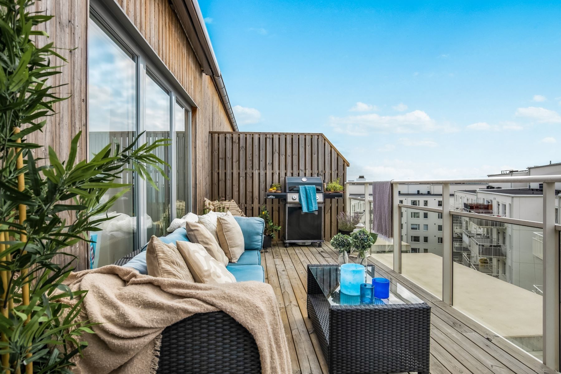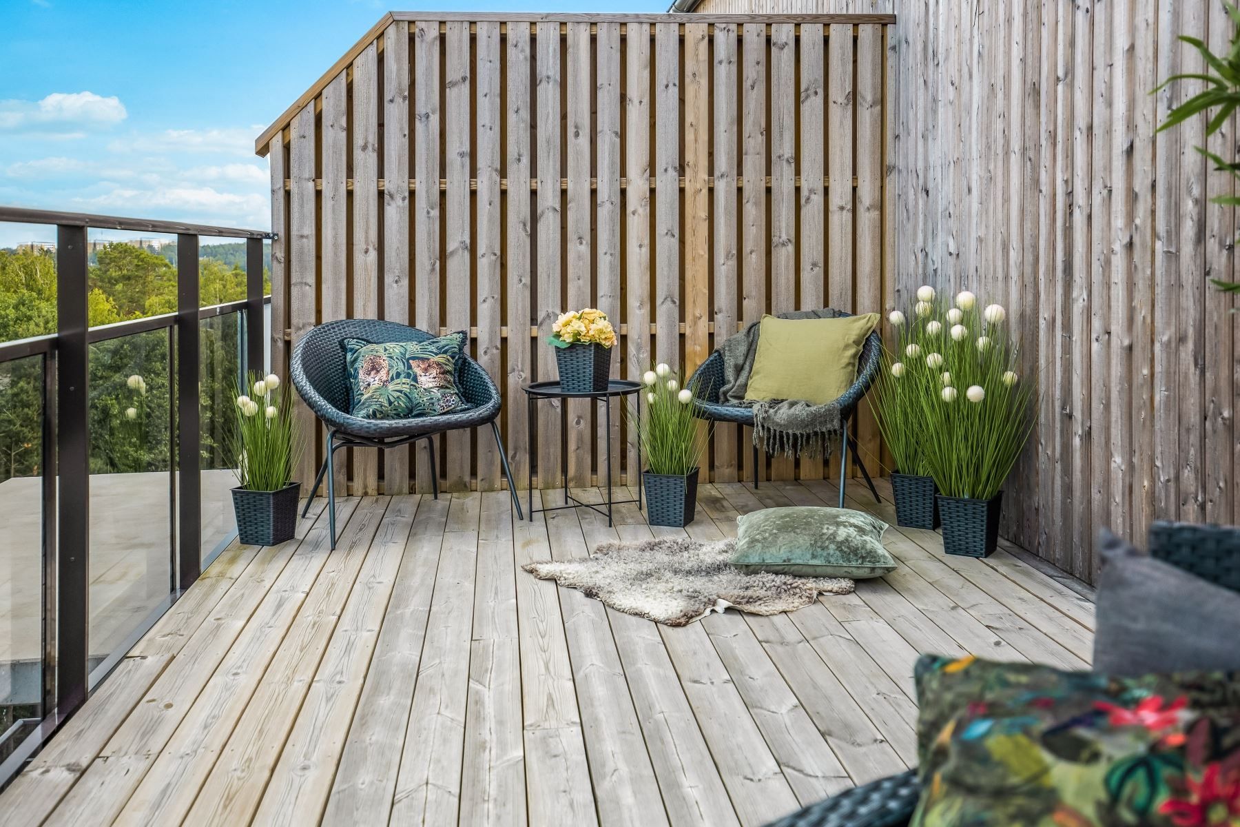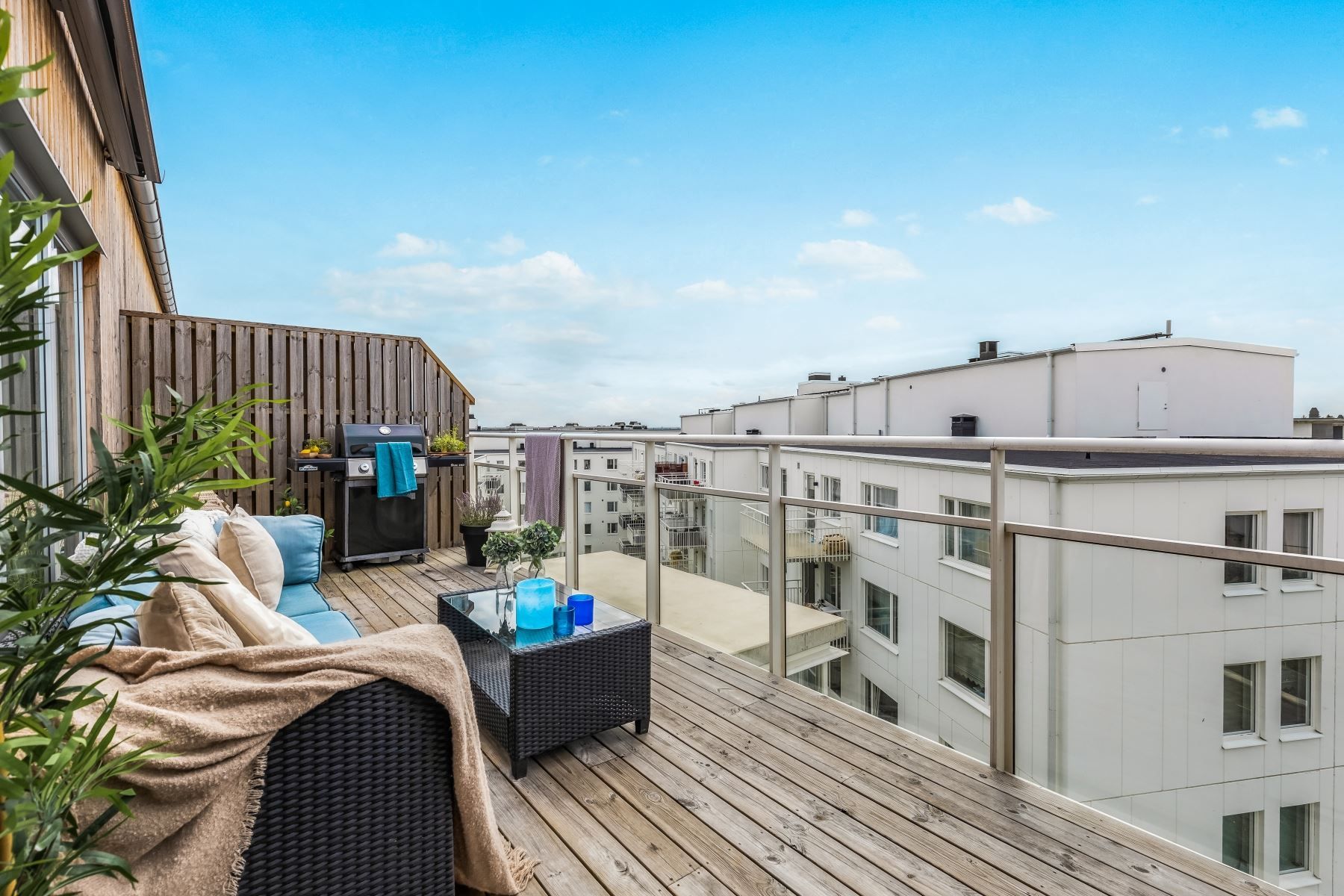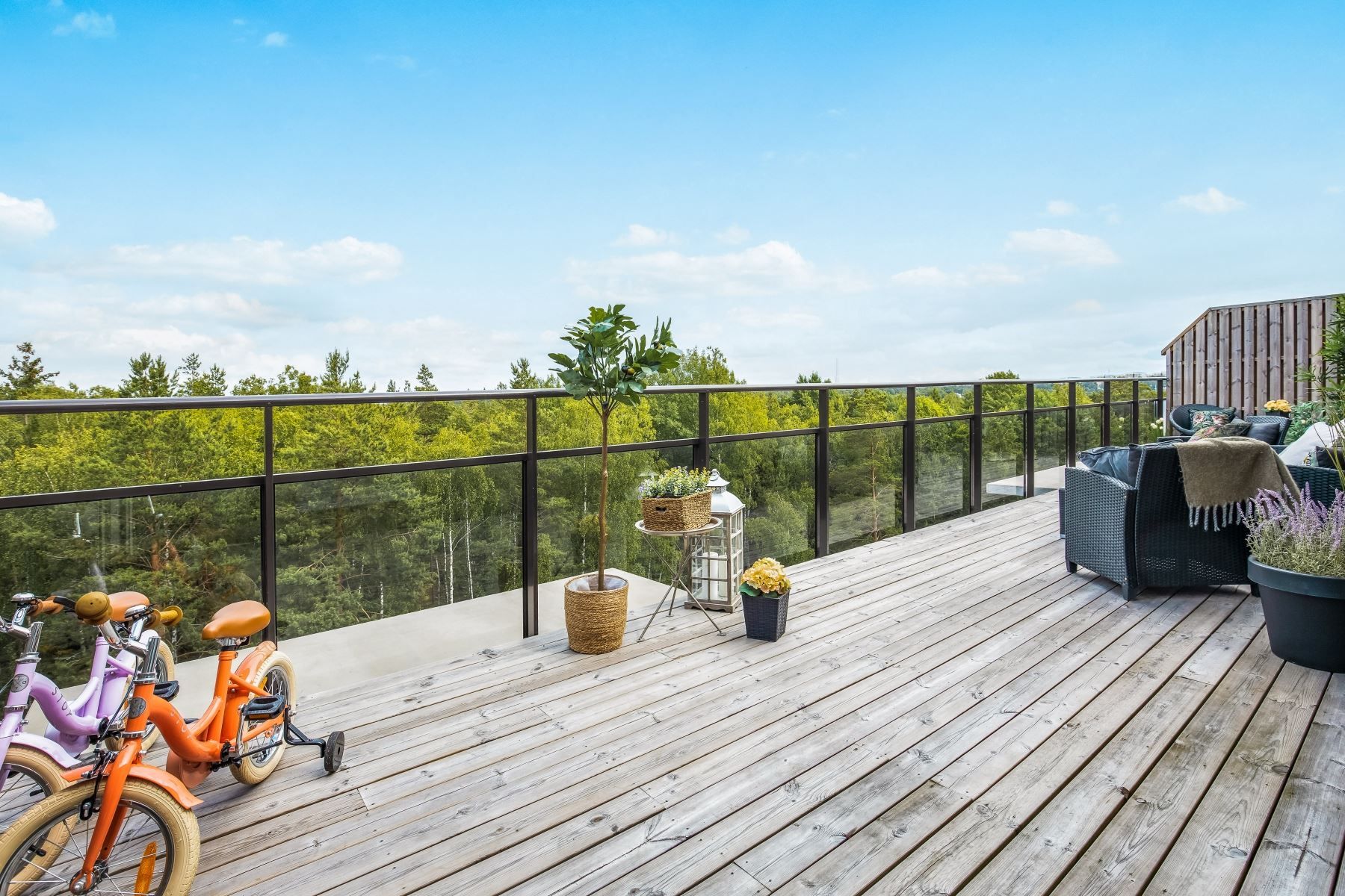 Njut av en helt fantastisk utsikt över omnejd och ogenerat belägen lägenhet högst upp i huset. En bostad att helt enkelt stormtrivas i. Två helt fantastiska terrasser om 29 kvm respektive 19 kvm där du kan möta våren och njuta hela sommaren vare sig du vill ha gassande sol eller njuta i skuggan med familj och vänner. Altanerna inbjuder till sol från tidiga gryning till solnedgång. Lägenheten inhyser ett ljust och modernt kök med sprishäll, ugn, inbyggd micro, spissfläkt och diskmaskin. Genomgående fina parkettgolv och ljusa färgval på väggarna. Badrum med golvvärme, handdukstork och tvättpelare. Rymlig klädkammare som idag är inredd till ett sovrum. Förråd finns i källaren. Upplevs bäst på plats, du kommer att förälska dig i denna lägenhet. Välkommen hem!