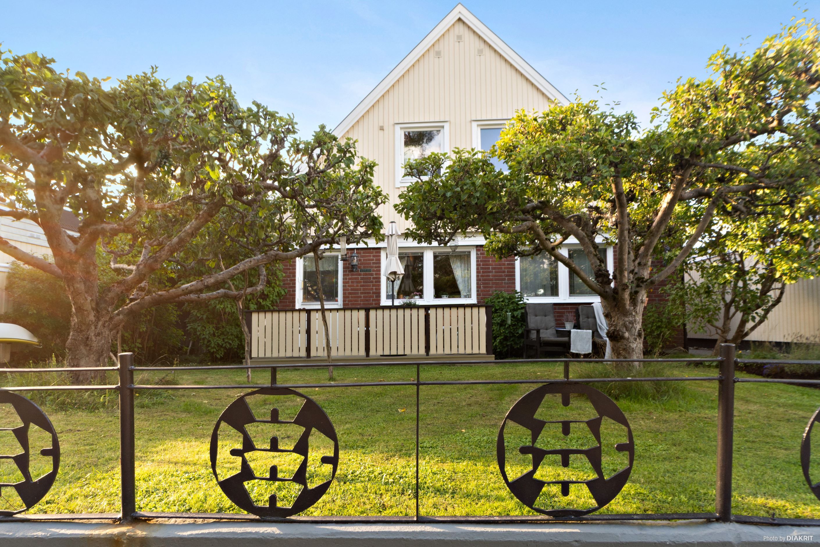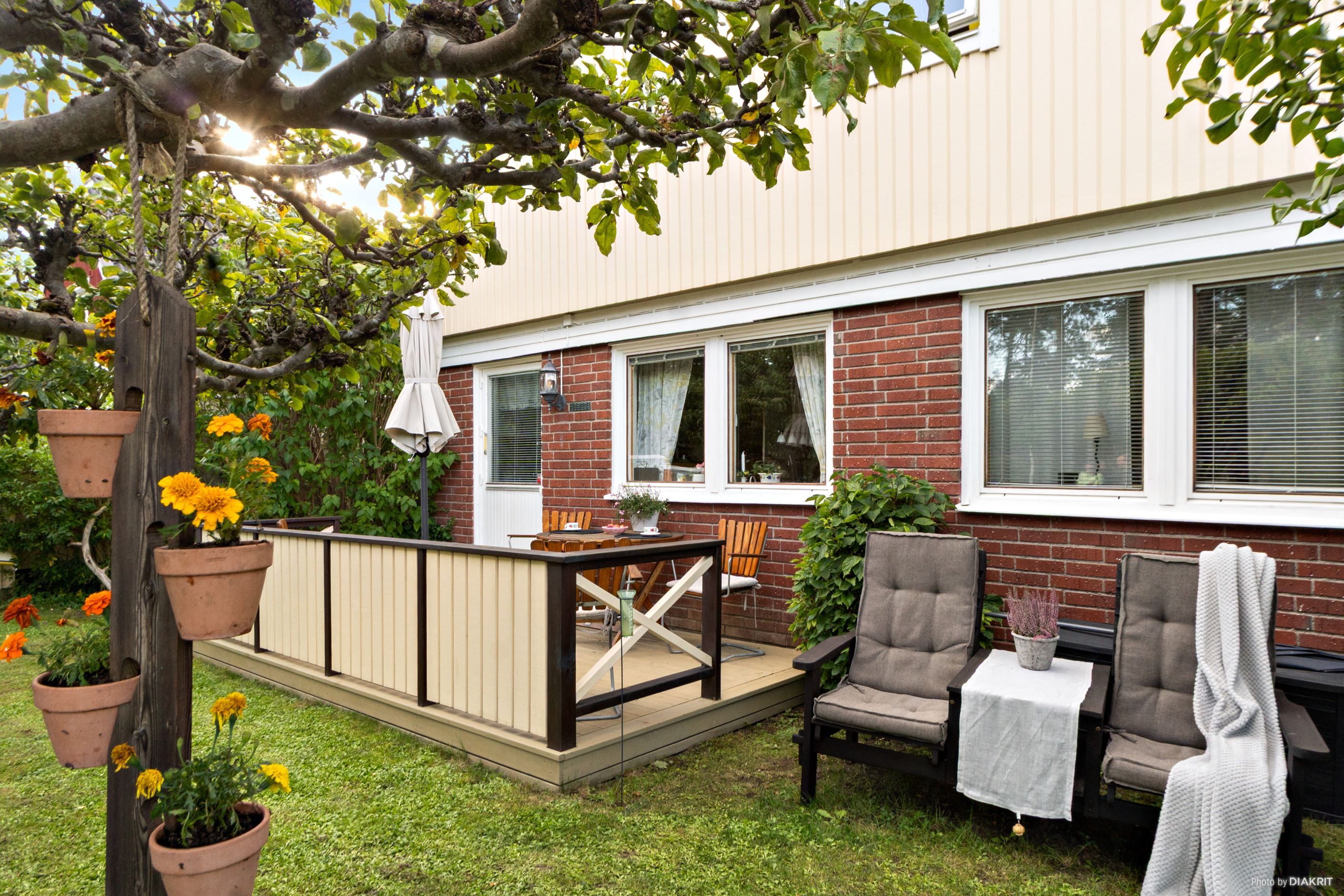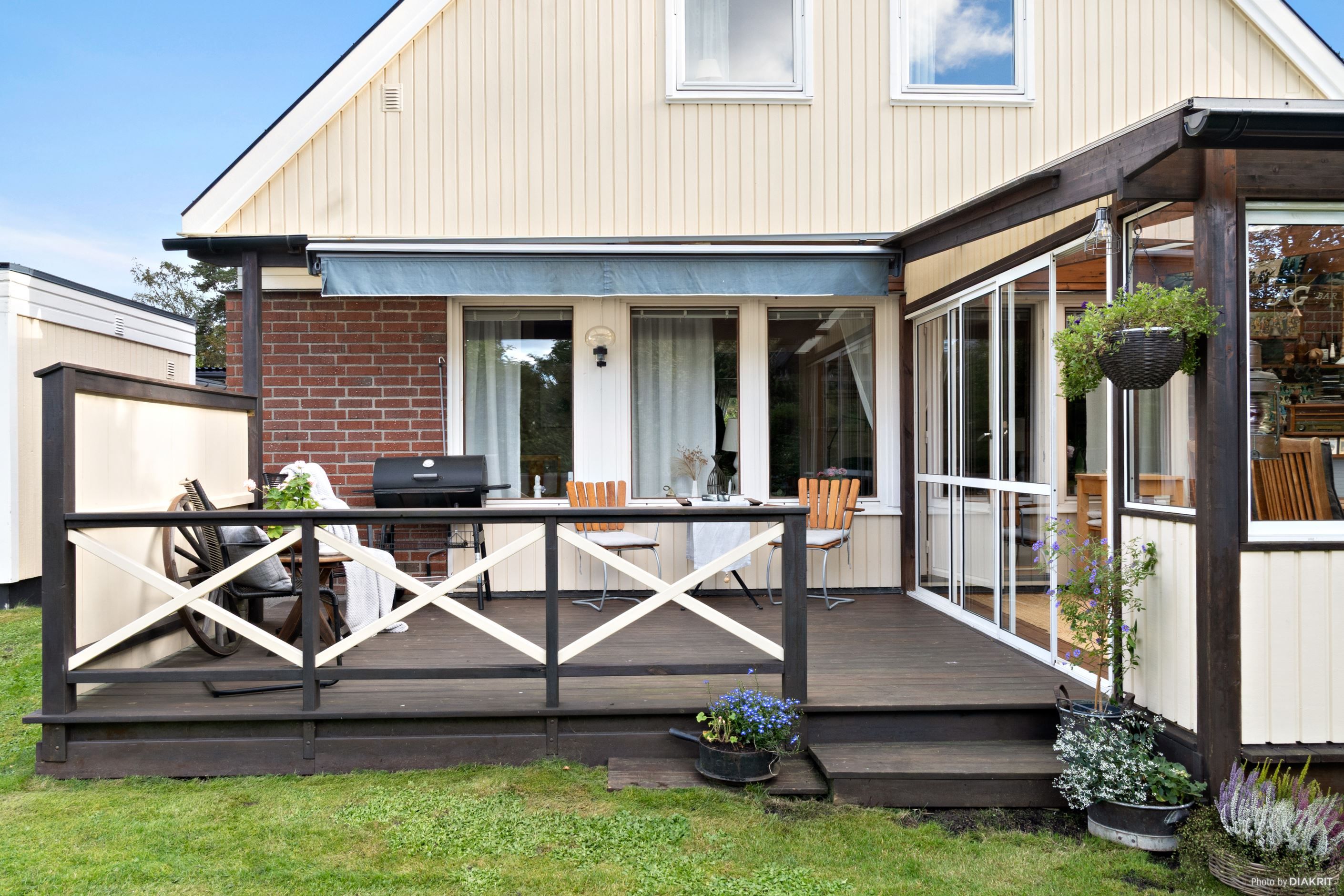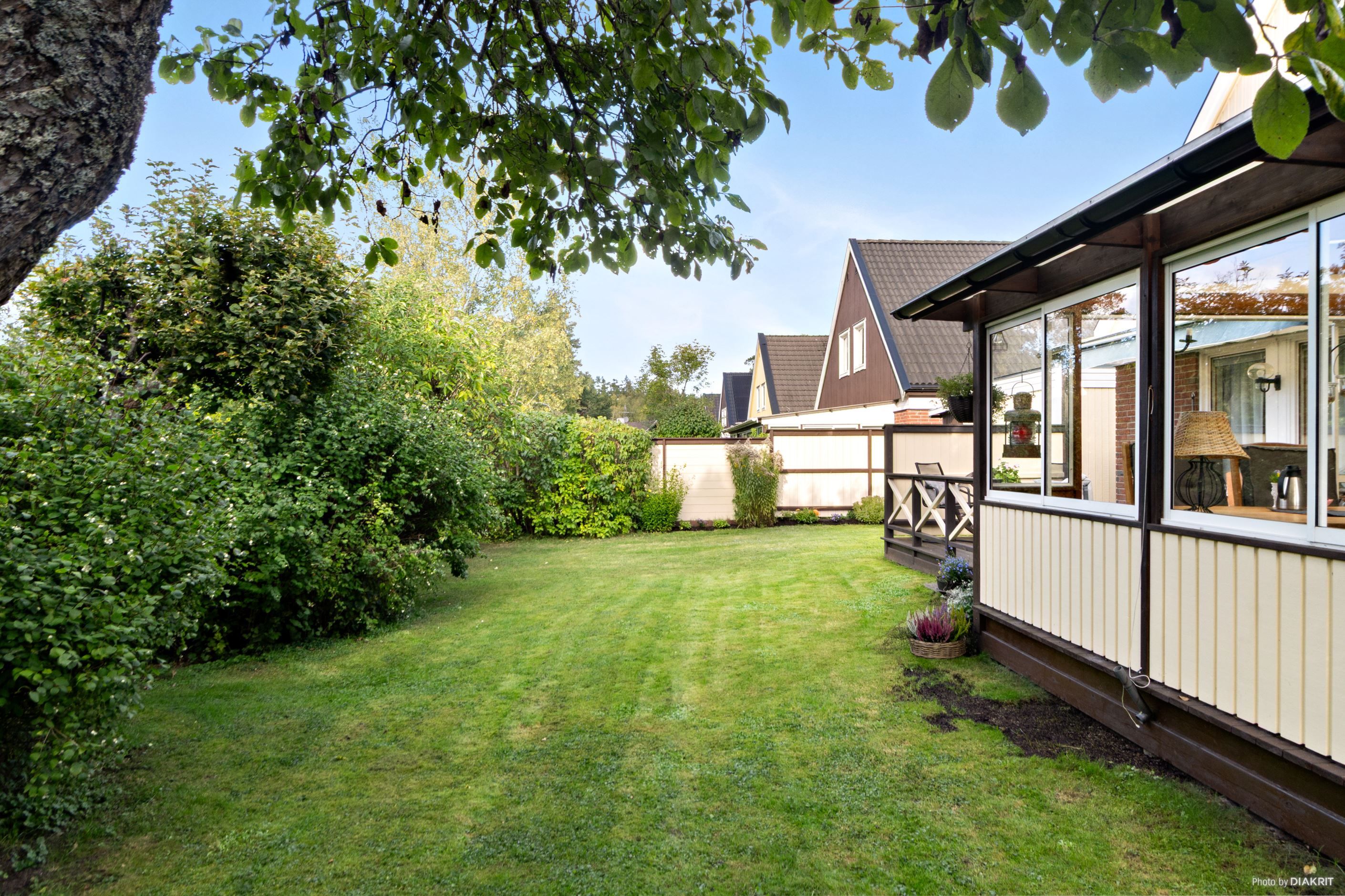 Den mycket välskötta trädgården är en grön oas med fruktträd, bärbuskar, syréner och fina gräsytor både på fram- och baksida. Här finns plats för lek, odling och avkoppling. Altanen på baksidan erbjuder fin kvällssol – perfekt för sommarens grillstunder – och den inglasade delen förlänger säsongen långt in på både vår och höst. Till fastigheten hör även garage och förråd.