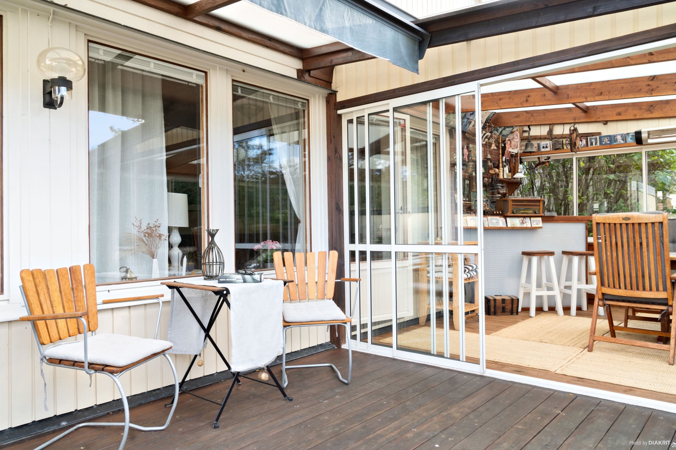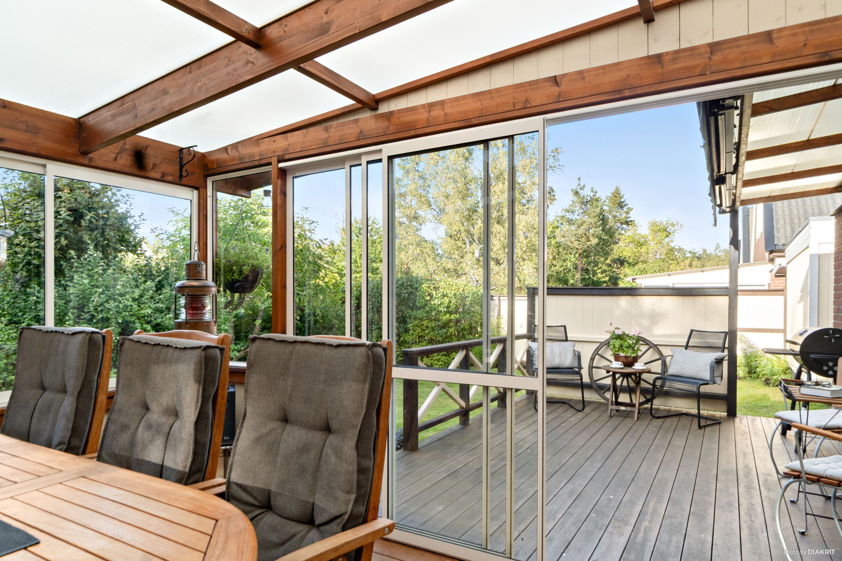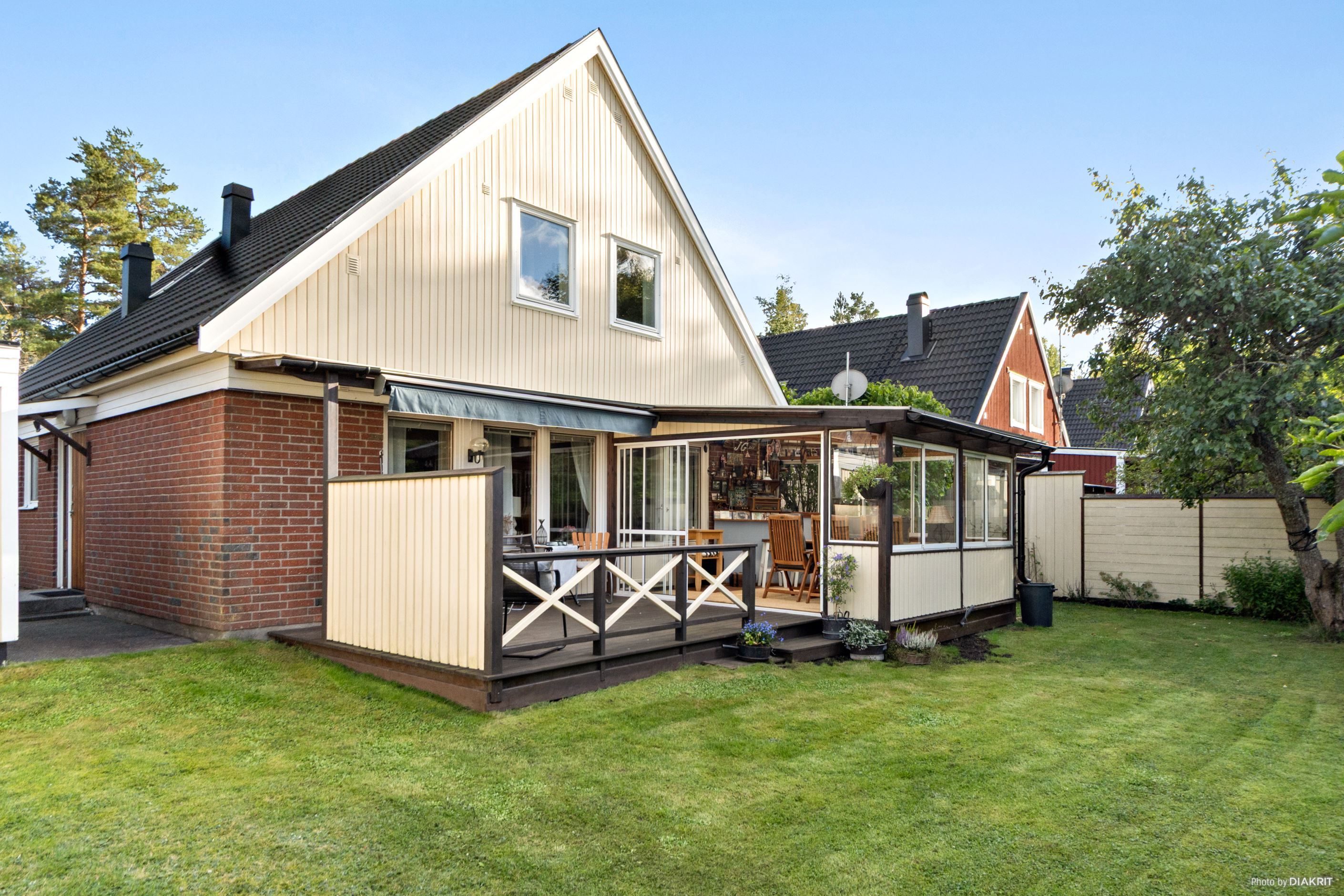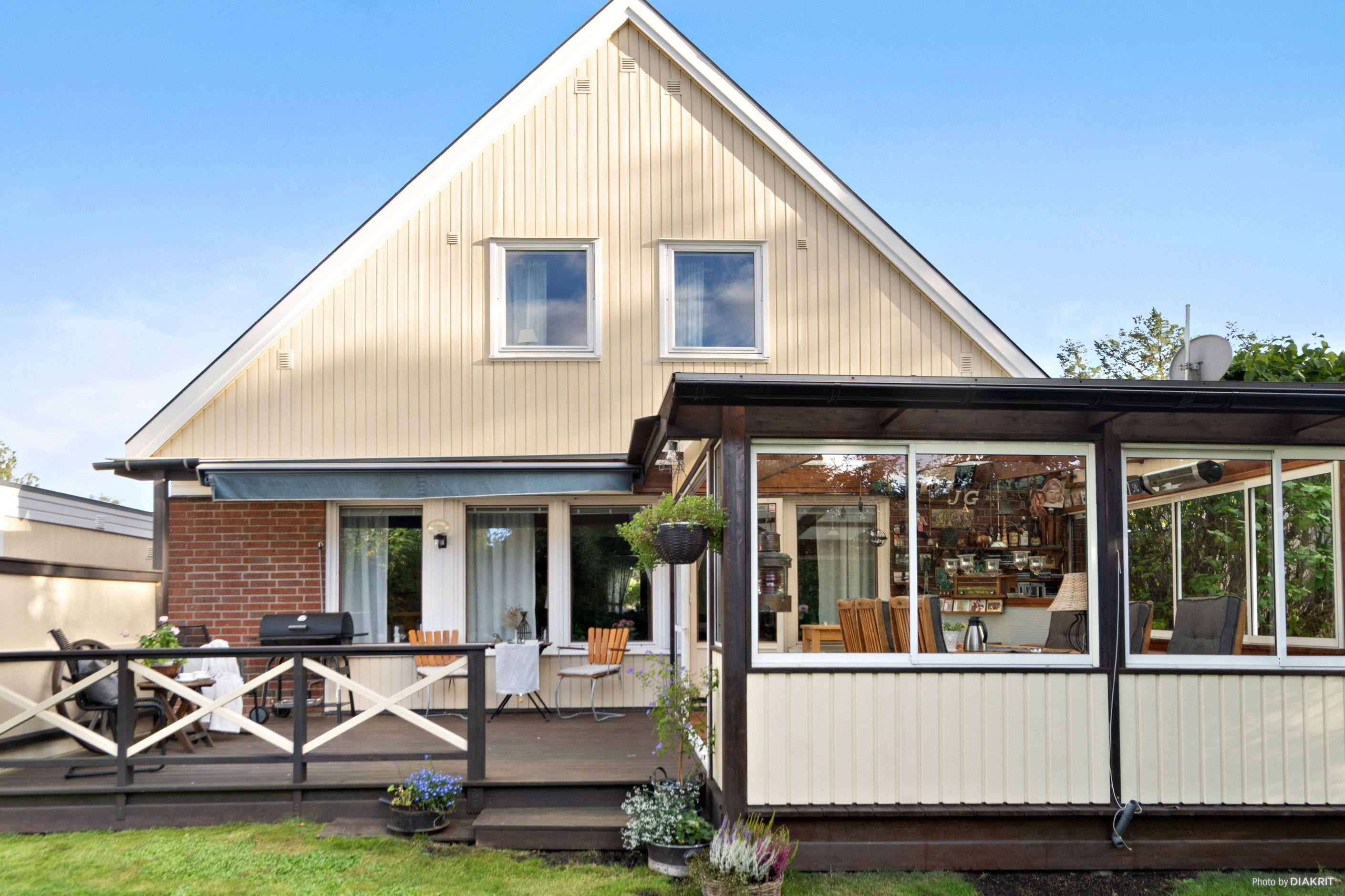 Husets planlösning är smart och väl avvägd med generösa utrymmen och goda förvaringsmöjligheter. Det ljusa vardagsrummet har stora fönsterpartier som släpper in rikligt med ljus och leder ut till en rymlig altan med inglasad uteplats i soligt västläge.