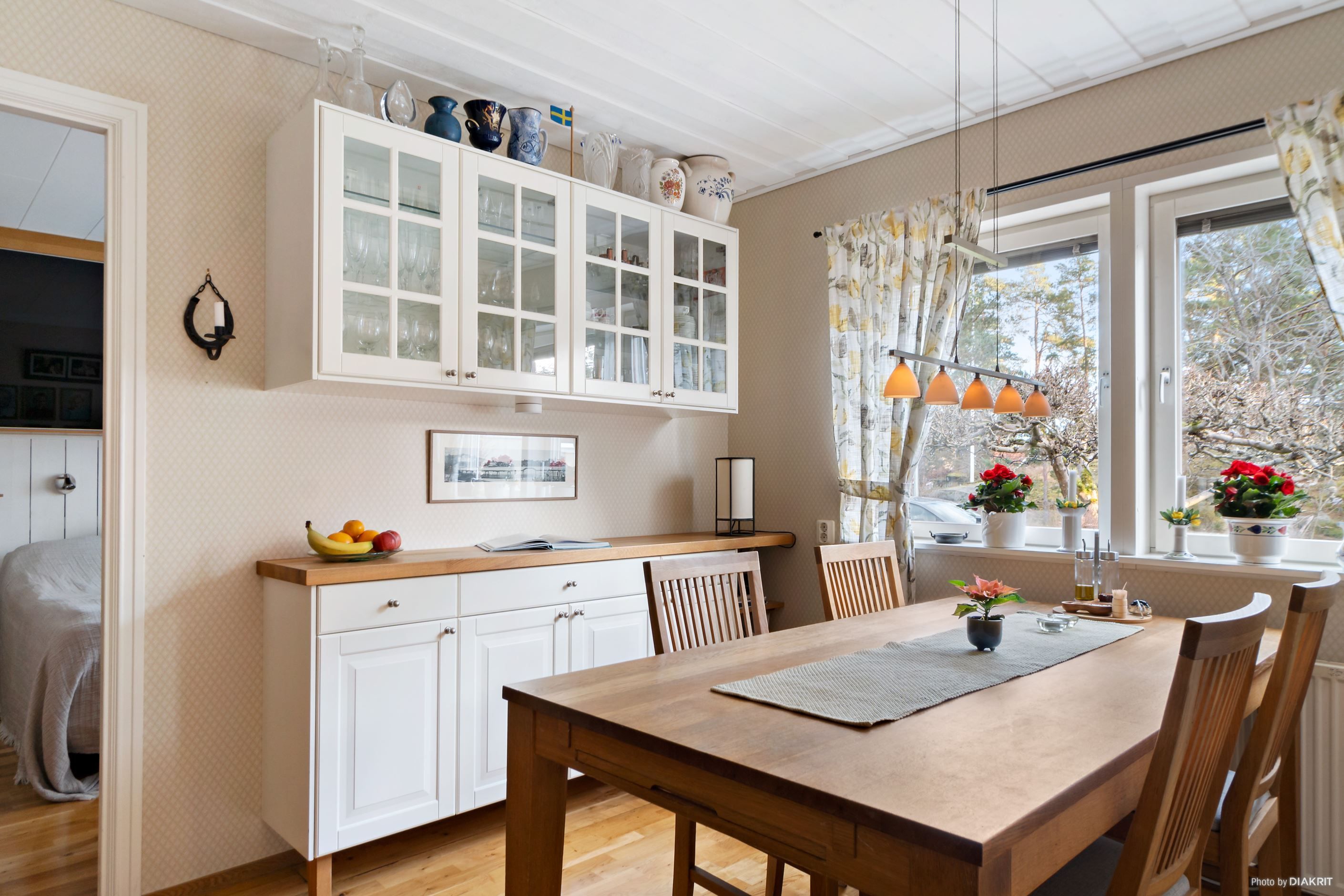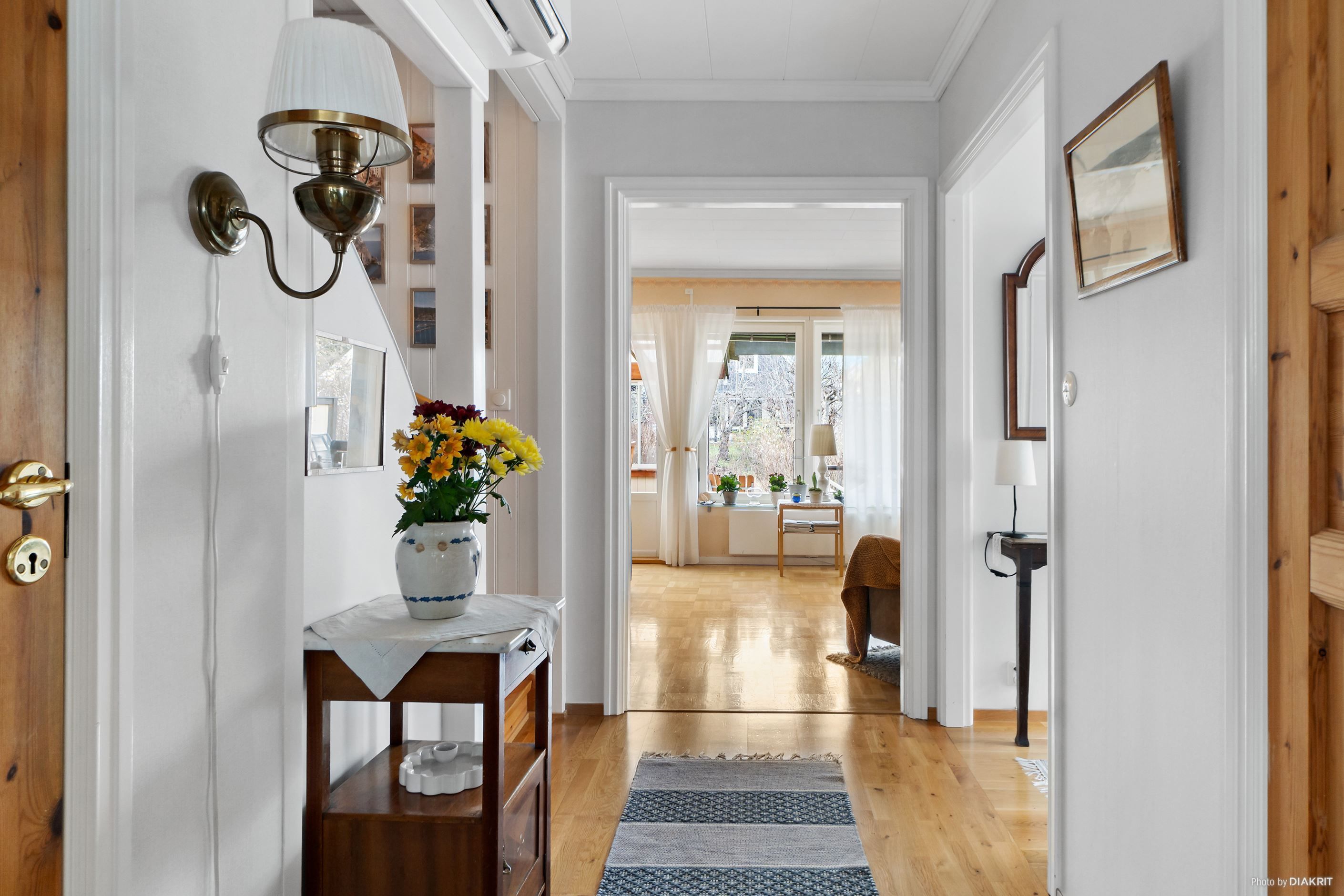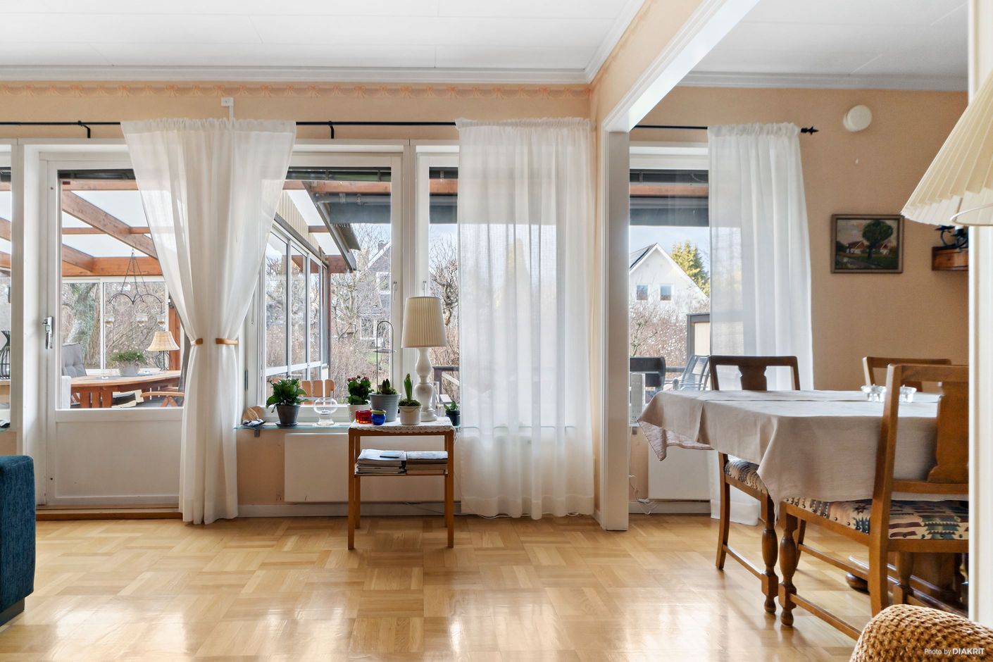 Husets planlösning är smart och väl avvägd med generösa utrymmen och goda förvaringsmöjligheter. Det ljusa vardagsrummet har stora fönsterpartier som släpper in rikligt med ljus och leder ut till en rymlig altan med inglasad uteplats i soligt västläge.