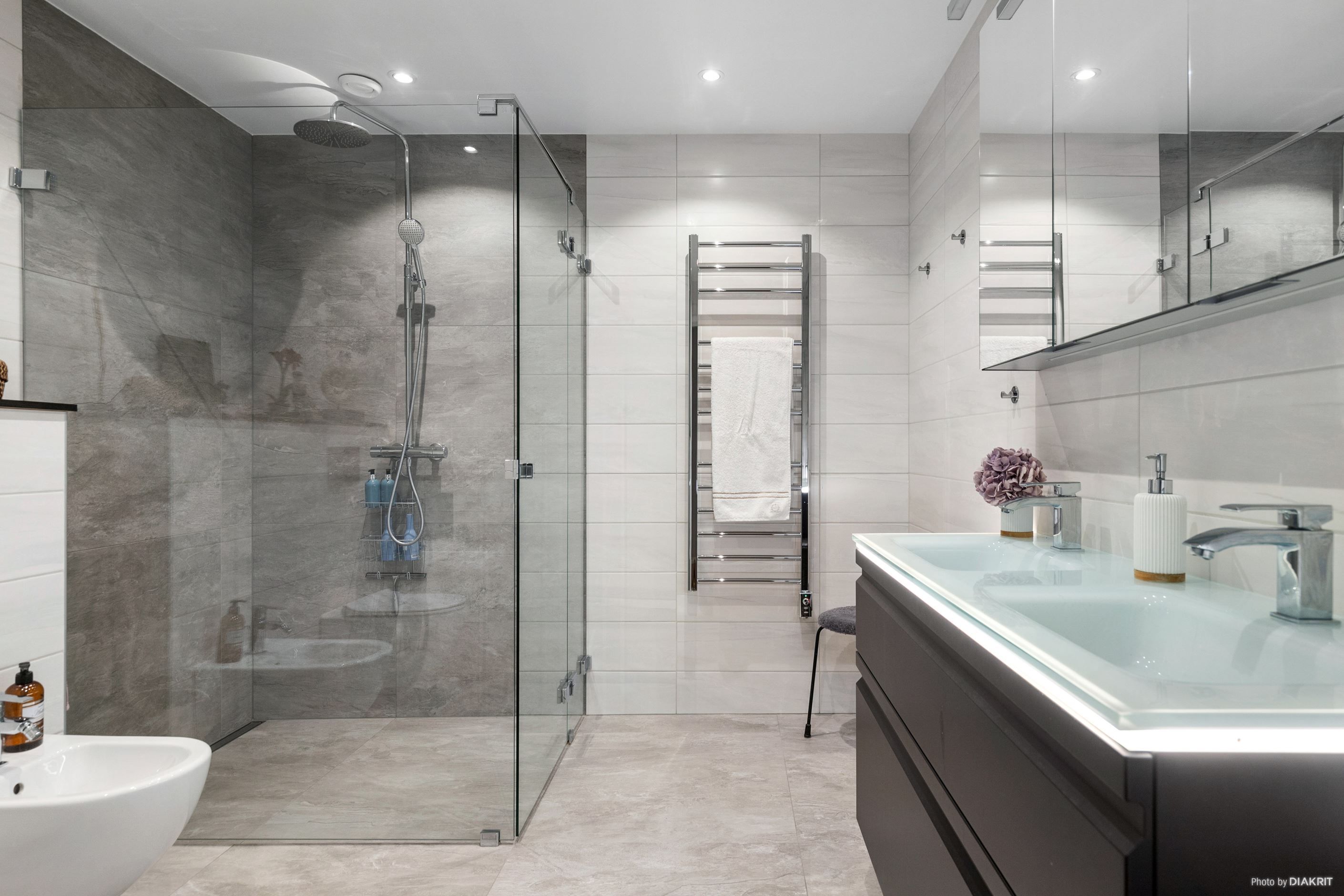 Det stora badrummet är renoverat med exklusiva detaljer – här finns en stor dusch och smakfulla ytskikt som ger en lyxig hotellkänsla. Köket är modernt och fullt utrustat med högkvalitativa vitvaror, god arbetsyta och plats för både vardagsmiddag och festliga tillställningar.