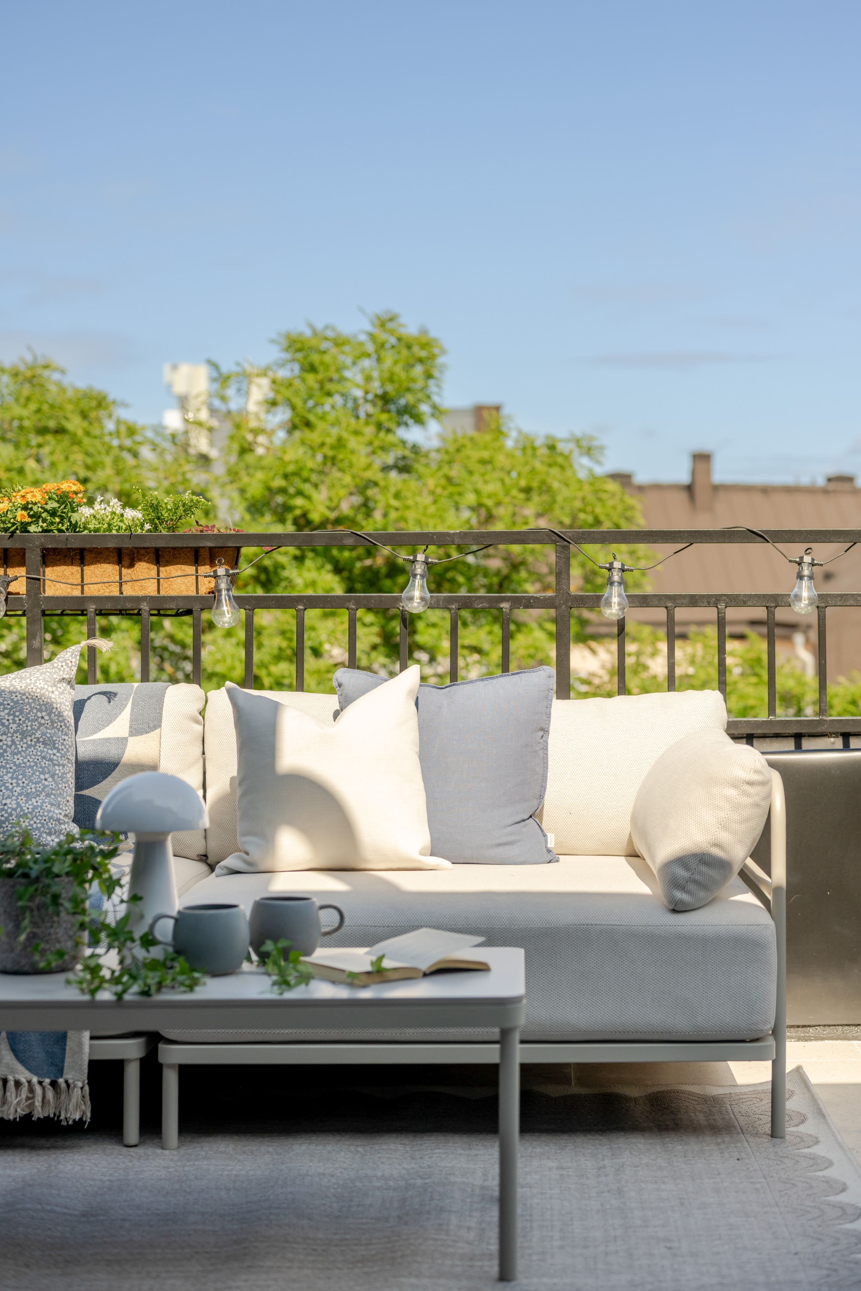 Den stora terrassen i soligt läge blir en naturlig förlängning av vardagsrummet och en perfekt plats för avkoppling, odling eller middagar i det fria. Lägenheten har genomgående ljusinsläpp, vilket förstärker känslan av rymd och harmoni.