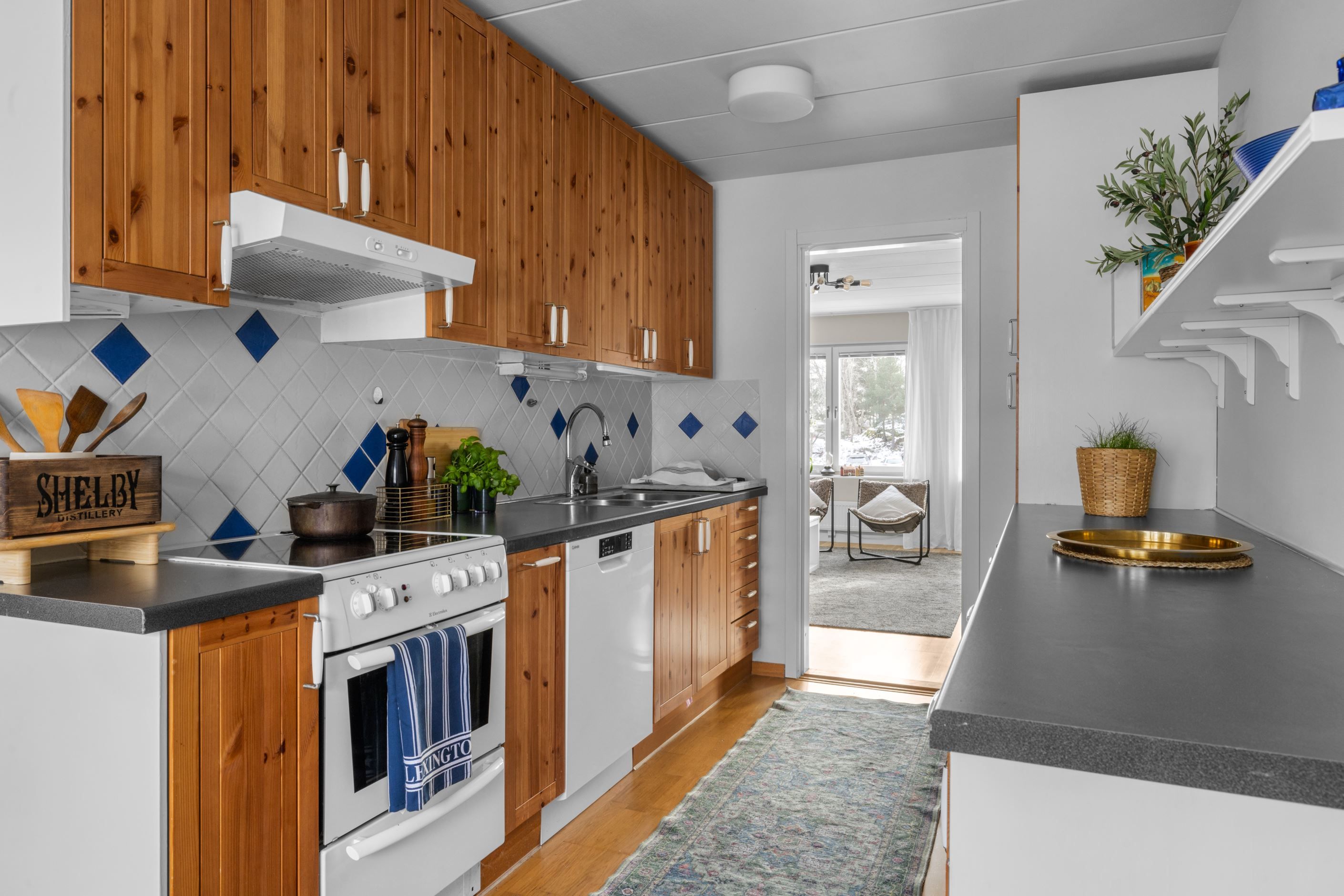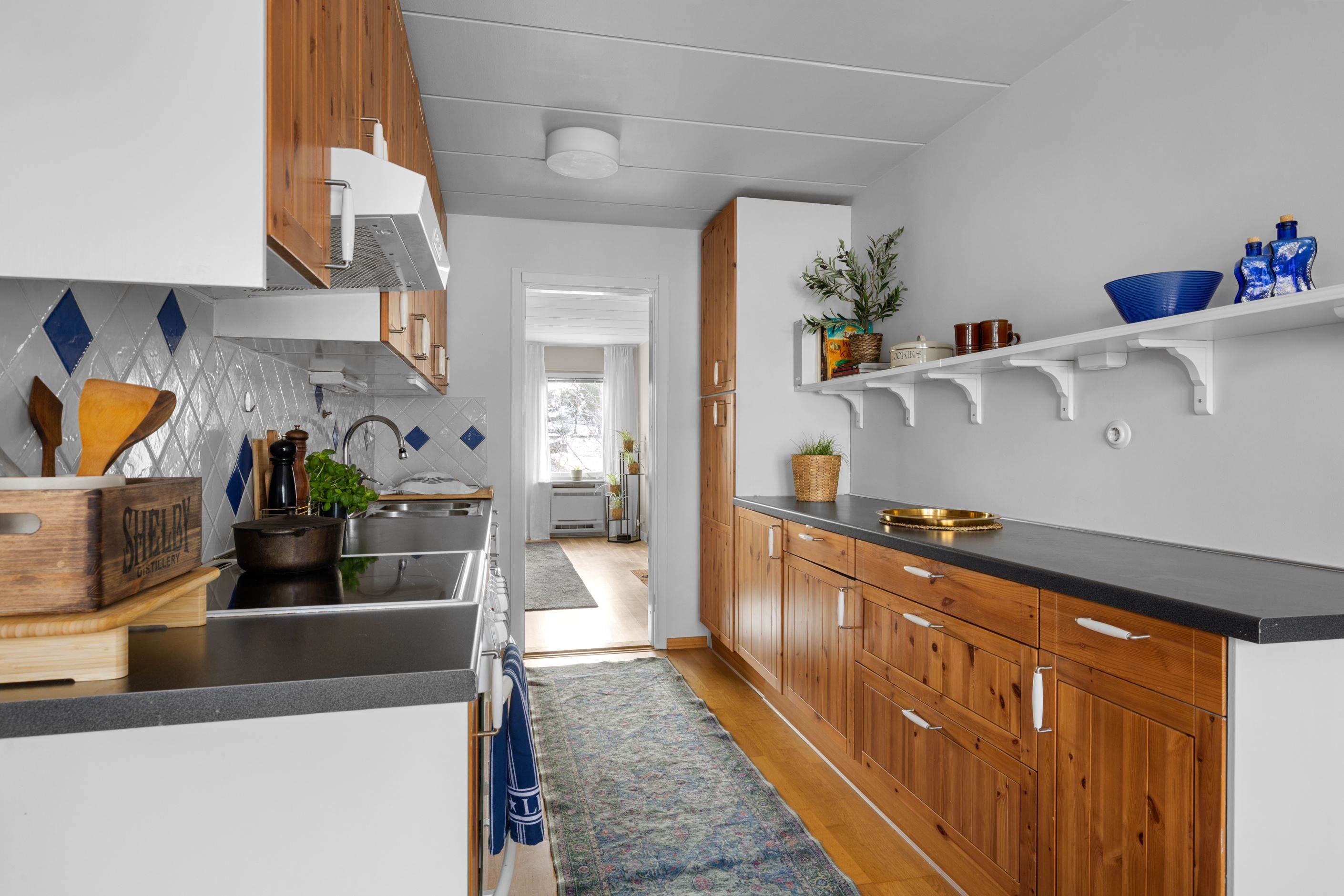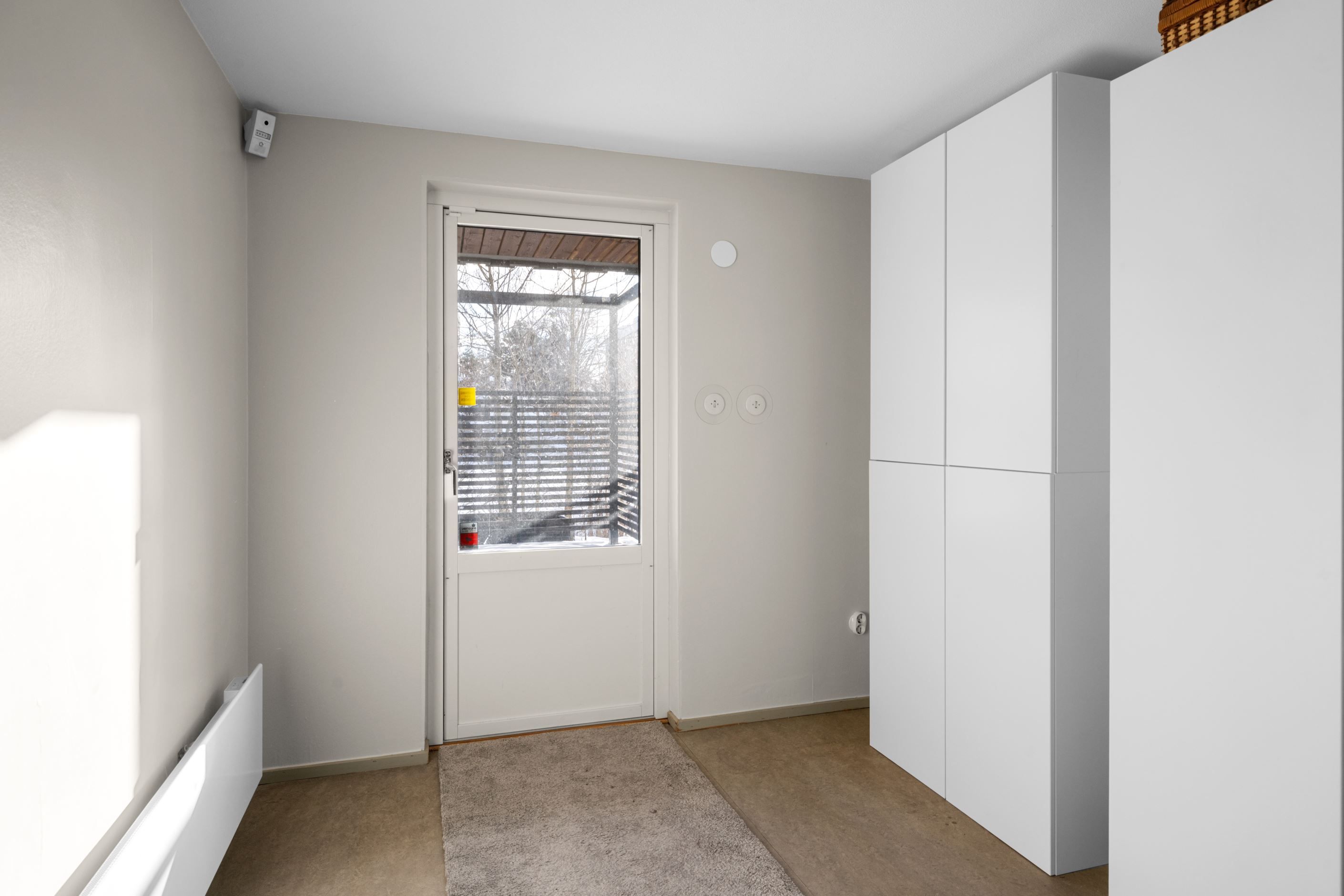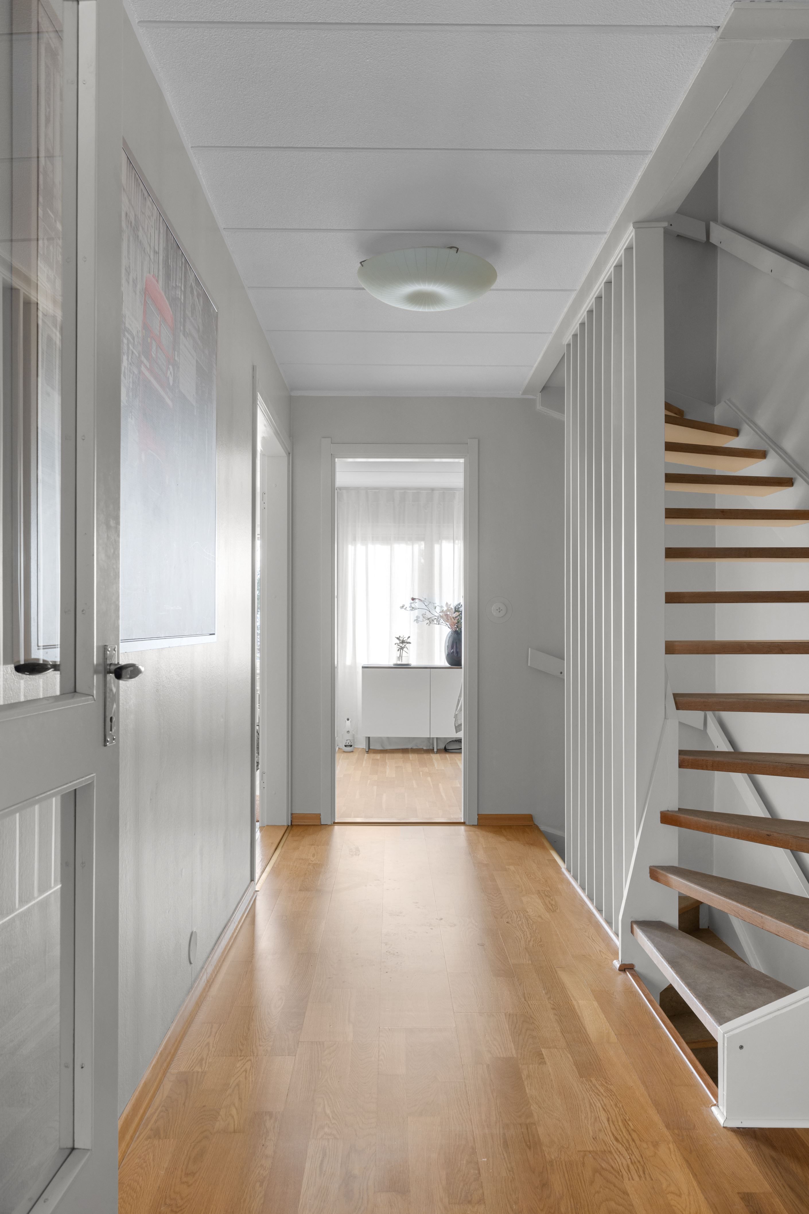 När ni kliver in möts ni av en välkomnande hall med generöst utrymme för förvaring, ett praktiskt skafferi och en WC. Vidare erbjuds ett dubbelsidigt kök i anslutning till vardagsrummet, vilket skapar en trevlig plats för matlagning och samvaro. Intill köket finner ni även tvättstugan. Via köket kan man gå ut till altanen på framsidan. Huset har rikligt med ljusinsläpp via dem väl tilltagna fönsterpartierna och ett högt och fritt läge som tillåter ljuset flöda fritt in i bostaden.