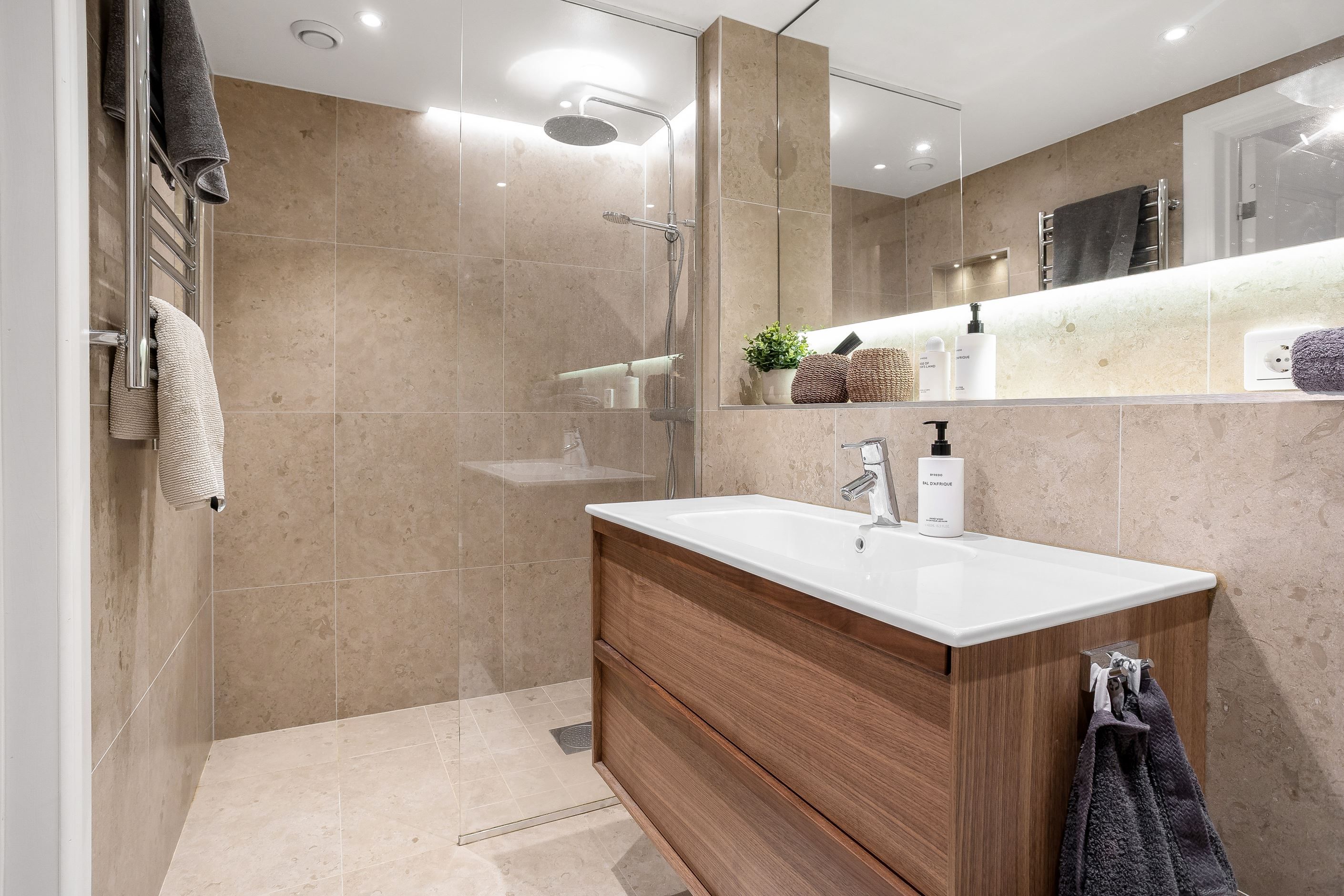 DUSCHRUM av hög klass med svängbar duschvägg. Helkaklade väggar med underhållsfria keramiska plattor 45x 45 cm med marmorlook i beige ton. Klinkergolv med enhetligt material samt golvärme (el). Vägghängd WC från Duravit med dubbla spolfunktioner. Kommod samt badrumsskåp i valnötsfaner med integrerad belysning, spegel samt rakuttag. Inbyggda spotlights i tak med dimmer. Handdukstork. Kombinerad tvättmaskin/torktumlare. Golvvärme.