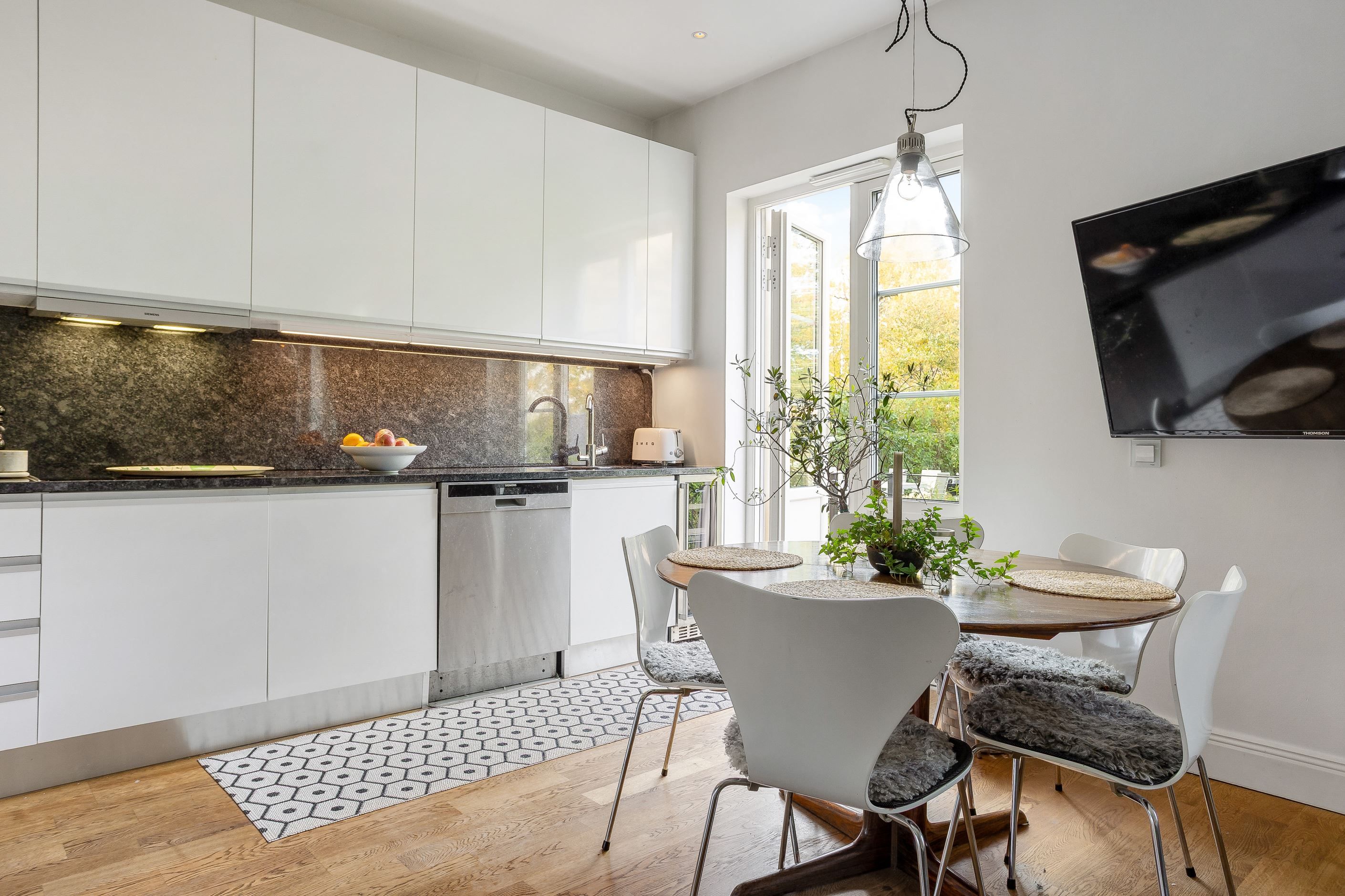 Köket erbjuder plats för matbord, vilket på ett naturligt vis delar ytorna.