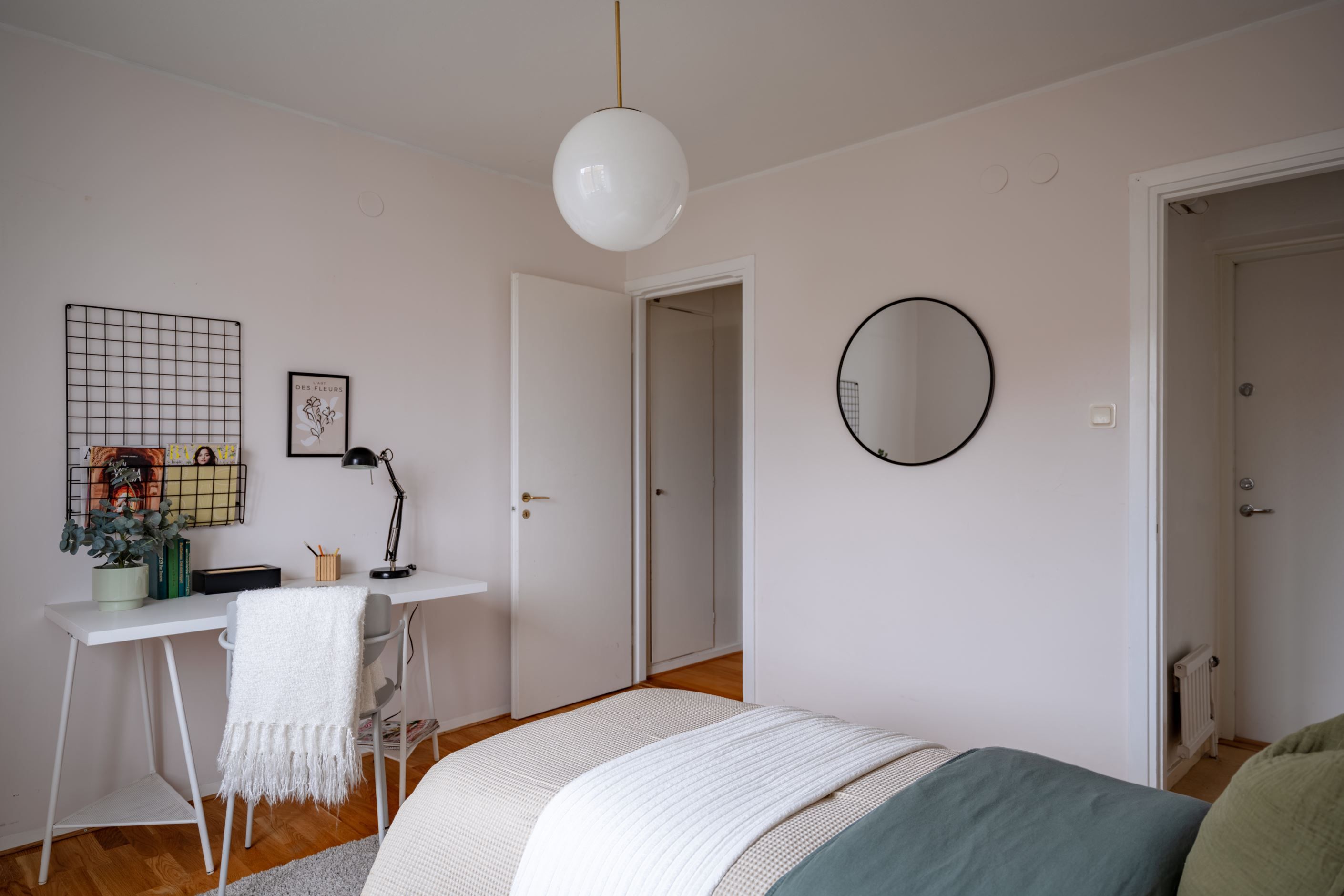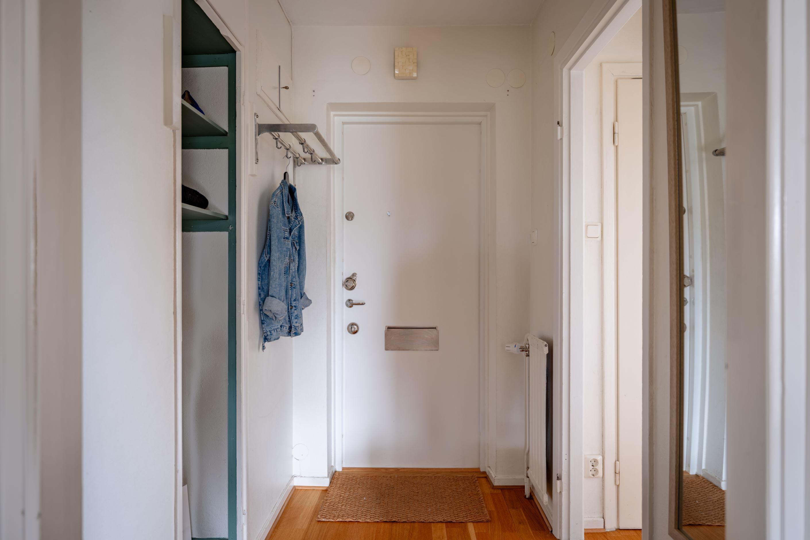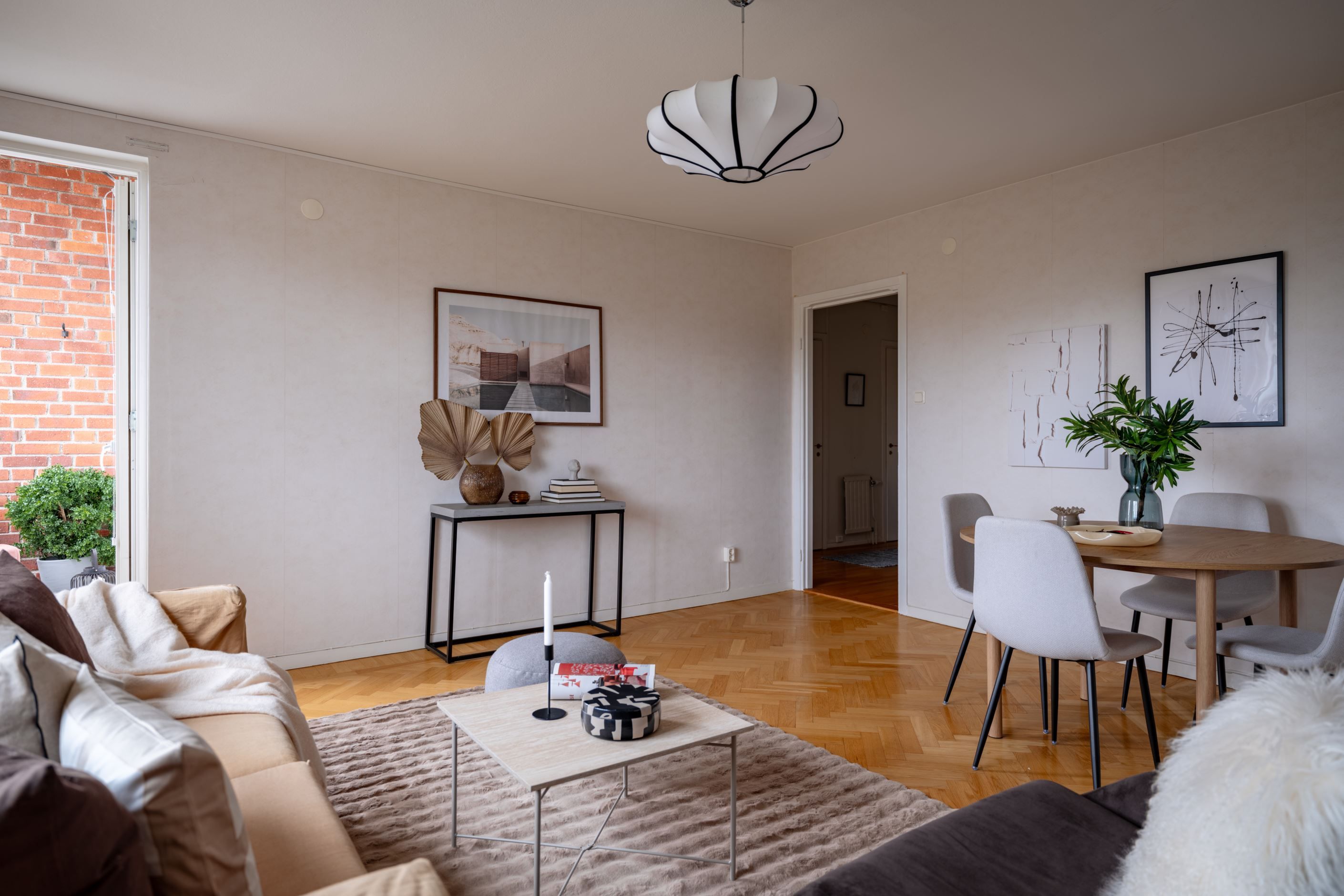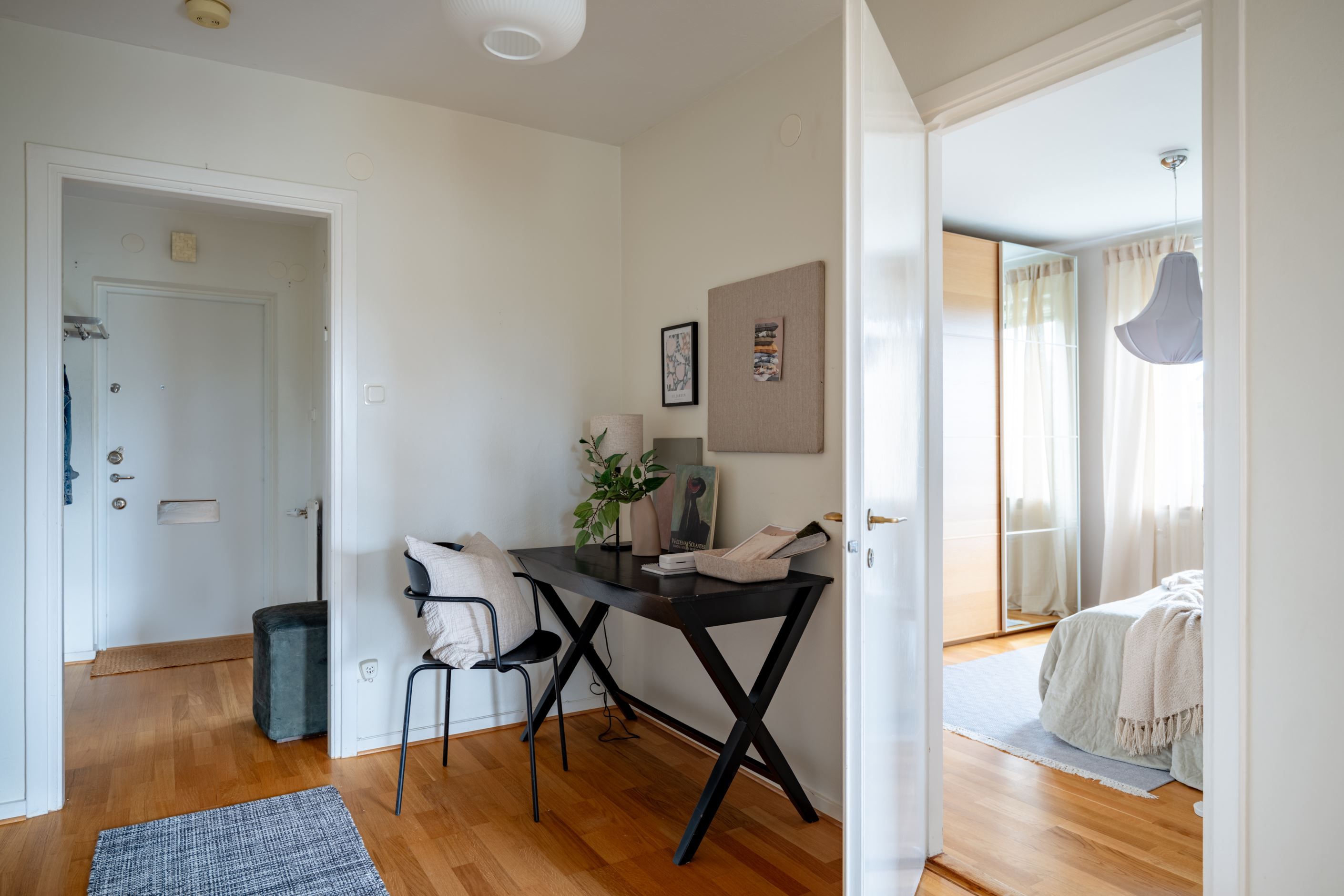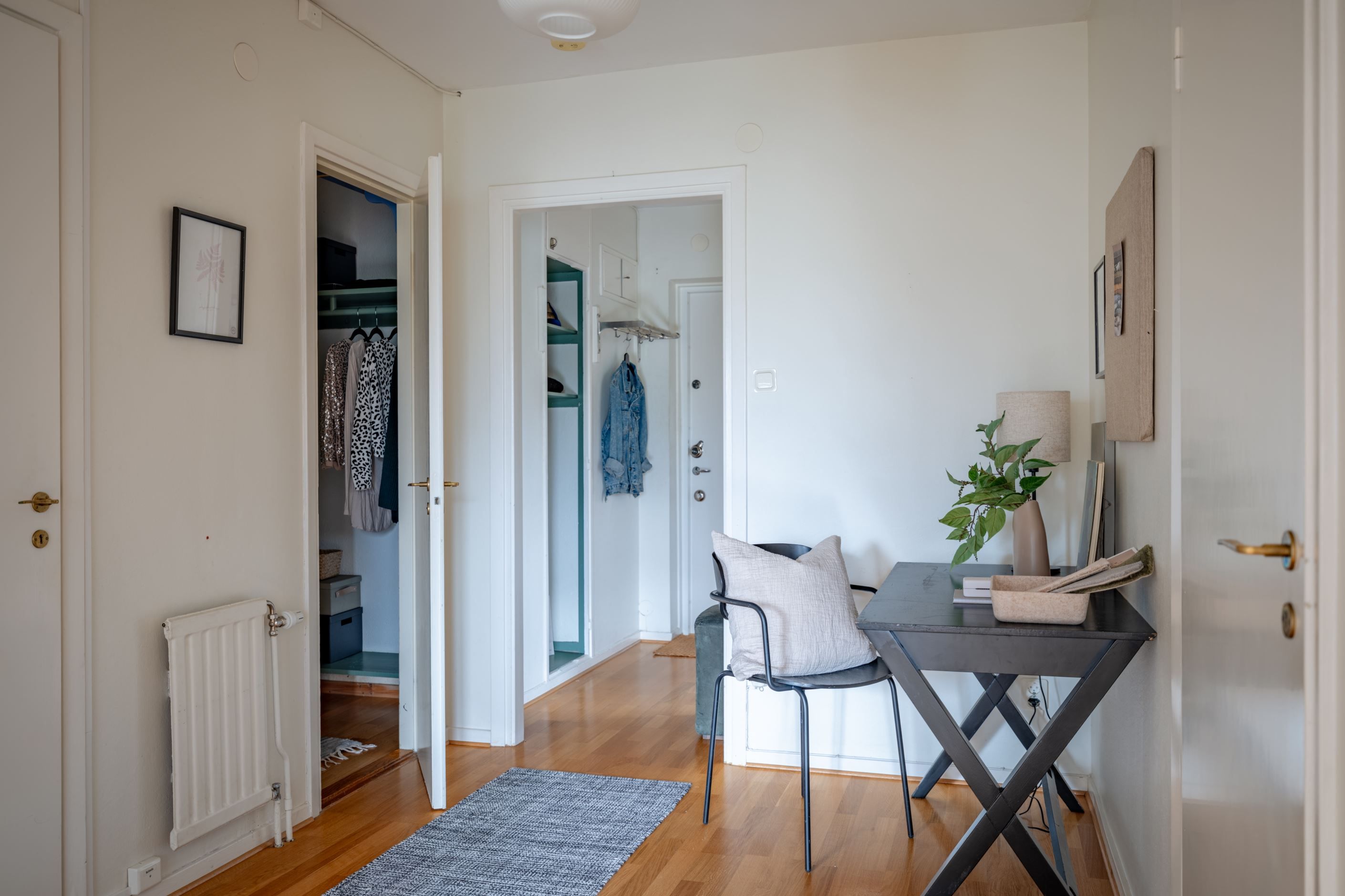 Lägenhetens planlösning är både genomtänkt och flexibel. Det stora vardagsrummet ger plats för både soffgrupp och matsalsdel, medan köket har utrymme för ett matbord vid fönstret. För den som önskar går väggen mellan kök och vardagsrum att ta ner och skapa en modern, social planlösning. Två rymliga sovrum rymmer enkelt dubbelsäng och garderober, och i den inre hallen finns utrymme för läshörnan eller en praktisk arbetshörna. Lägenheten har dessutom dubbla ingångar, vilket möjliggör en separat uthyrningsdel – en extra fördel för dig som vill kombinera ett bekvämt boende med smart ekonomi.
