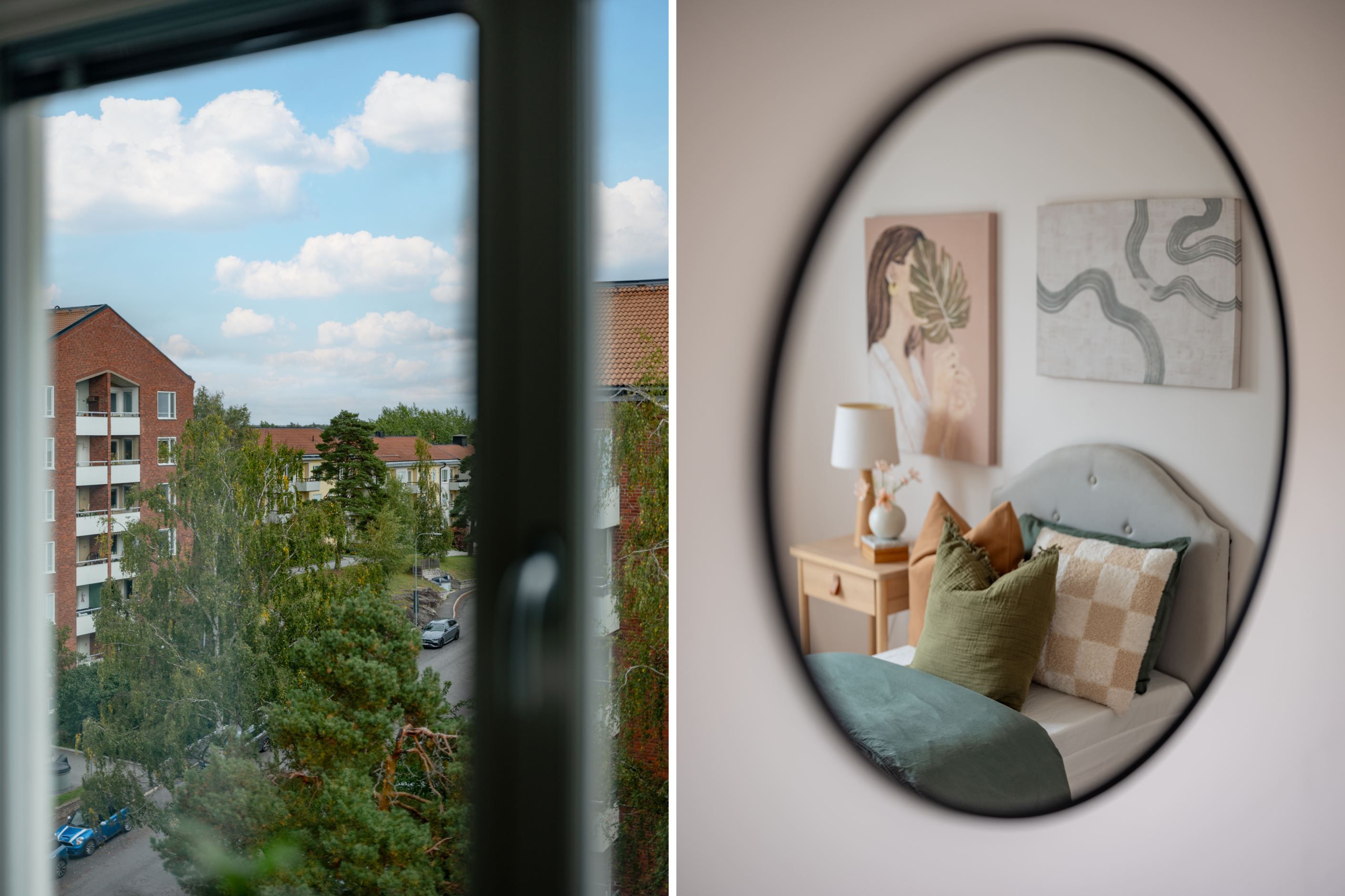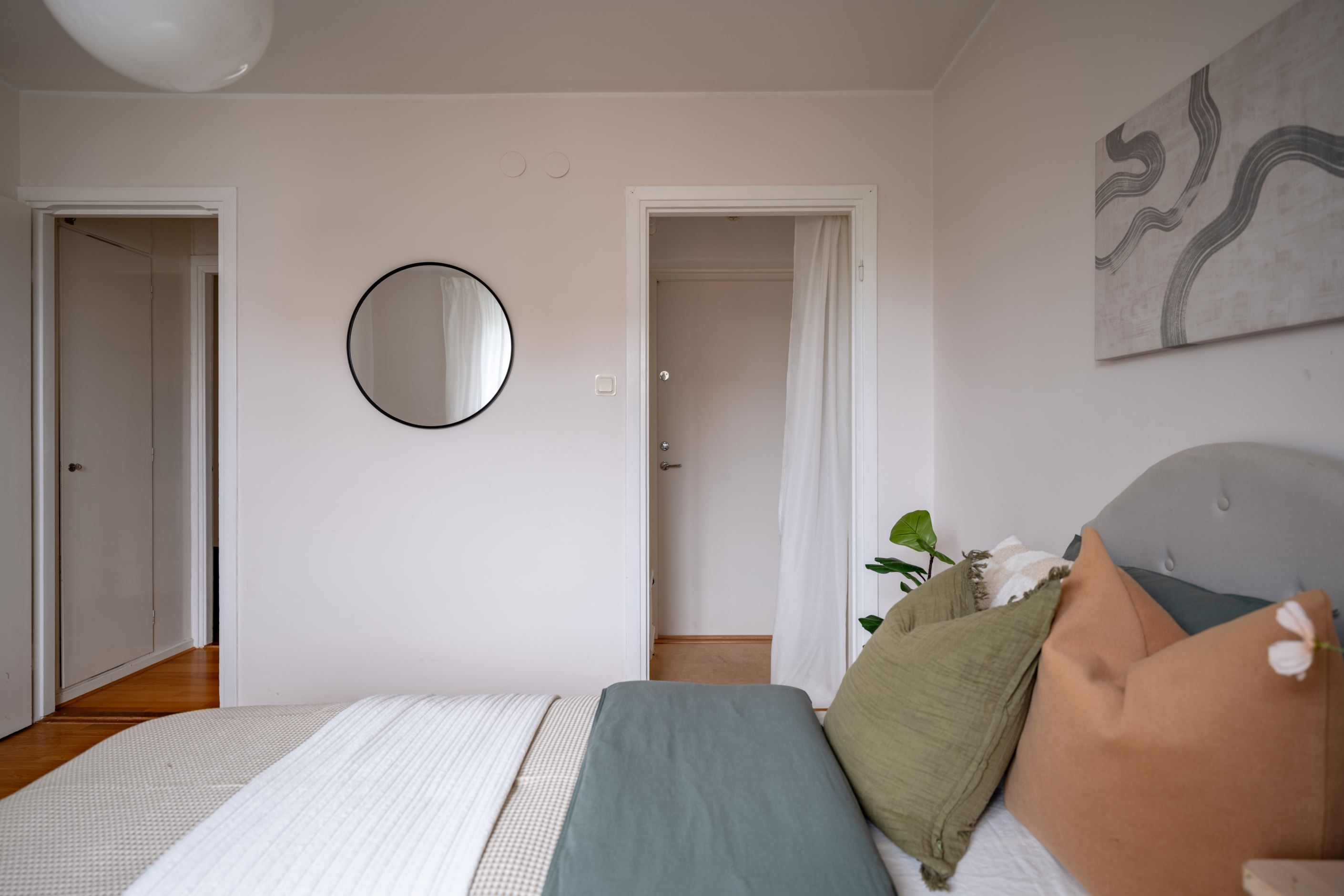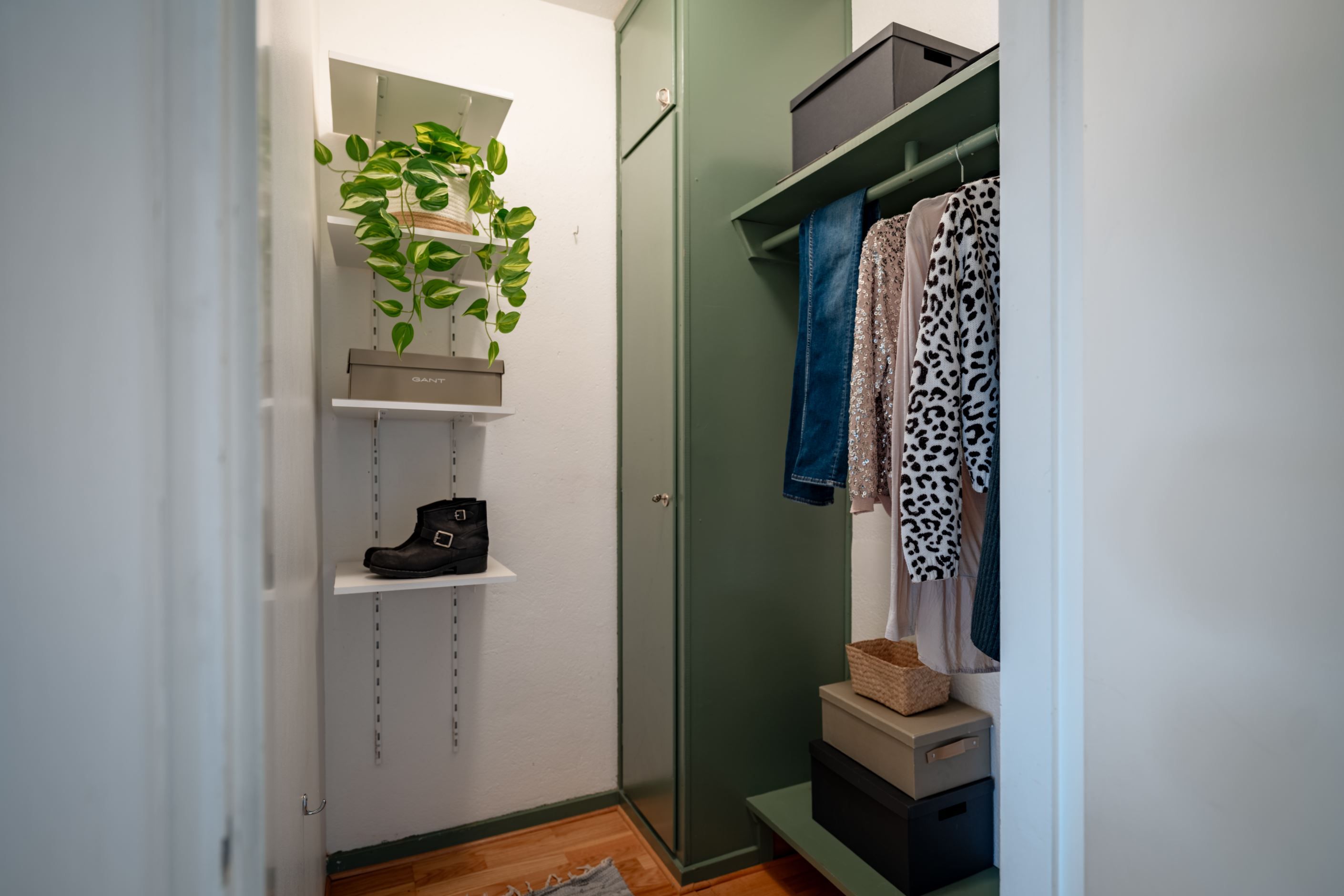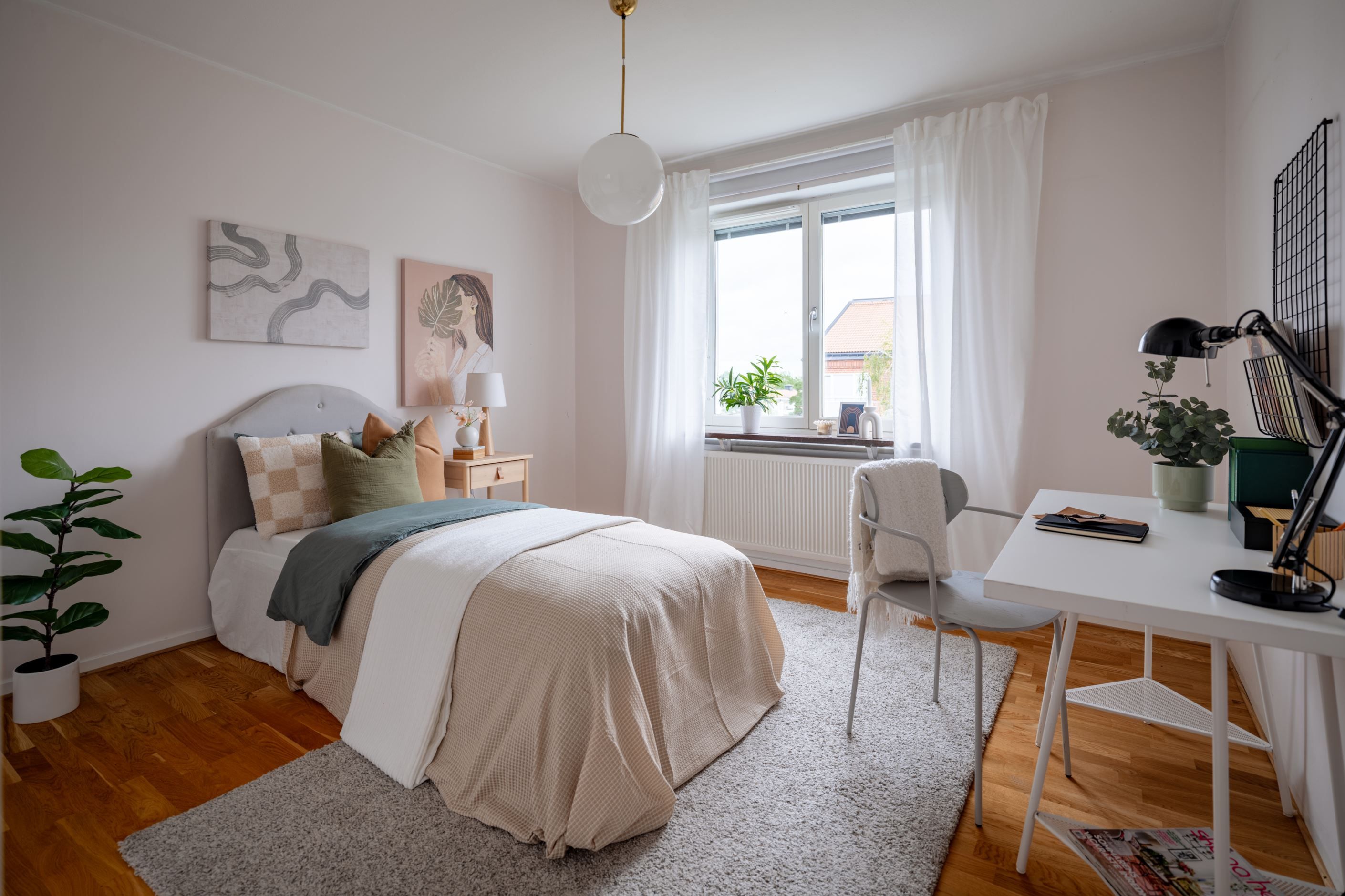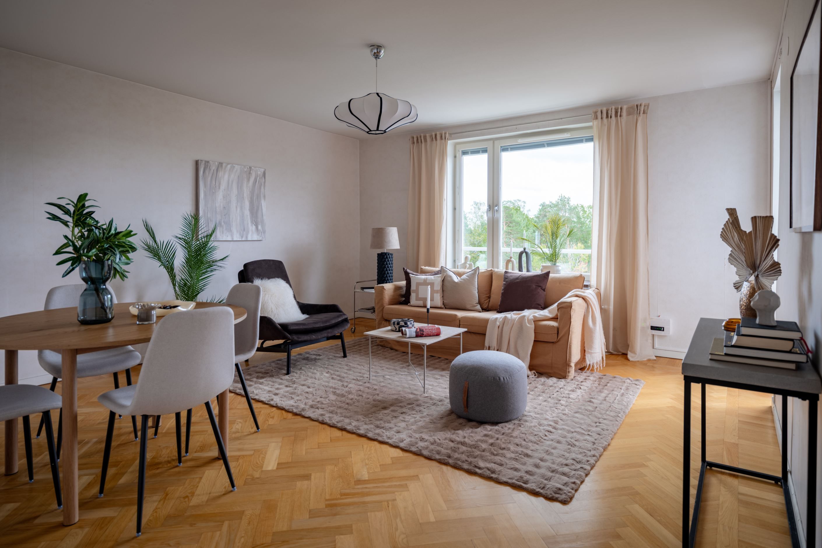 Lägenhetens planlösning är både genomtänkt och flexibel. Det stora vardagsrummet ger plats för både soffgrupp och matsalsdel, medan köket har utrymme för ett matbord vid fönstret. För den som önskar går väggen mellan kök och vardagsrum att ta ner och skapa en modern, social planlösning. Två rymliga sovrum rymmer enkelt dubbelsäng och garderober, och i den inre hallen finns utrymme för läshörnan eller en praktisk arbetshörna. Lägenheten har dessutom dubbla ingångar, vilket möjliggör en separat uthyrningsdel – en extra fördel för dig som vill kombinera ett bekvämt boende med smart ekonomi.