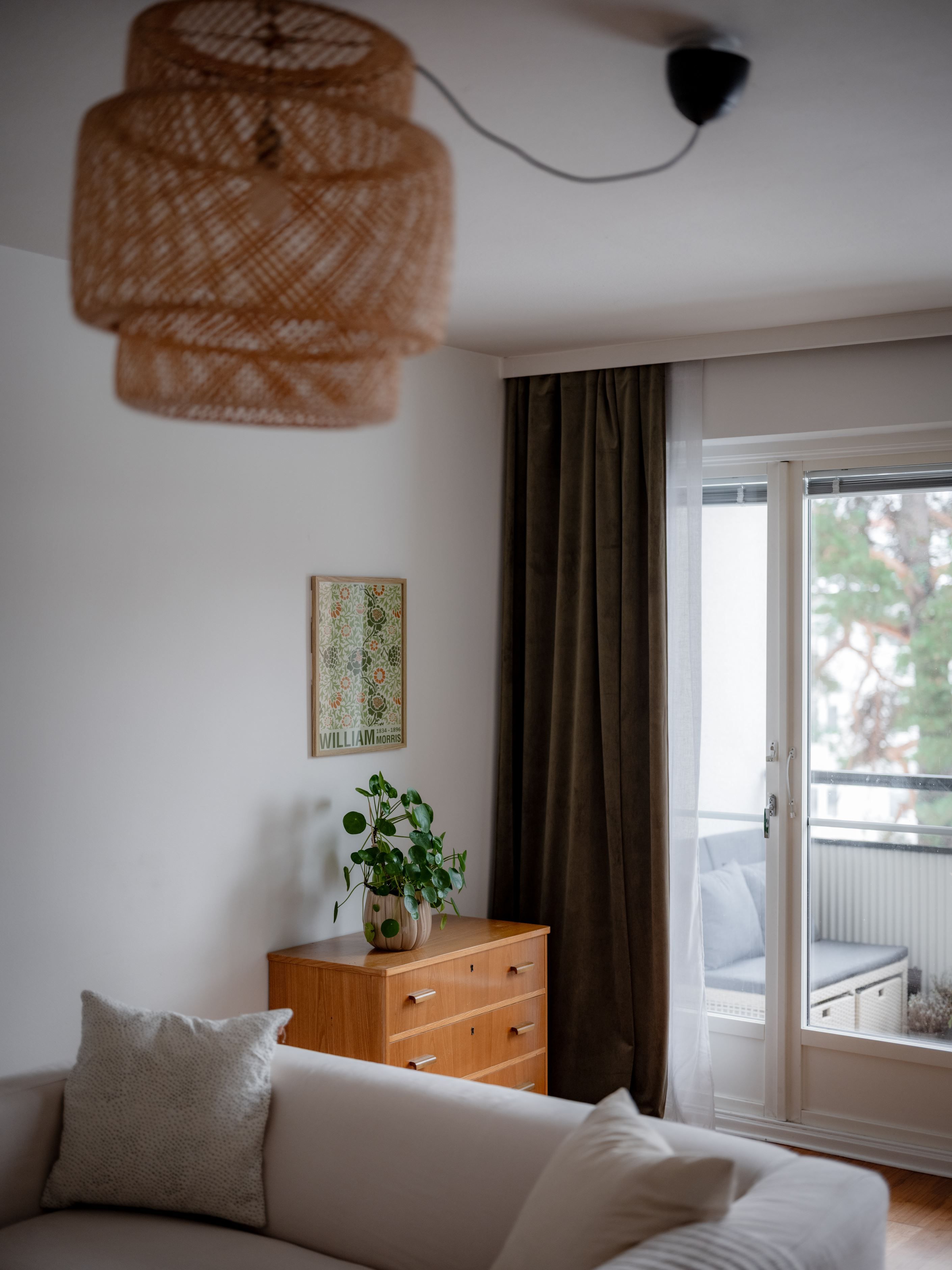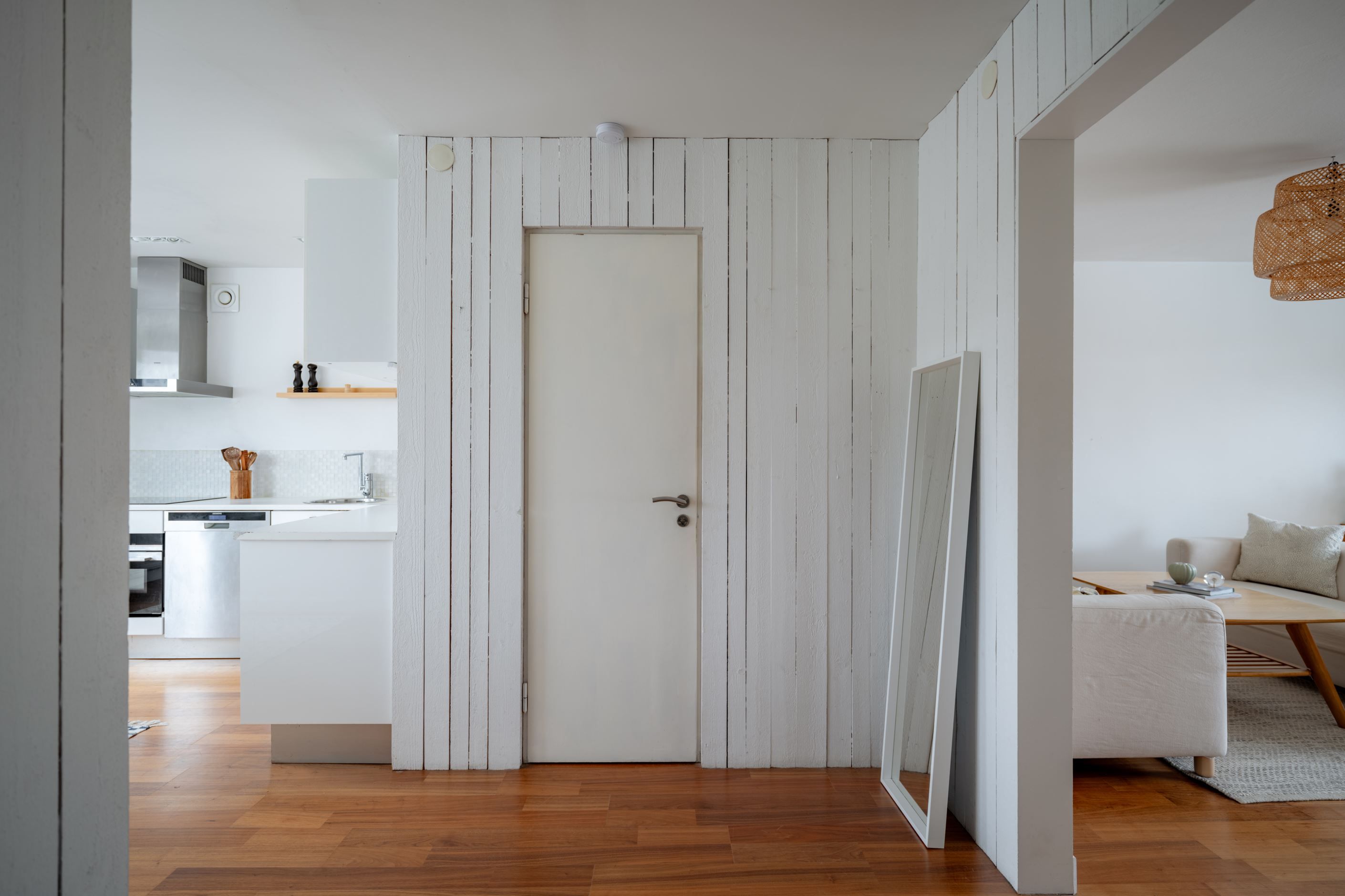 Bostaden är fint renoverad med eftertanke och en röd tråd. Här ligger genomgående vackra golv mot passande färgsättning.