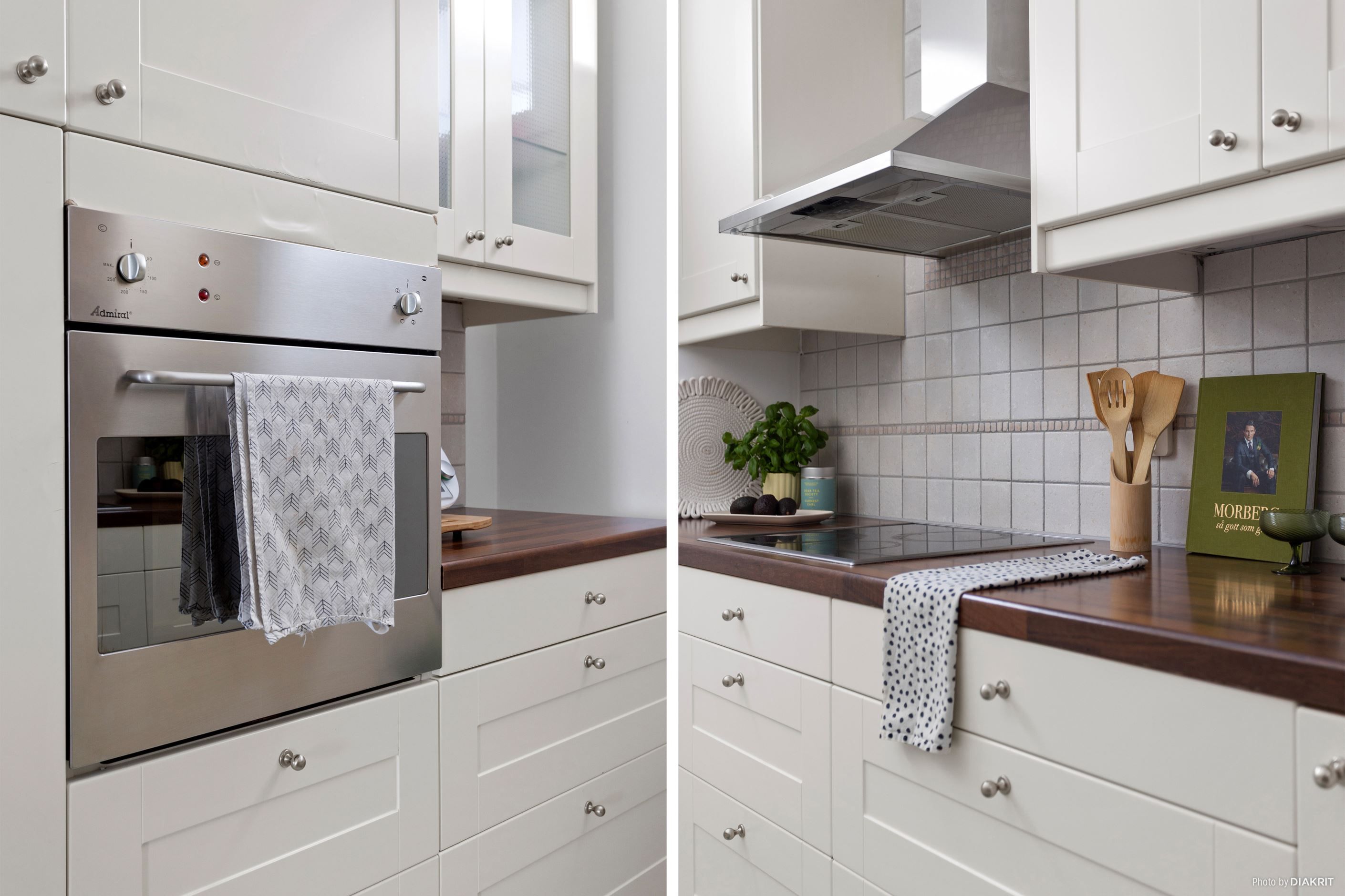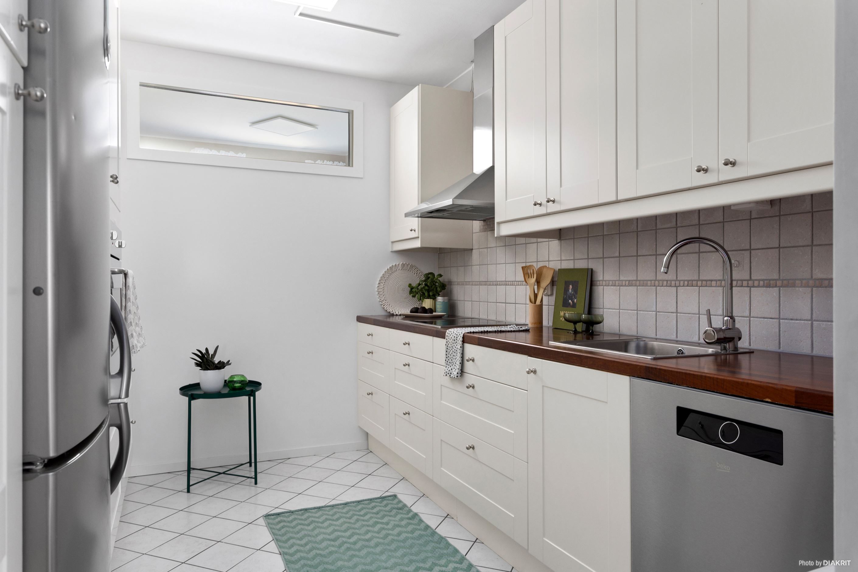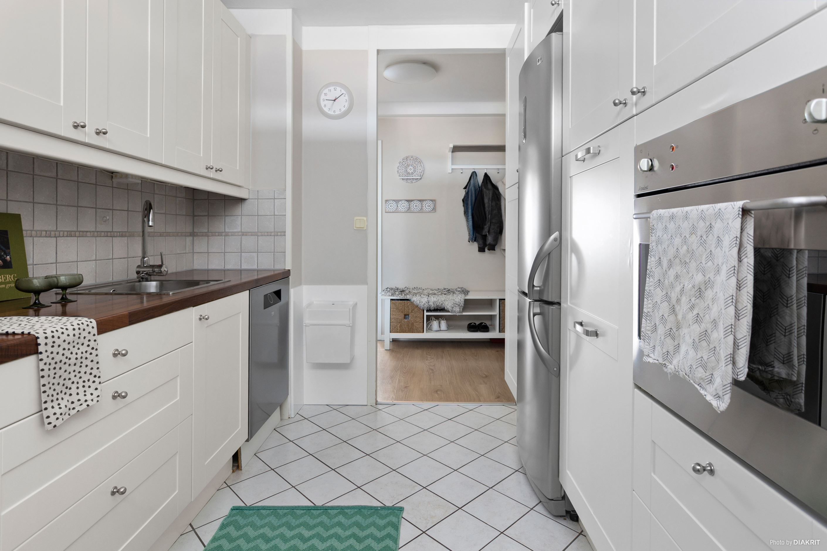 Köket är smakfullt inrett med vita luckor och en varm träbänkskiva som tillsammans skapar en hemtrevlig atmosfär. Här finns gott om arbetsyta samt full maskinell utrustning med diskmaskin, spishäll, ugn samt kyl och frys. Det mönstrade kaklet i kombination med det vita stengolvet ger köket en modern karaktär.