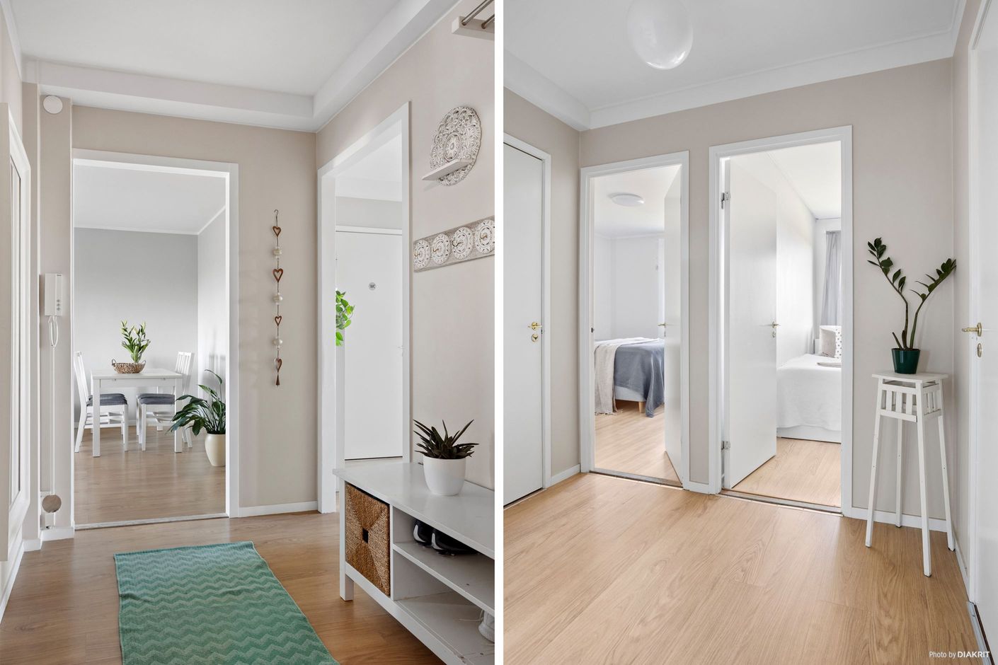 Redan i hallen möts du av en inbjudande känsla med stilrent parkettgolv samt praktiska lösningar i form av hatthylla och plats för sittmöbel.
