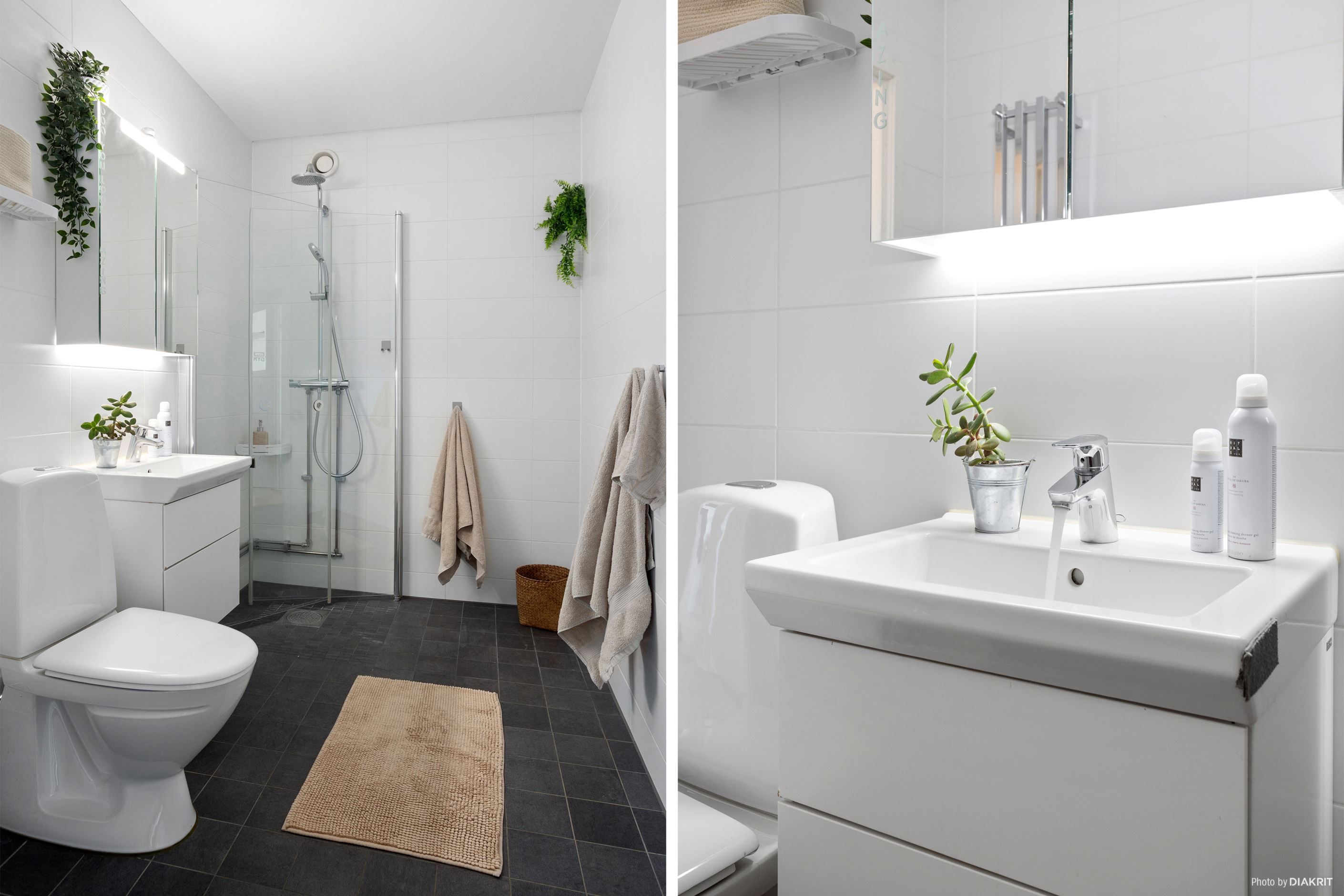 Det helkaklade badrummet är fräscht och funktionellt med WC, handfat med kommod samt dusch med glasdörrar.