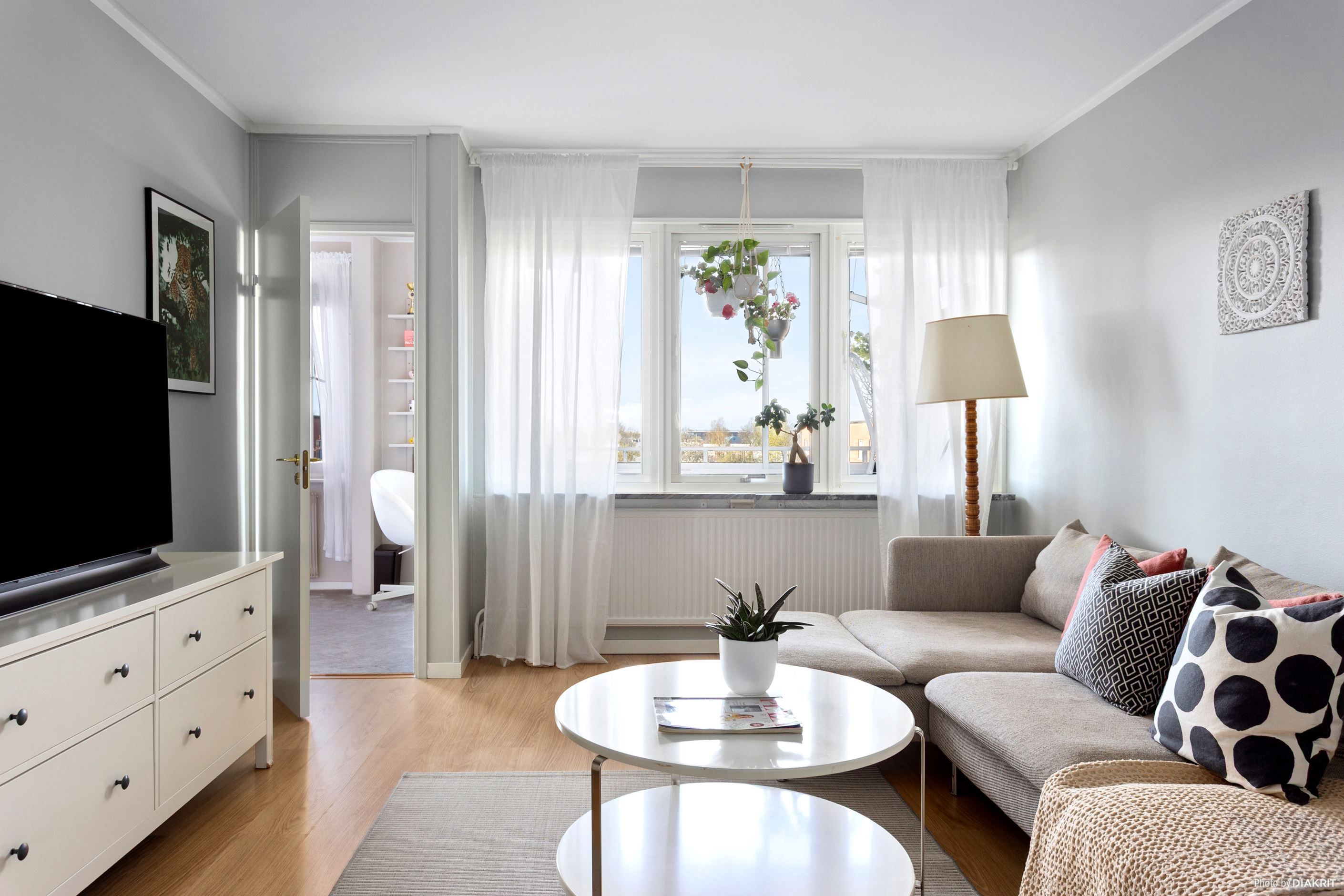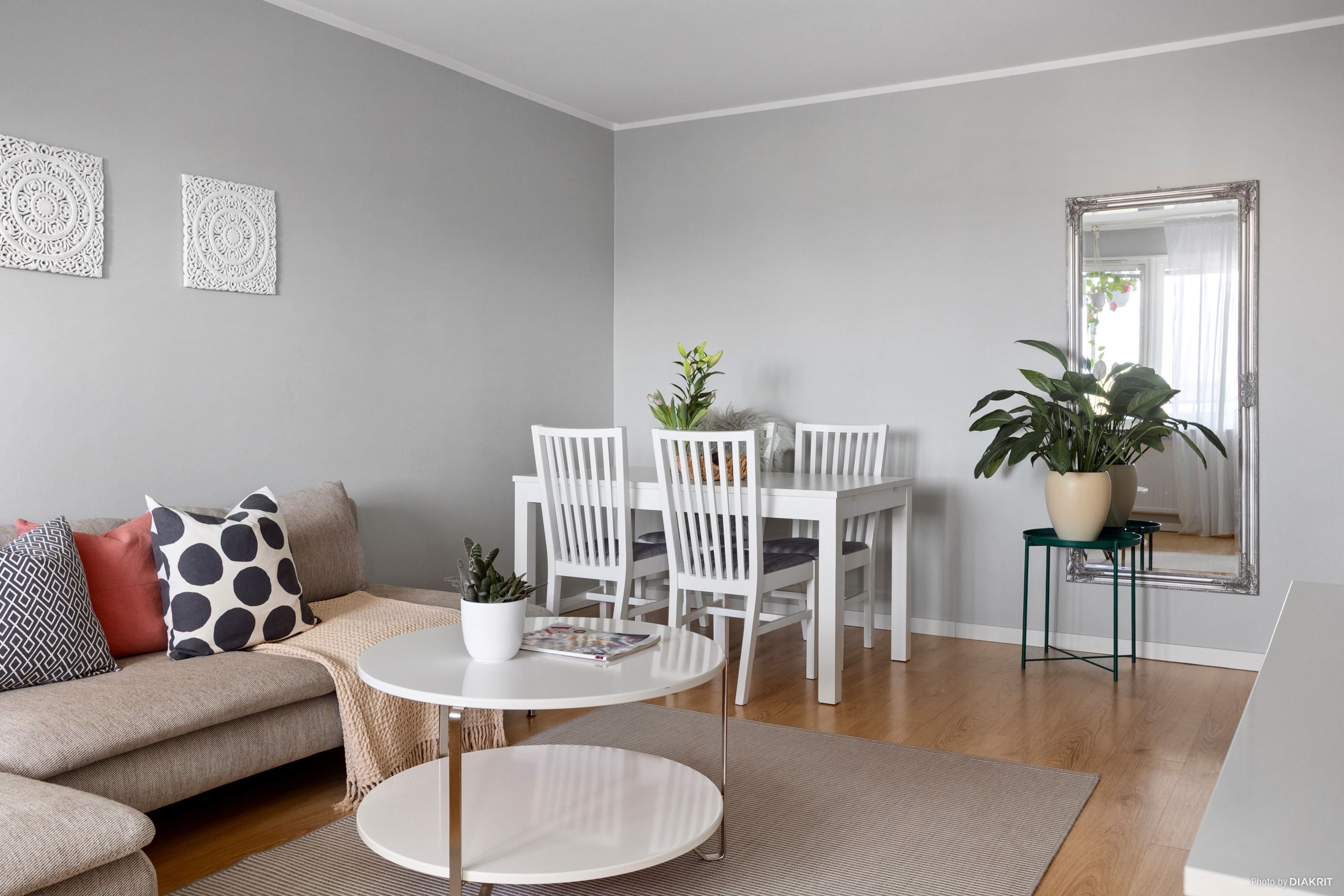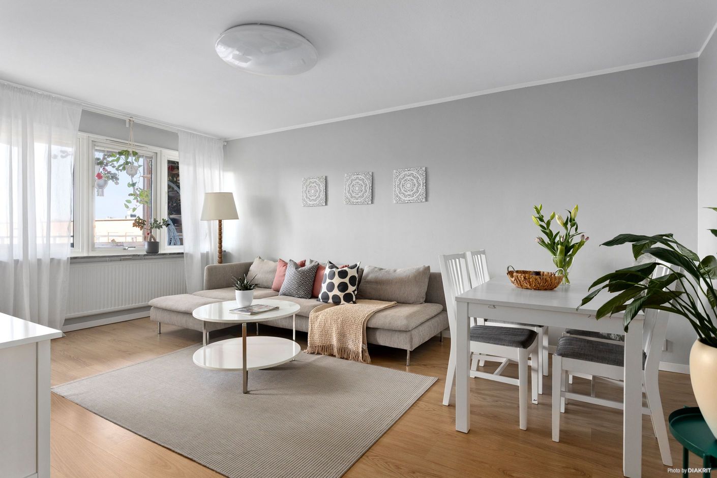 Vardagsrummet är rymligt och lättmöblerat med plats för både soffgrupp och matplats, vilket gör det till en naturlig samlingspunkt i hemmet. Det genomgående parkettgolvet bidrar till en enhetlig och stilren helhet.