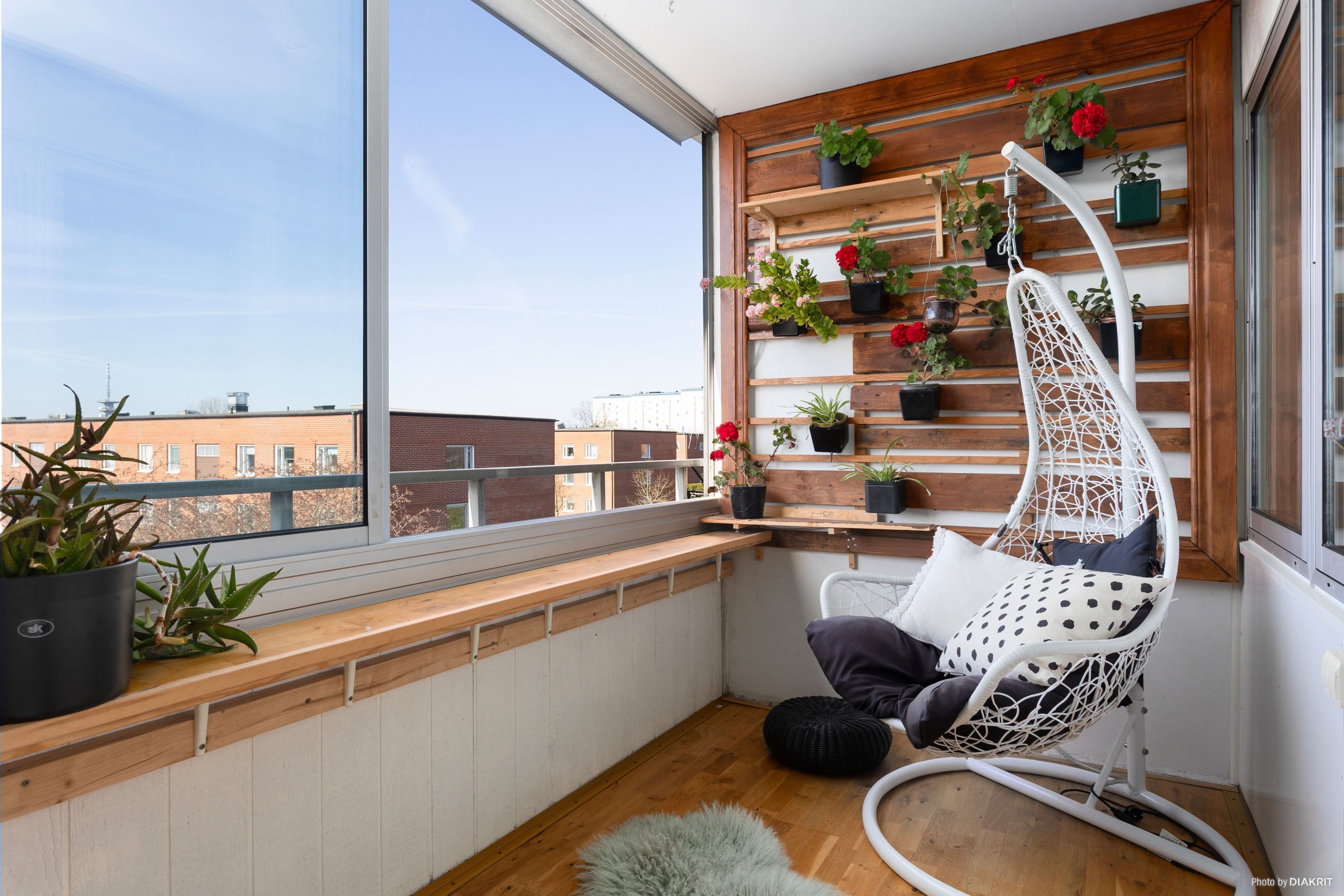 Den inglasade balkongen blir en förlängning av bostaden och erbjuder en härlig plats att njuta av från tidig vår till sen höst.