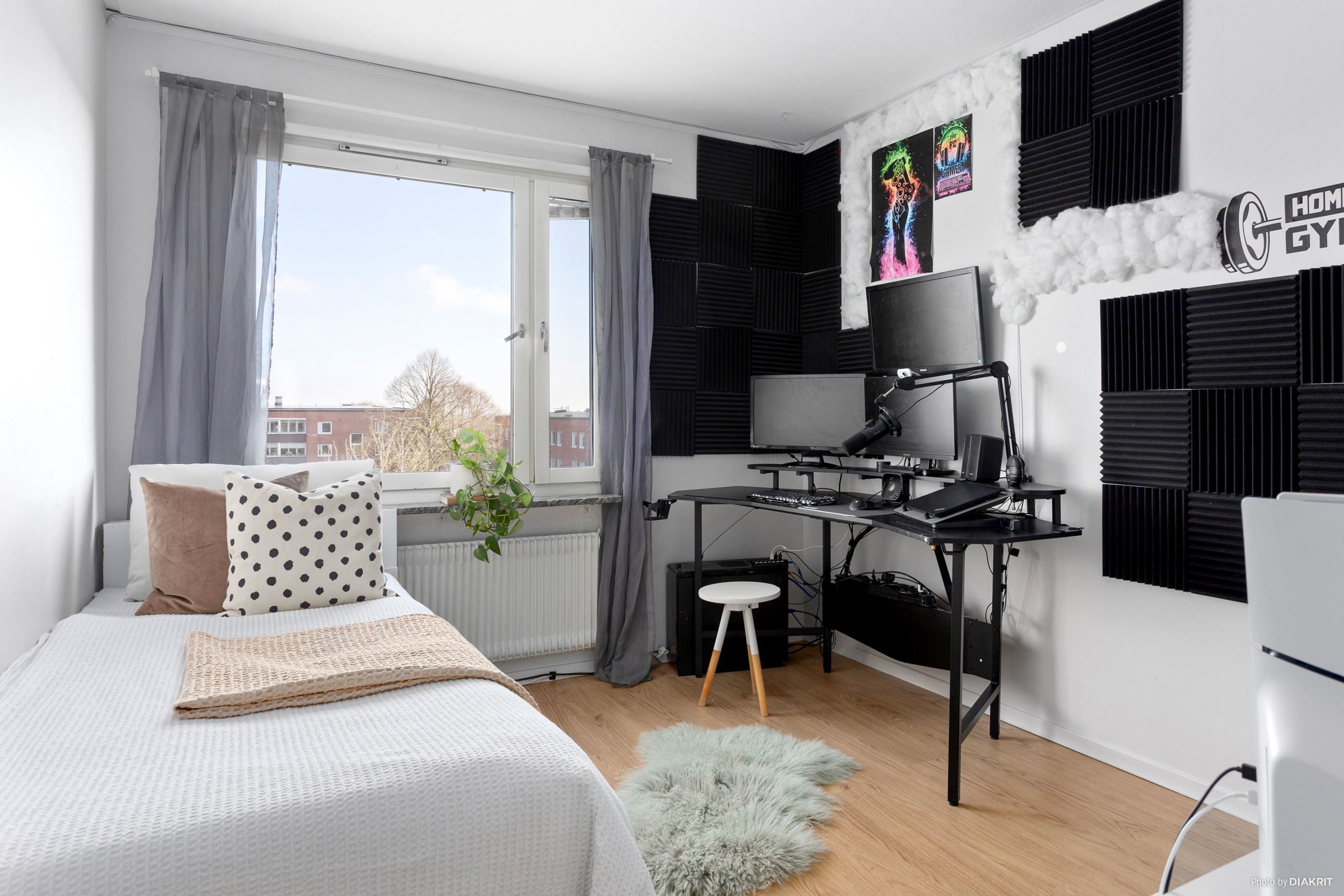 Bostaden erbjuder tre välplanerade rum som kan disponeras efter behov. Ett av sovrummen har heltäckningsmatta och direkt utgång till den inglasade balkongen, vilket ger en lugn och avkopplande miljö. De övriga rummen har parkettgolv och passar utmärkt som sovrum, barnrum eller hemmakontor.