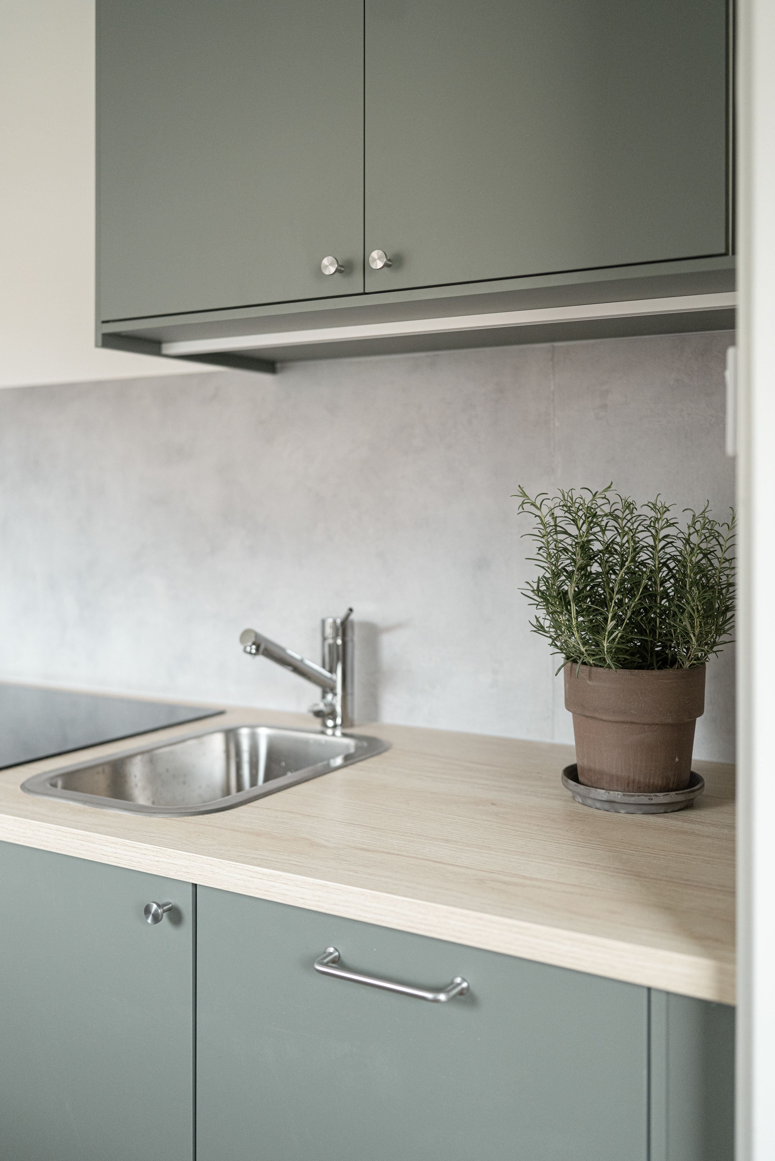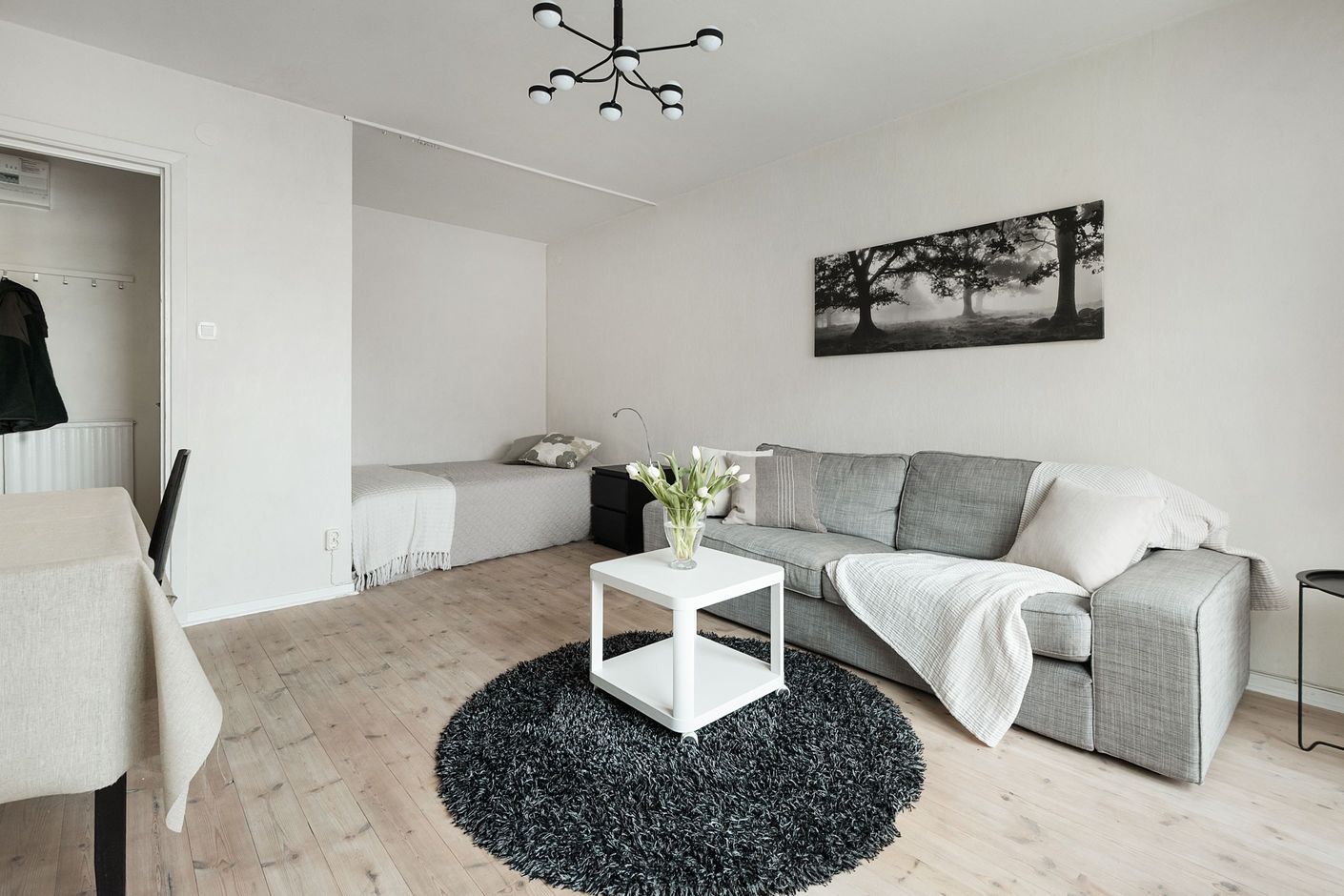 Den praktiska sovalkoven skapar en naturlig avskildhet mellan sov- och sällskapsdel, och den franska balkongen bidrar med både ljus och rymd. Köksvrån är funktionell med trägolv, målade väggar och kyl/frys, perfekt för vardagens behov.