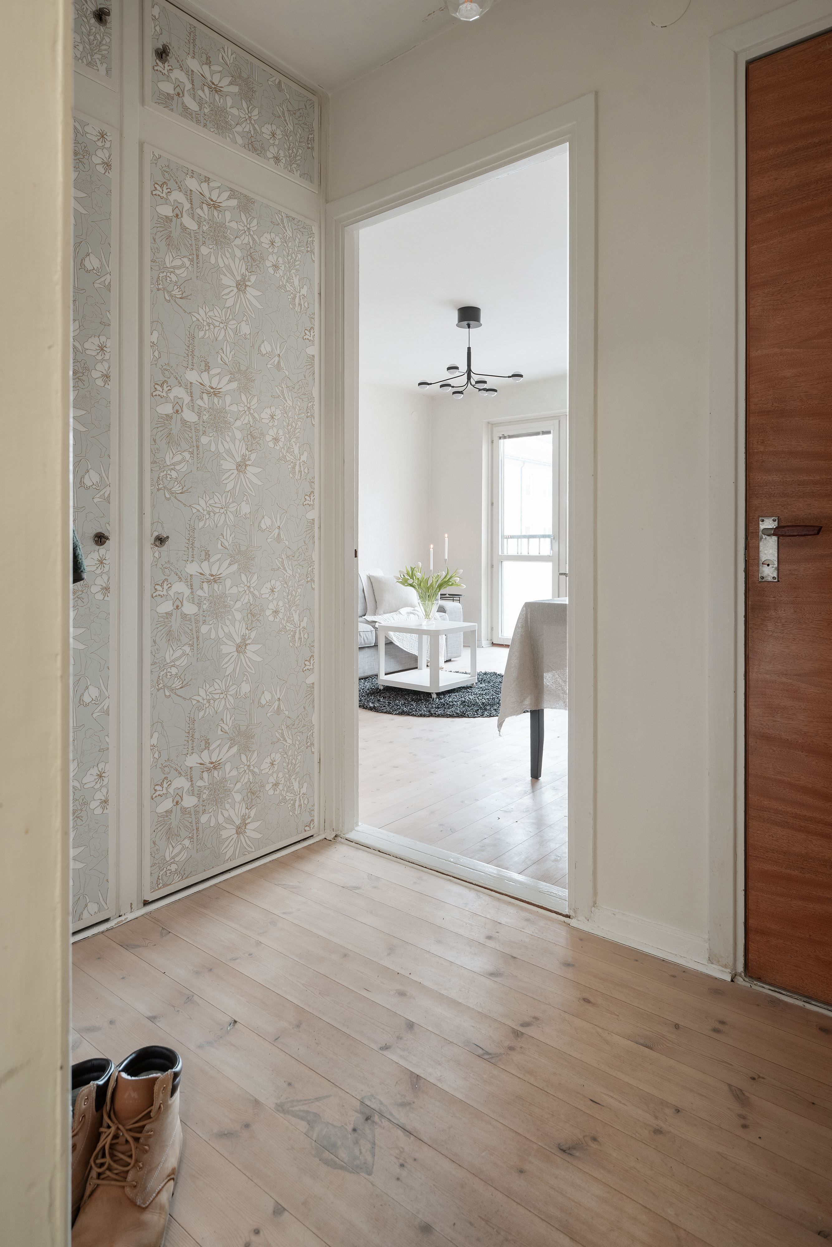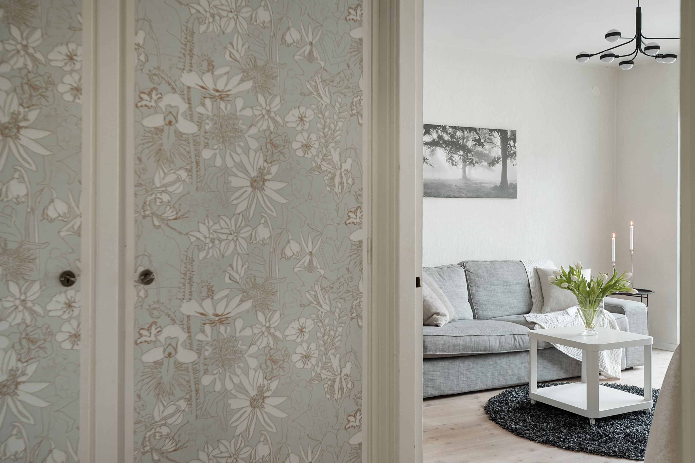 Allrummet är ljust och luftigt med trägolv och tapetserade väggar.
