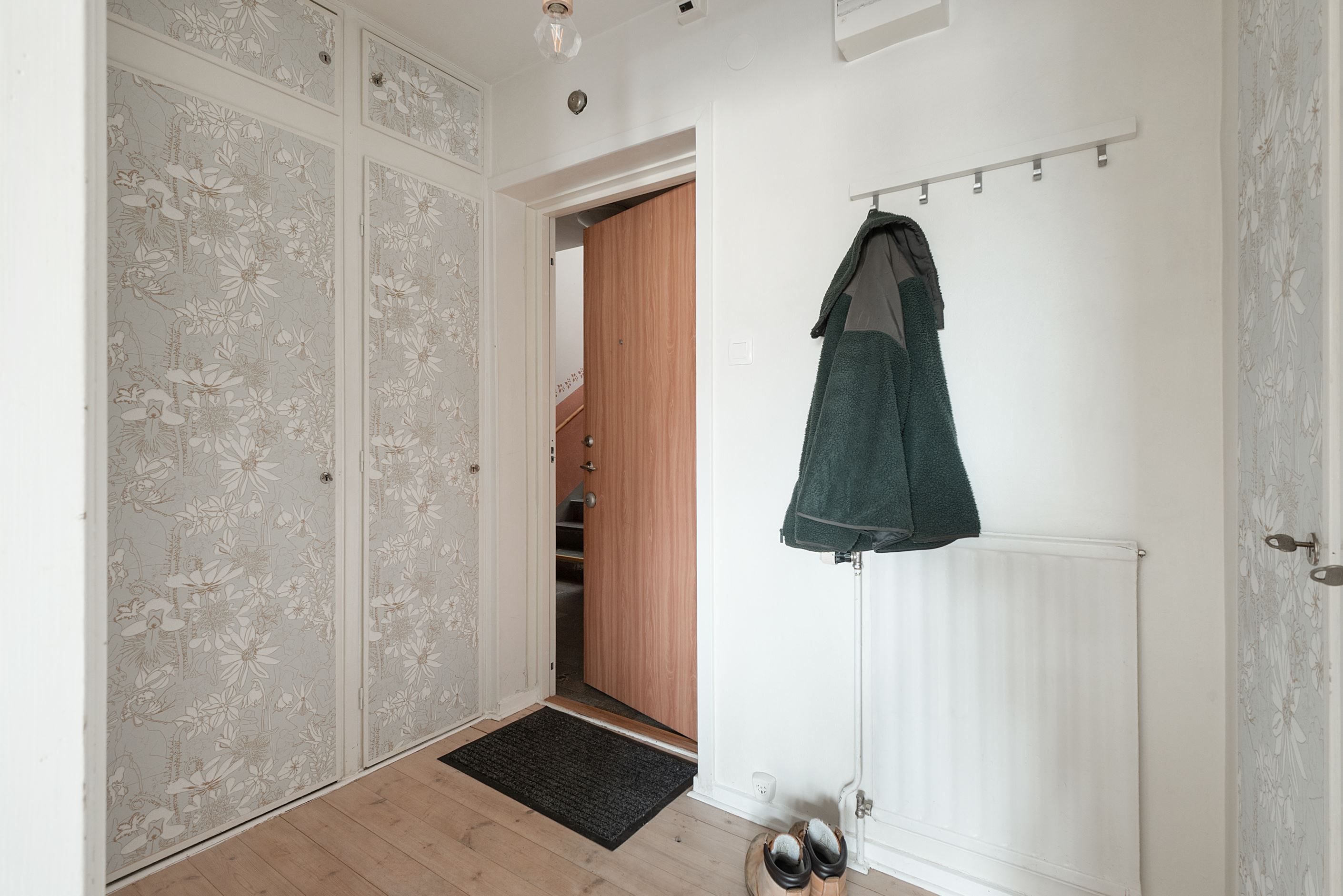 Redan i hallen möts du av ett ombonat intryck med trägolv och generös förvaring i fyra garderober. Det fräscha WC/duschutrymmet är utrustat med handfat tillsammans med kommod och spegelskåp.