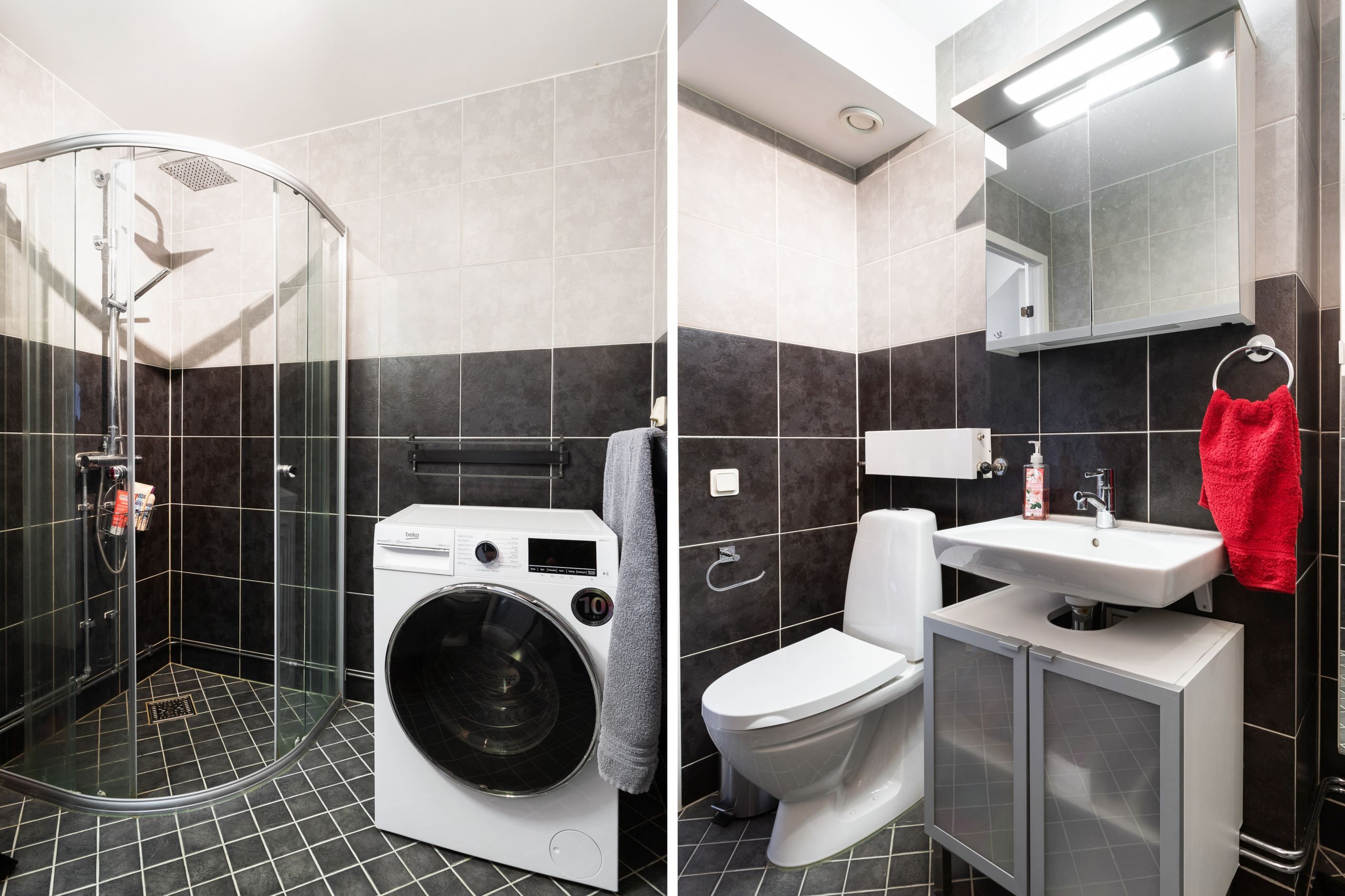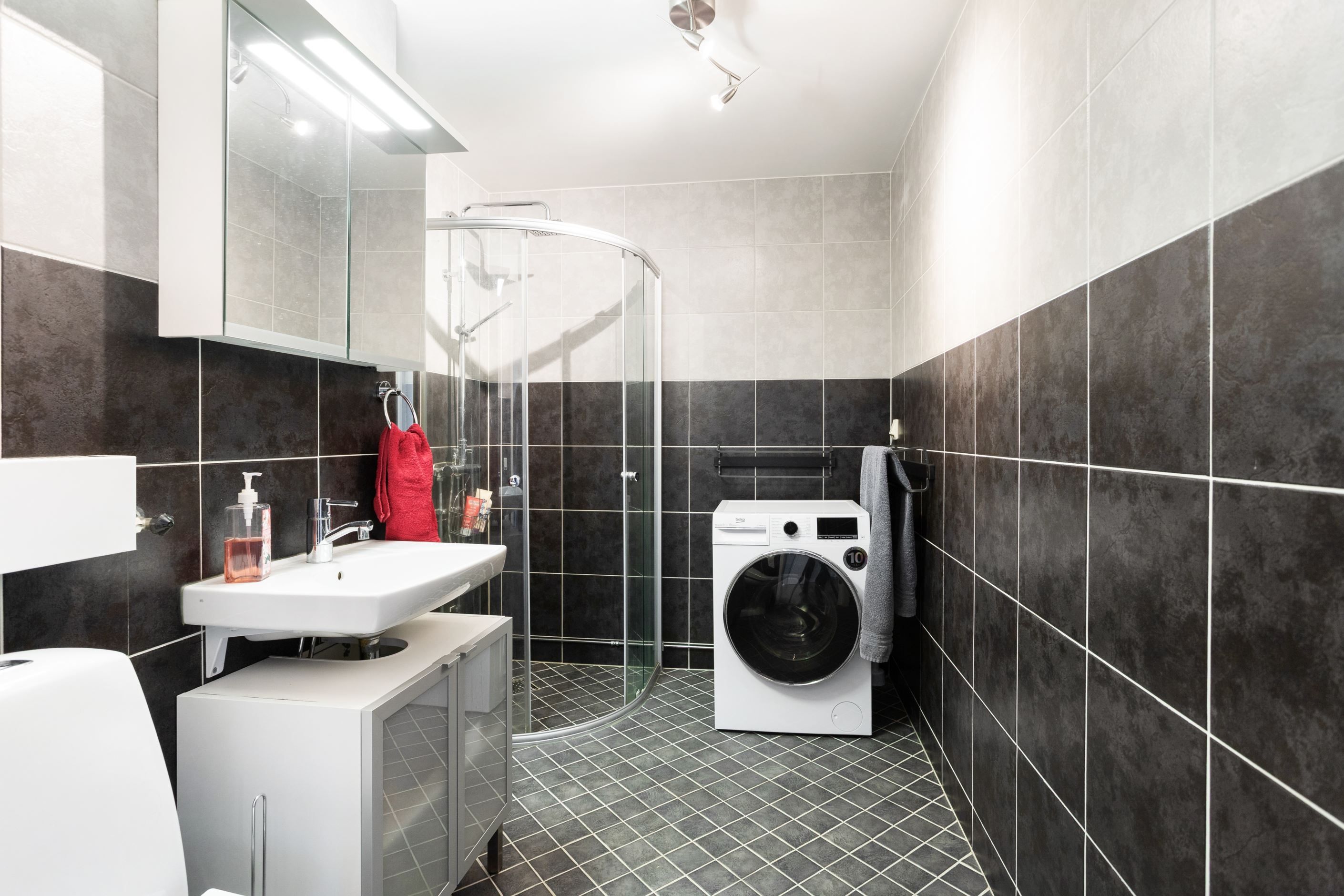 Badrummet är helkaklat och utrustat med bl.a. vikbara duschväggar och uttag för tvättmaskin.