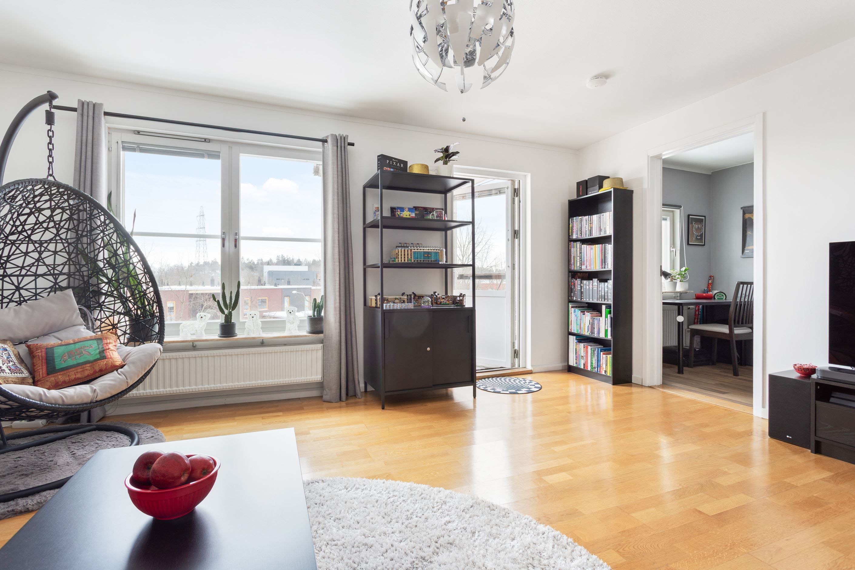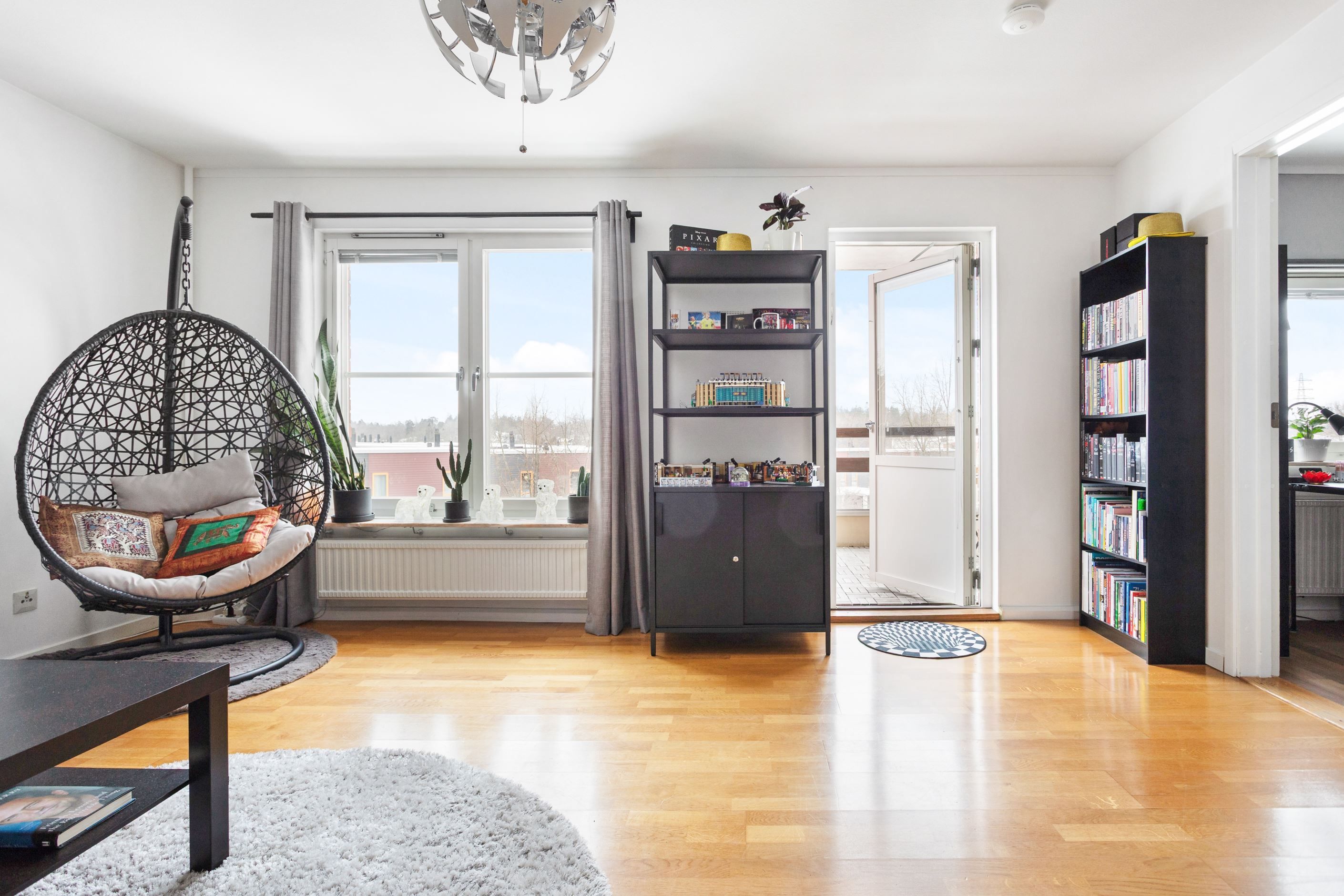 Vardagsrummet rymmer en komplett soffgrupp och bjuder på goda ljusinsläpp från insynsskyddade fönster. Dessutom finns en stor balkong i ett fritt sydvästläge, med sol större delen av dagen och plats för en rejäl utemöbelgrupp.