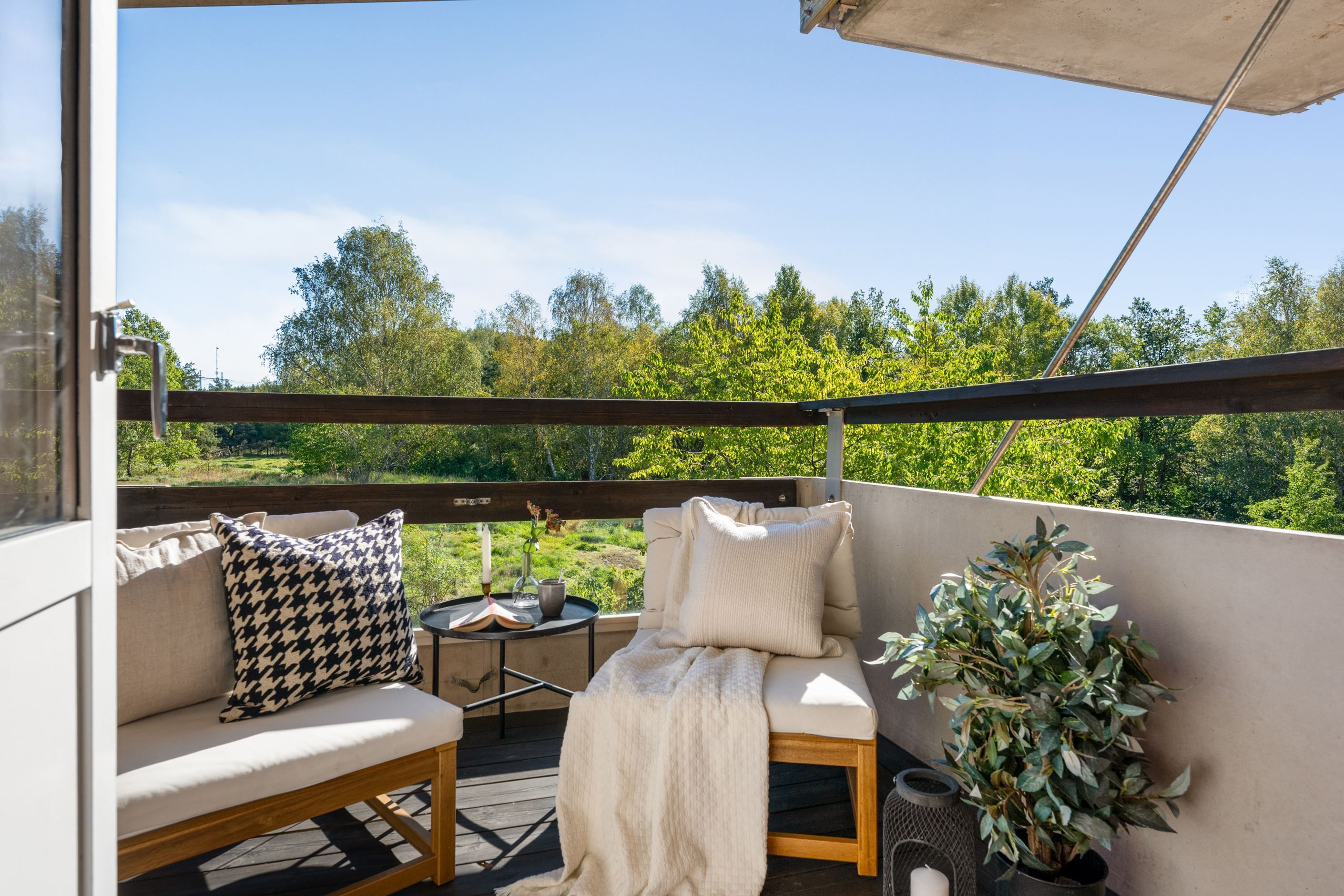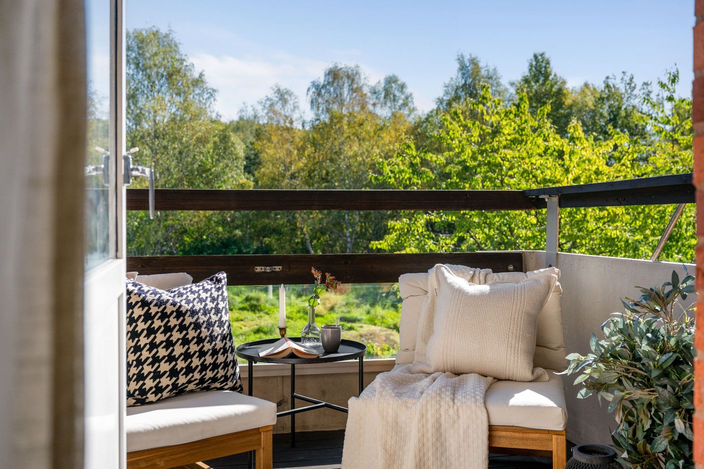 Från det ljusa och lättmöblerade vardagsrummet nås bostadens trevliga balkong som bjuder på en lummig utsikt ihop med ett läge i sydost för härliga solstunder från morgon till tidig eftermiddag.