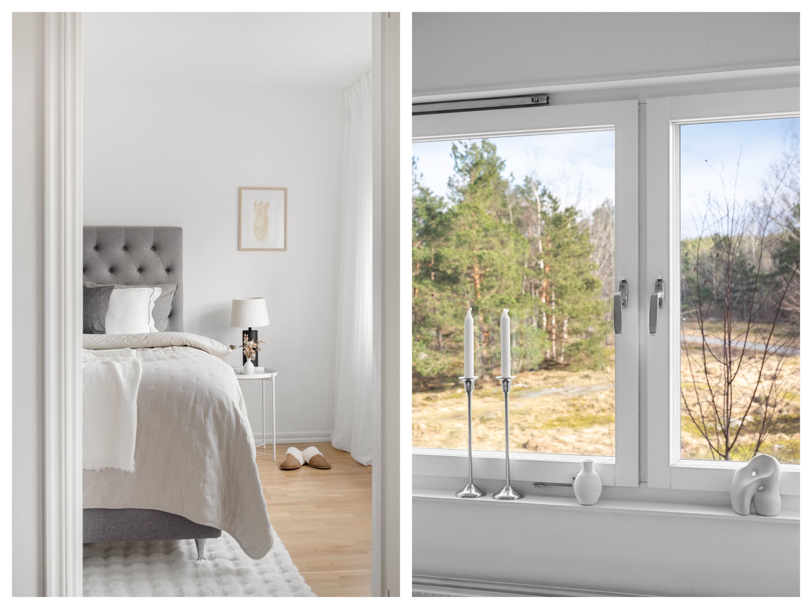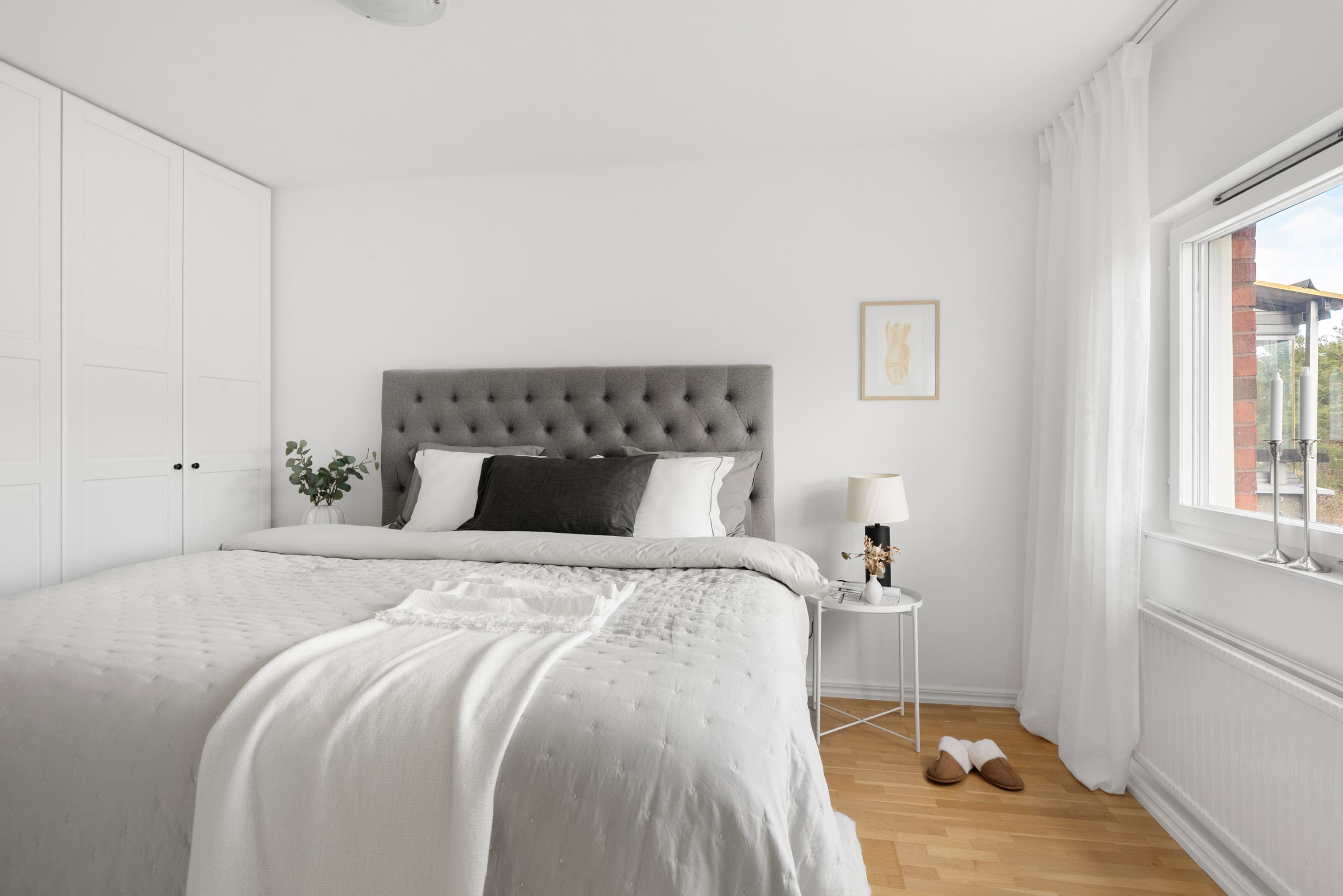 Bostaden erbjuder ett rymligt sovrum med plats för dubbelsäng och garderober. Därutöver finns en praktisk klädkammare för ytterligare förvaringsmöjligheter.
