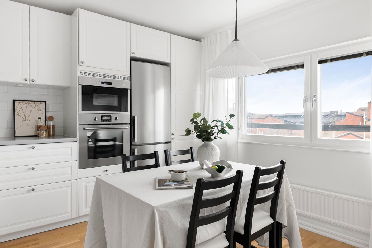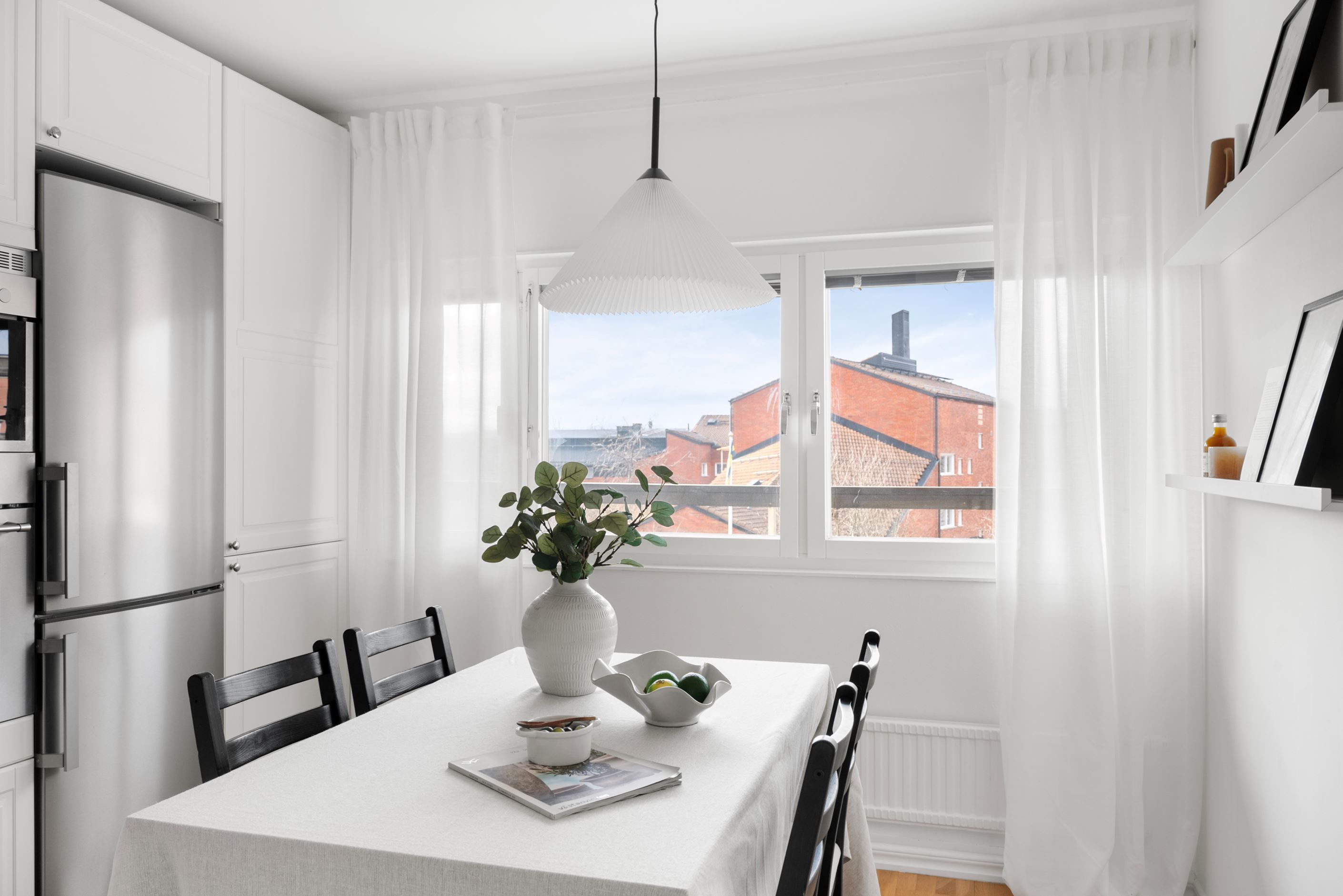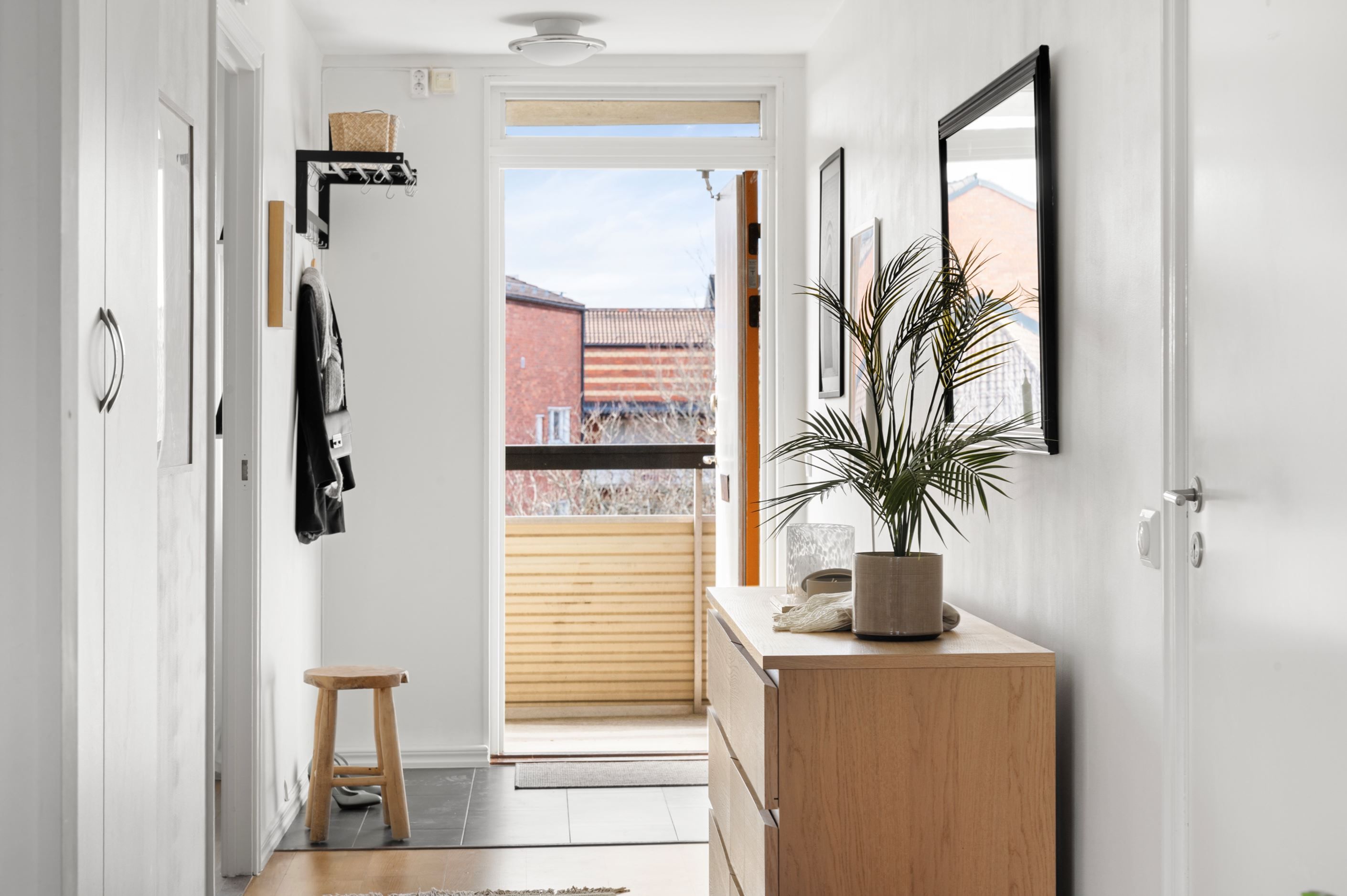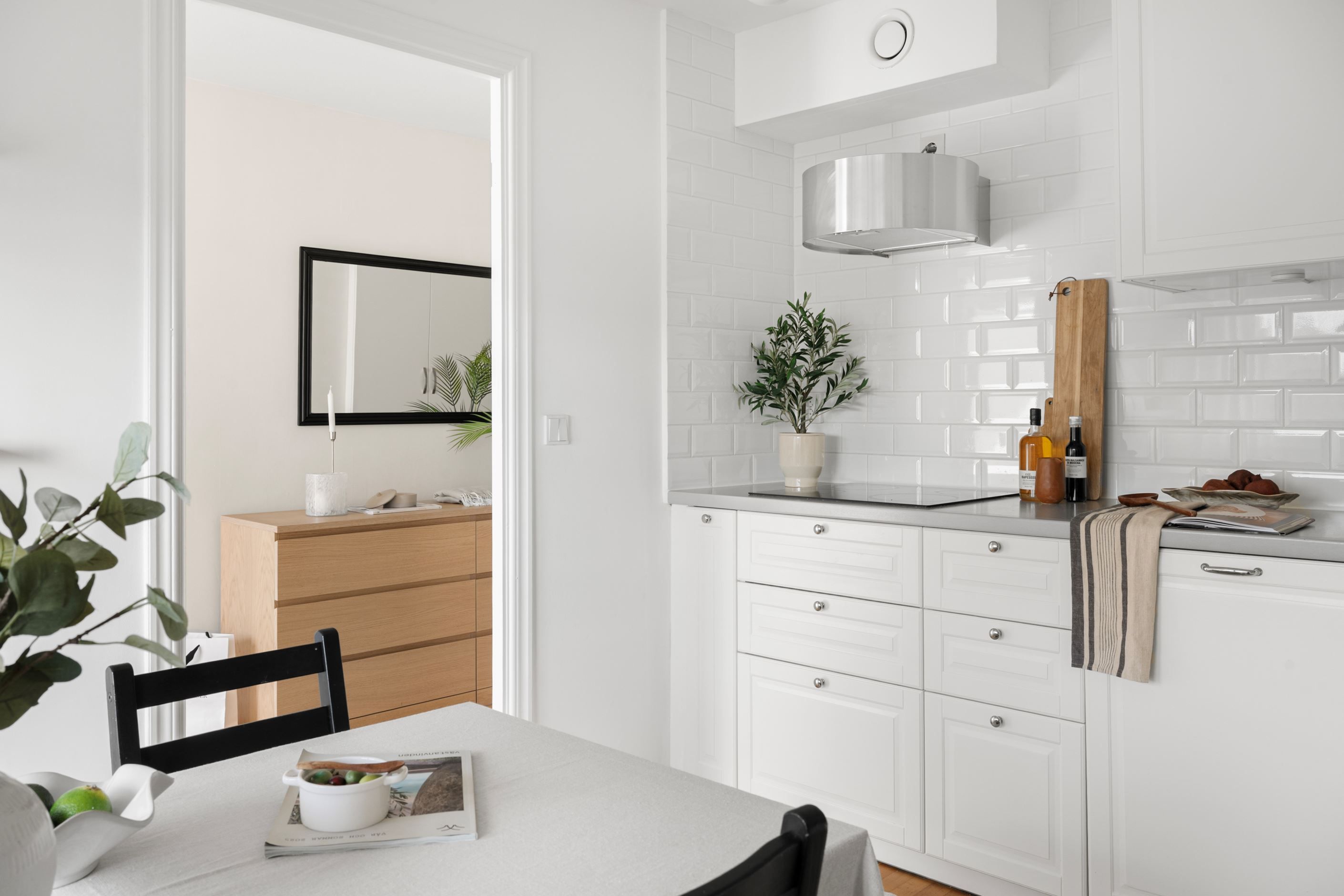 Redan vid hallen välkomnas man av den välplanerade planlösningen med ett genomgående ljusflöde från bostadens balkong. Här finner du ett stilrent och komplett utrustat kök med gott om både arbetsytor och förvaring samt plats för matbord invid fönsterparti med utsikt mot innergården. I anslutning ligger även det helkaklade och stilrena badrummet.