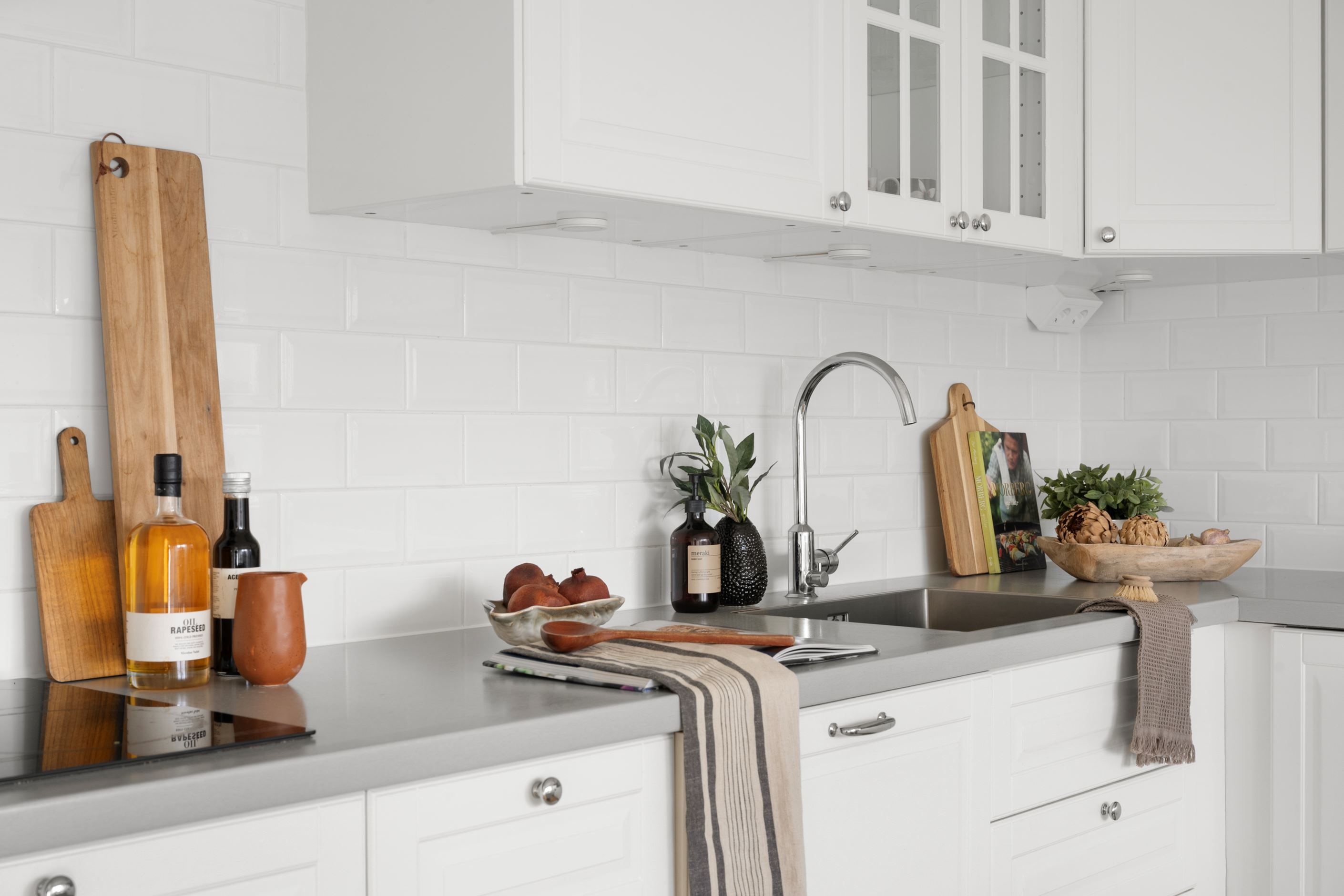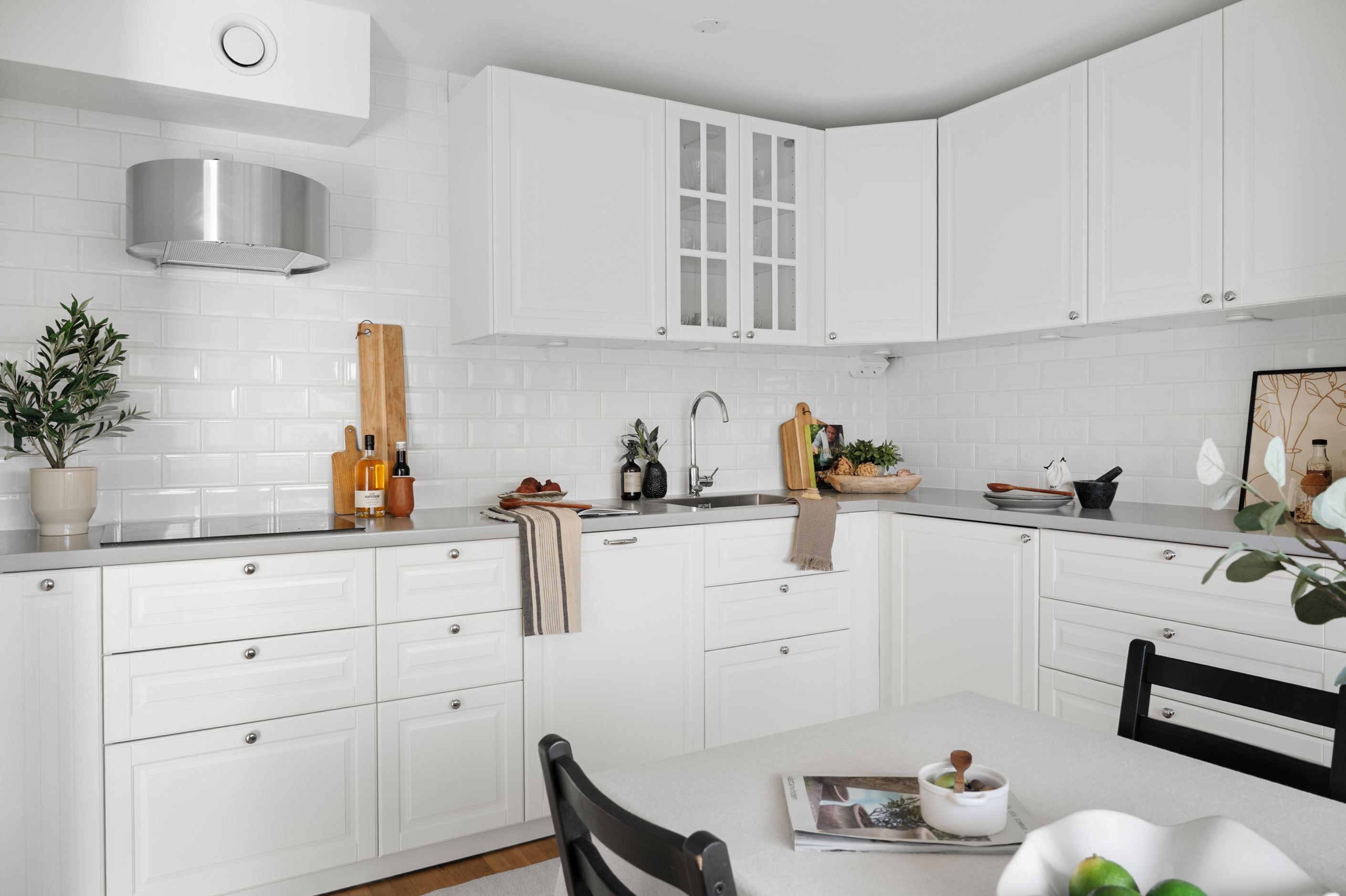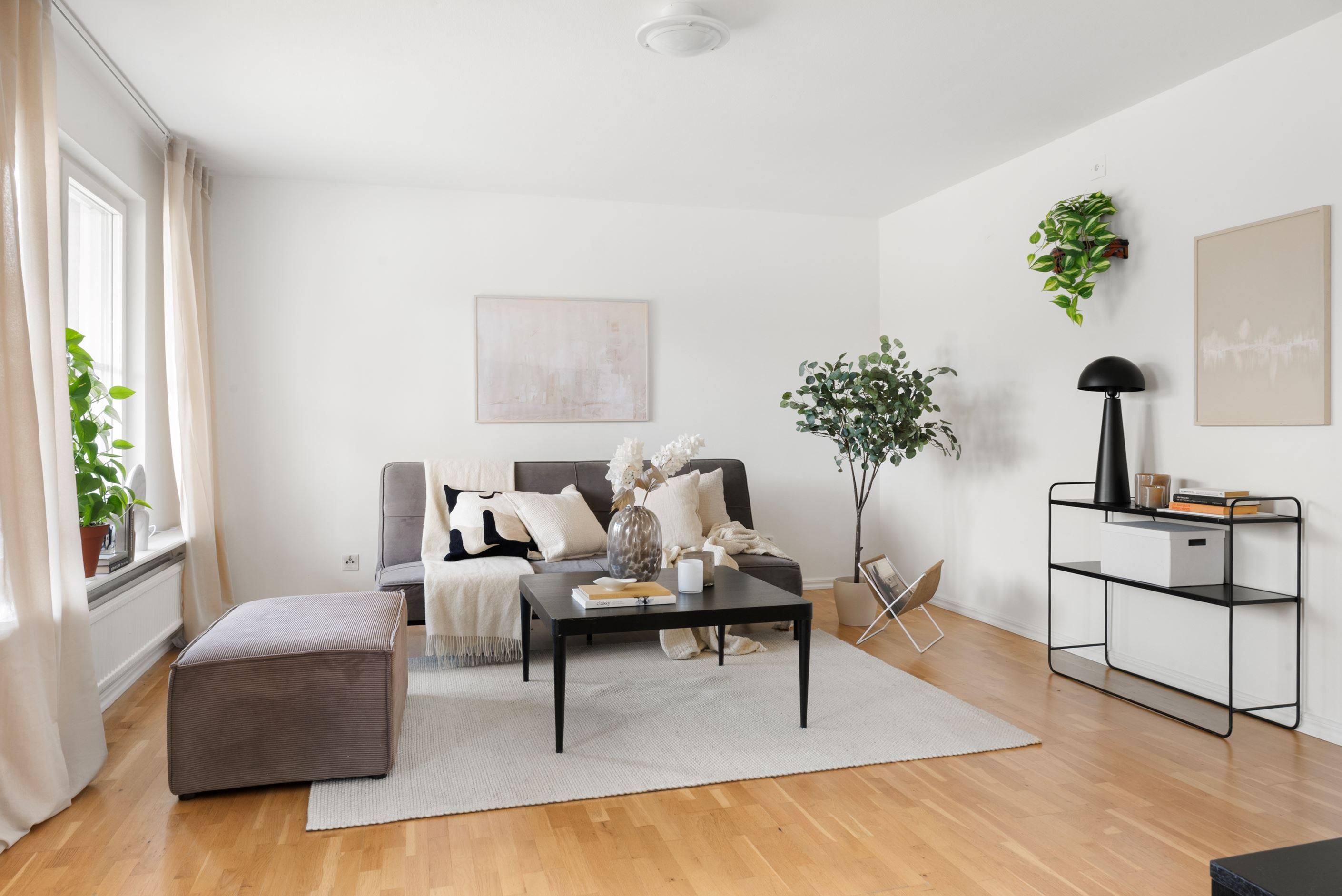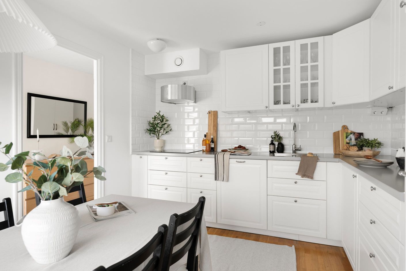 Redan vid hallen välkomnas man av den välplanerade planlösningen med ett genomgående ljusflöde från bostadens balkong. Här finner du ett stilrent och komplett utrustat kök med gott om både arbetsytor och förvaring samt plats för matbord invid fönsterparti med utsikt mot innergården. I anslutning ligger även det helkaklade och stilrena badrummet.